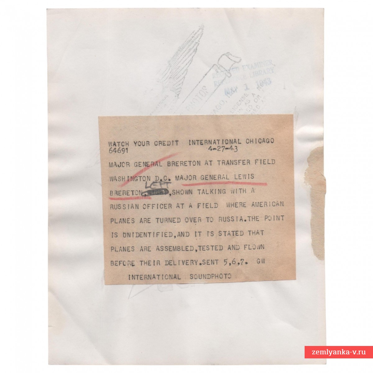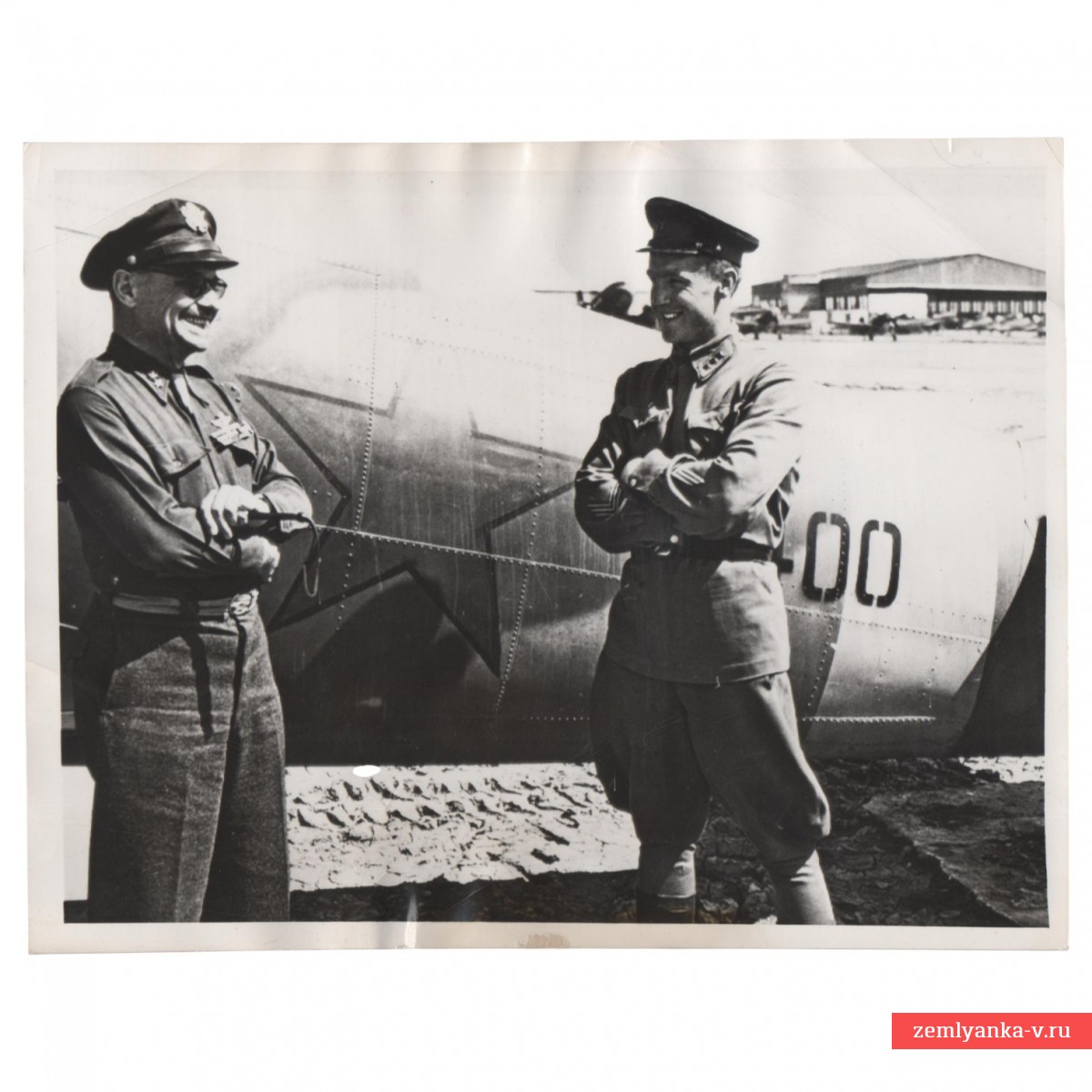 Оригинальной пресс-снимок в отличном коллекционном состоянии. На фото американский генерал стоит рядом с советским старшим лейтенантом. Размер 170*215 мм. Небольшие замятости бумаги. Гарантия подлинности.