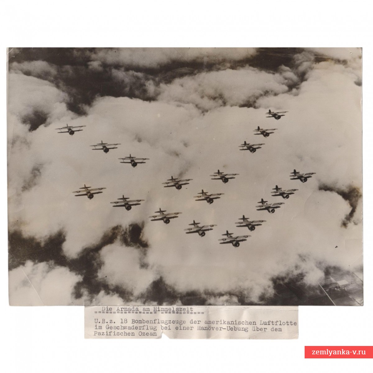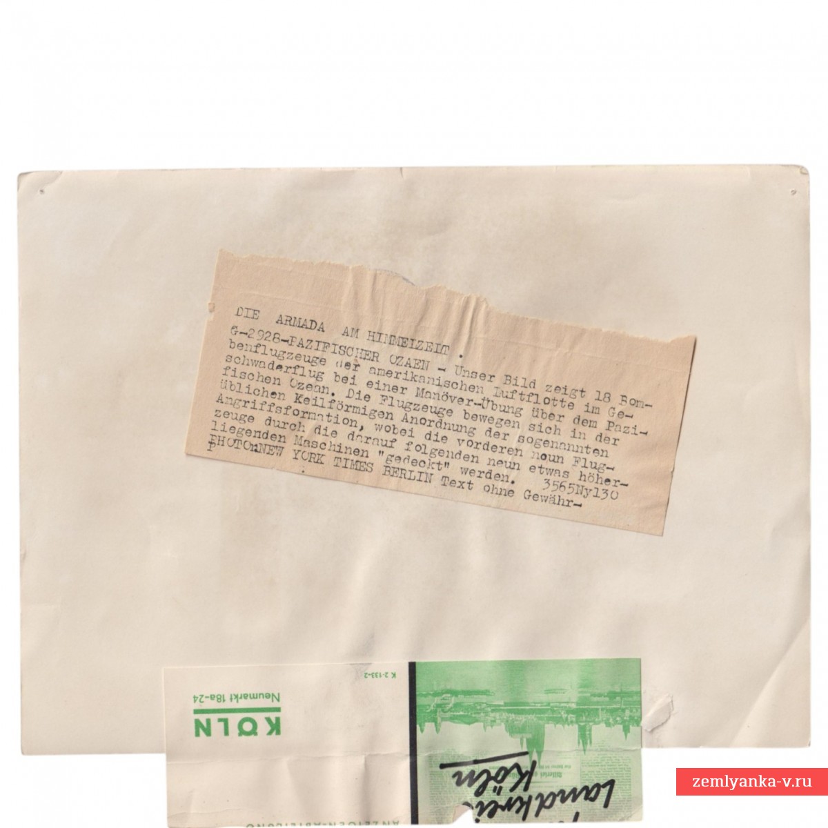 Оригинальный большеформатный снимок в очень хорошем состоянии. Заголовок на бирке агентства сзади гласит: «DIE ARMADA AM HIMMELZELT» ( «Армада на небосводе»). Согласно тексту, на самой фотографии изображены 18 бомбардировщиков американского флота во время маневров над Тихим океаном. В описании детально указано построение самолетов: они движутся «клином» (Keilförmigen Anordnung), при этом передние девять машин летят чуть выше, чтобы «прикрывать» следующие за ними девять самолетов. Текст был подготовлен бюро New York Times Berlin. Такие фотографии рассылались в газеты и журналы для публикации новостных материалов. Размеры: 24Х18 см. Редкий снимок. Гарантия подлинности.