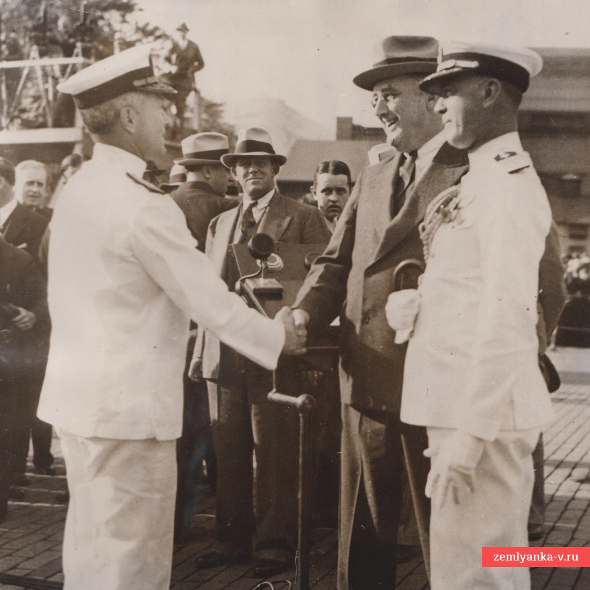 Оригинальный снимок, на котором изображен президент США Франклин Рузвельт, приветствующий адмирала Бэрда в Вашингтоне. Агентство «Photo New York Times Berlin». Адмирал вернулся после своей «героической экспедиции в Антарктику». На бирке агентства упоминается, что в Вашингтоне по этому случаю был устроен триумфальный прием. Сверху прикреплены фрагменты немецкой газеты «Lokal-Anzeiger». В левом верхнем углу видна зеленая карточка, вероятно, почтовая или инвентарная. Номер в тексте (35516Rx+30) — это уникальный архивный номер негатива или снимка в фотоагентстве. Такие фотографии предназначались для публикации в прессе: на лицевой стороне было само изображение, а на обратной — подробная информация для редактора, чтобы тот мог составить подпись к фото в газете. Размеры: 18Х24 см. Редкий. Гарантия подлинности.