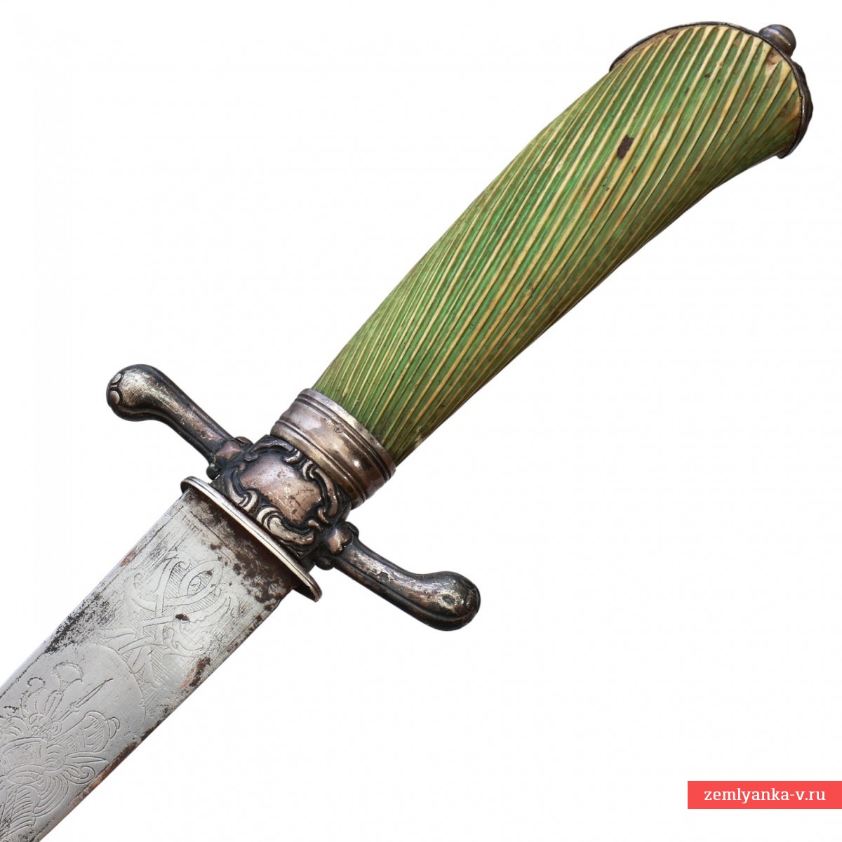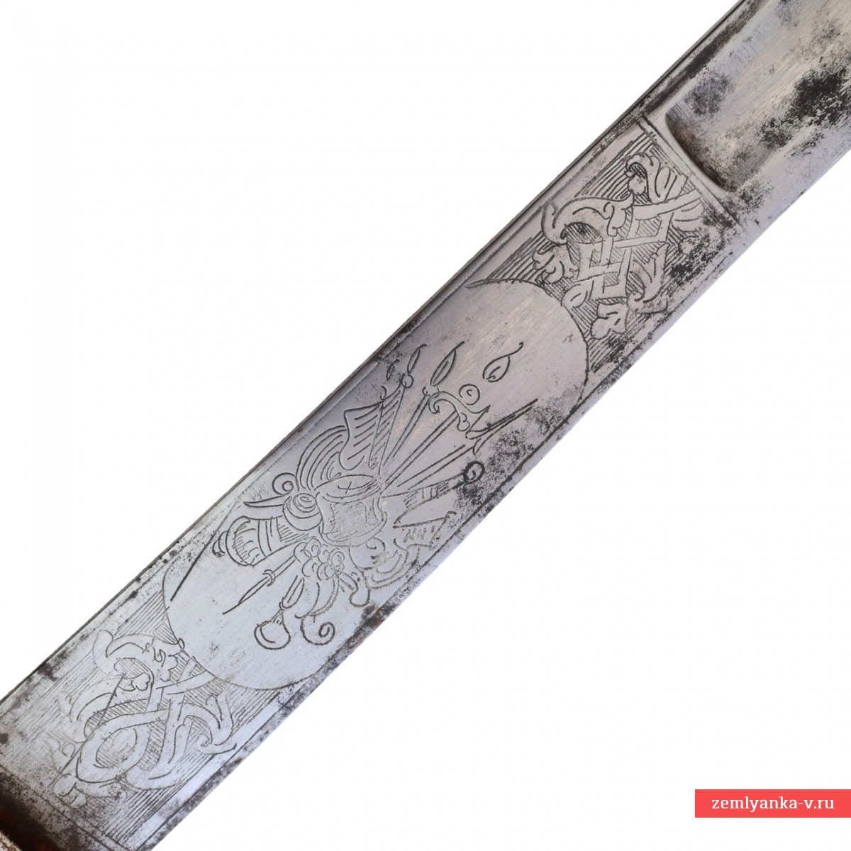 Клинок стальной, незначительно изогнутый, однолезвийный, с одним широким и одним узким долами с обеих сторон; боевой конец двулезвийный. Клинок украшен нанесенными иглой изображениями военных трофеев и барочными орнаментами. Эфес состоит из рукояти и небольшой крестовины. Рукоять костяная, фигурная, с наклонными бороздками, окрашена медным купоросом в зеленый цвет по моде того времени. У основания фигурная коническая серебряная (?) втулка. Навершие серебряное (?), С-образное, с пуговкой сверху, на которой расклёпан хвостовик клинка. Крестовина короткая, серебряная (?), с загнутыми в разные стороны окончаниями. Ножны кожаные, с серебряным (?) прибором, состоящим из устья со шпеньком и наконечника.