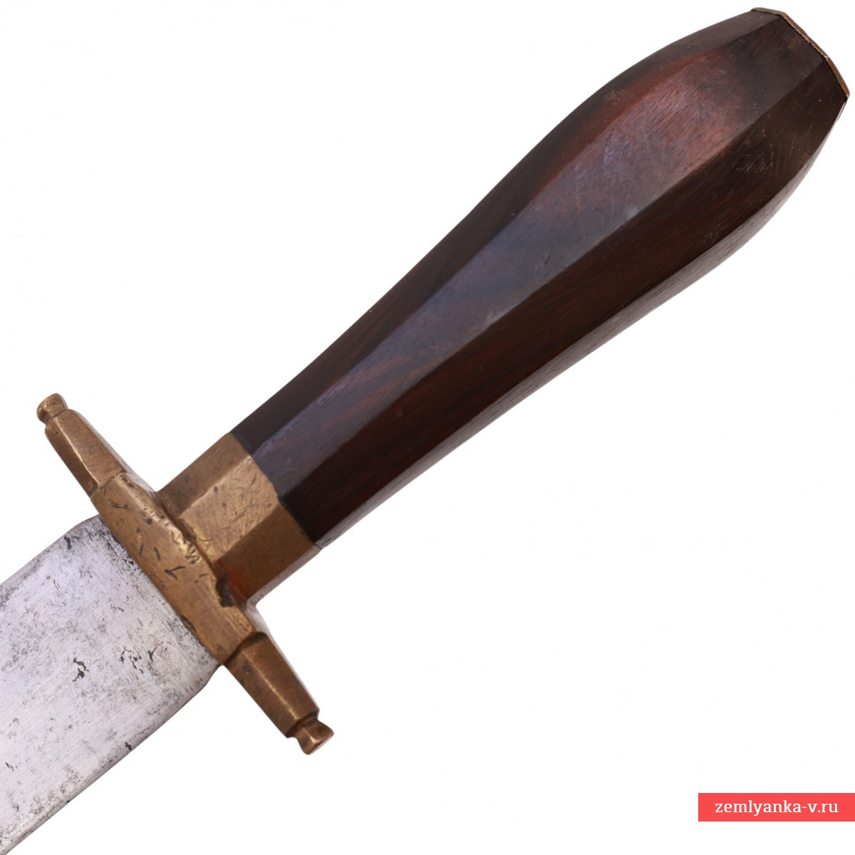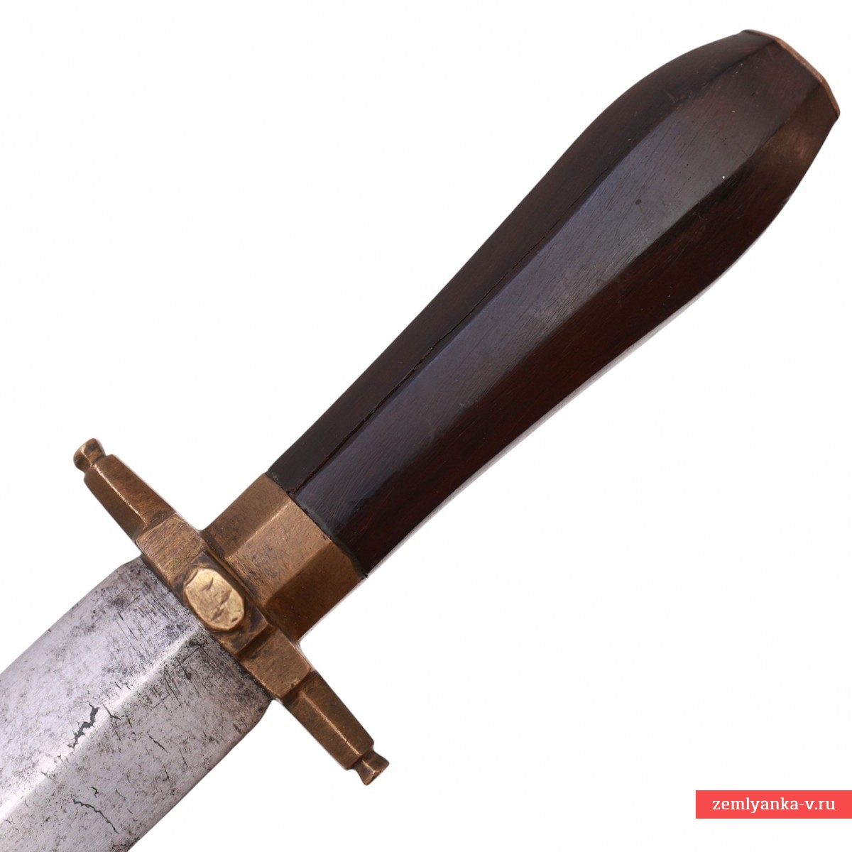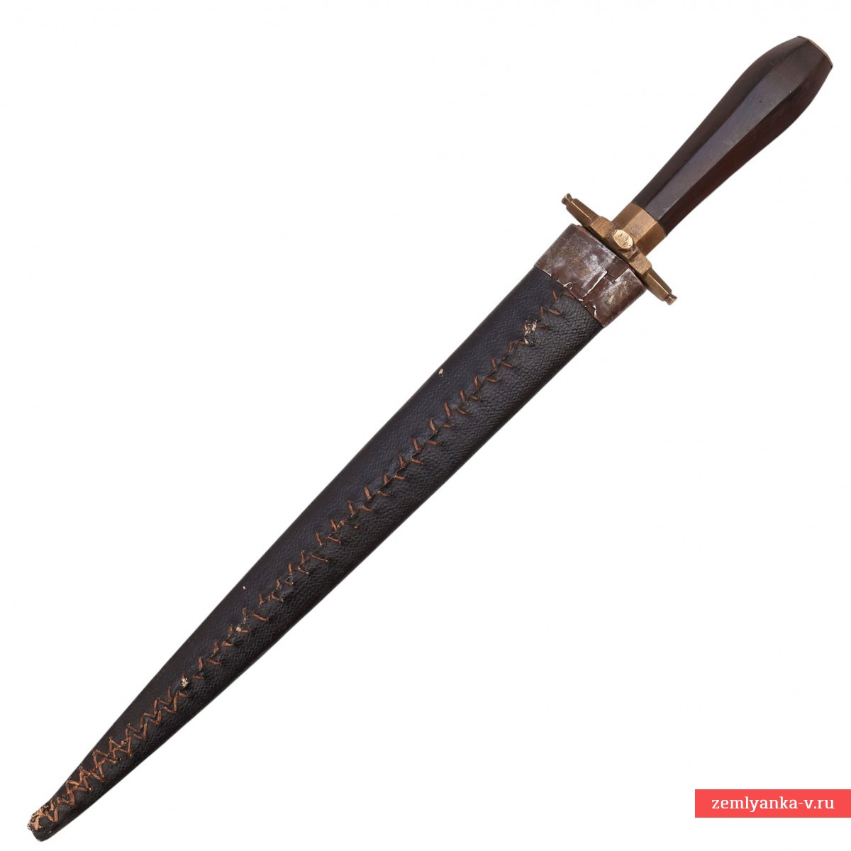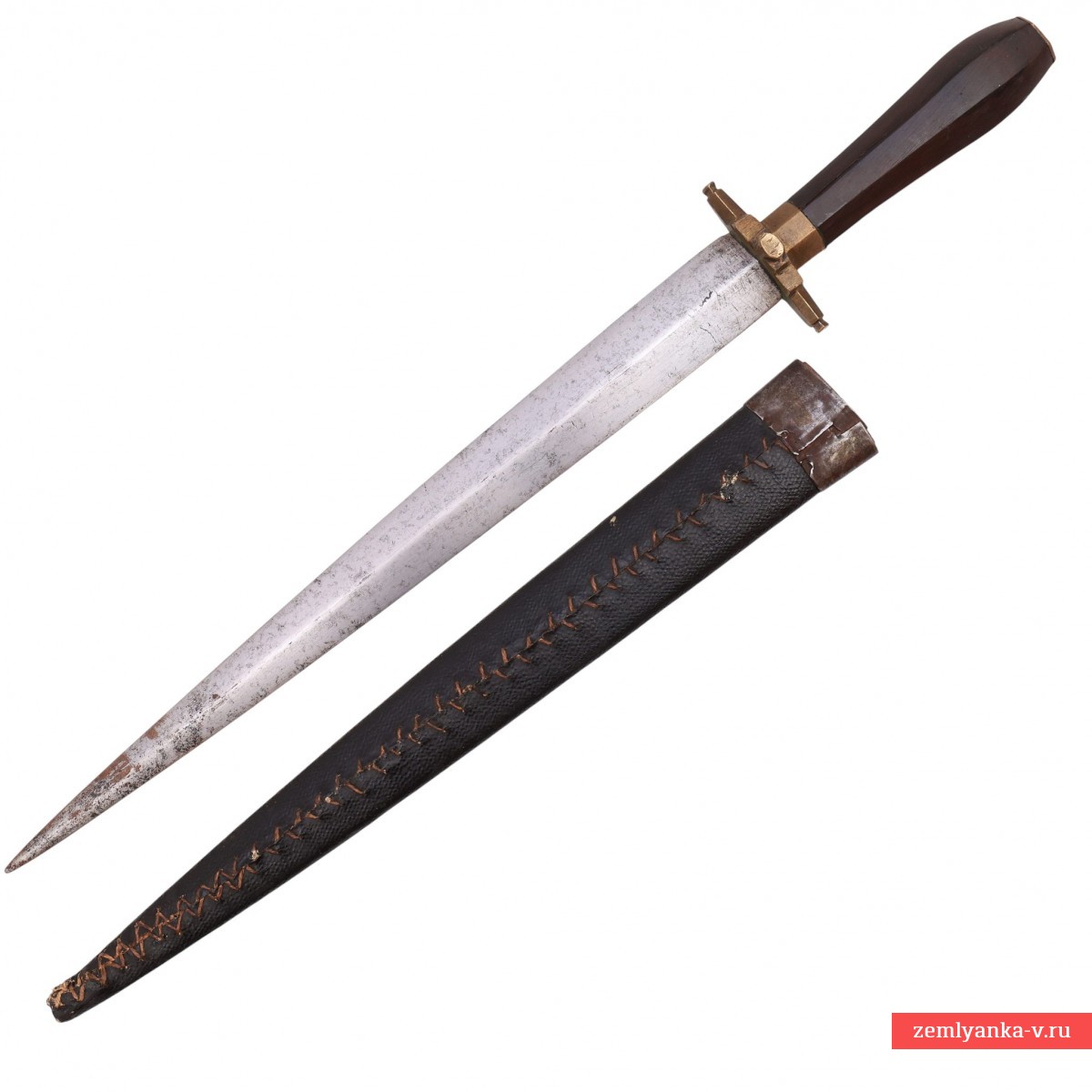 Весьма необычный массивный кинжал в неплохом состоянии. Клинок стальной, прямой, двулезвийный, ромбического сечения, без долов, сужающийся к боевому концу. Эфес состоит из рукояти и небольшой крестовины. Рукоять деревянная, фигурная, конической формы, гранёная. У основания рукояти расположена латунная гранёная втулка. Сверху рукояти латунная планка. Крестовина латунная, короткая, прямая с гранями. Ножны деревянные, обтянутые кожей с металлическим накладным устьем.