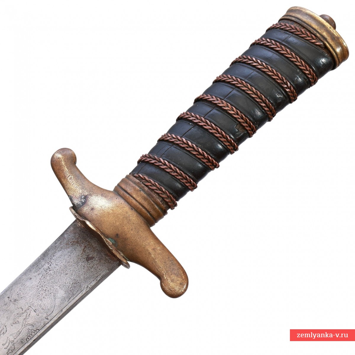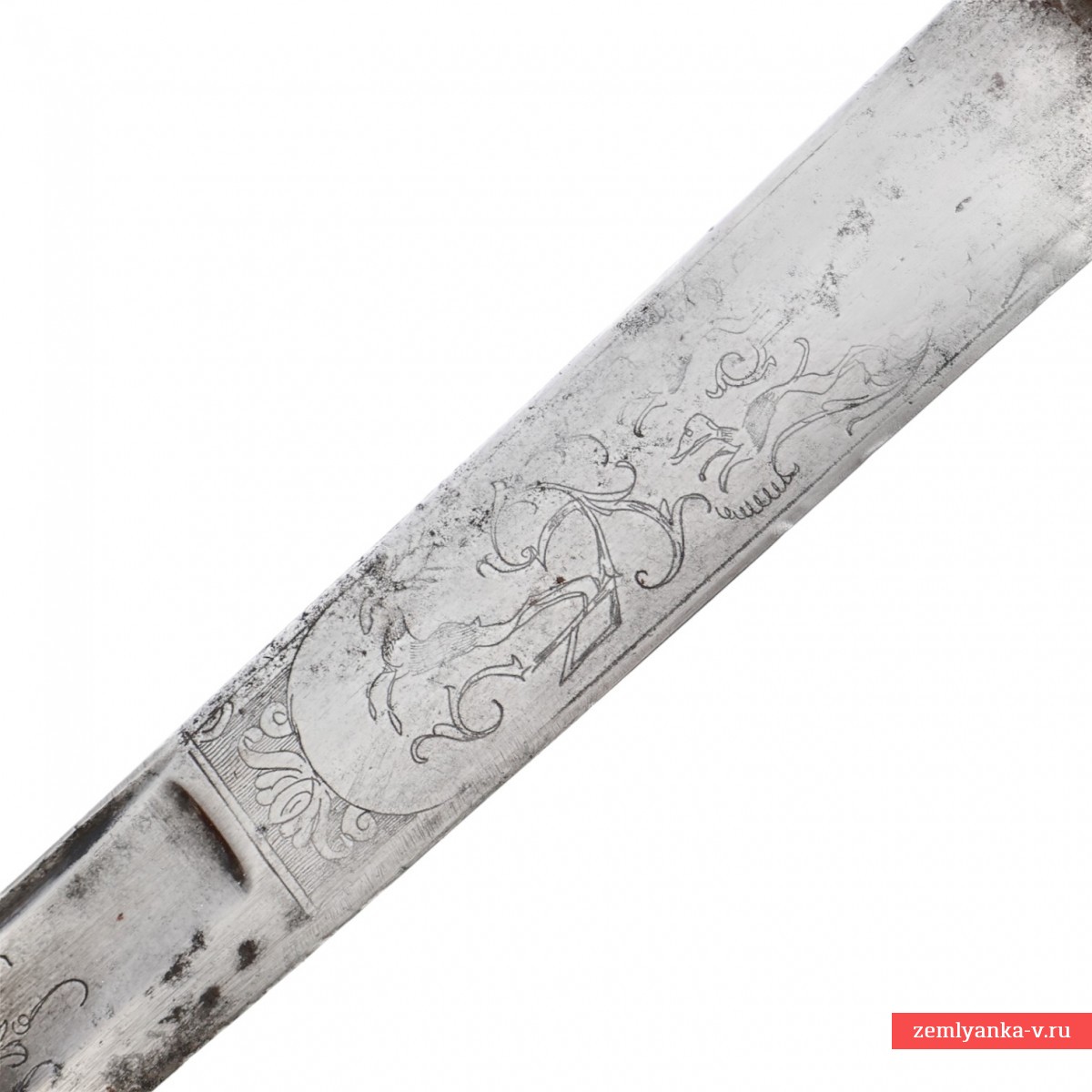 Клинок стальной, незначительно изогнутый, с одним широким и одним узким долами. В первой трети клинок украшен нанесенными иглой изображениями сцены псовой загонной охоты на оленя и растительных завитков. Рукоять из цельного массива рога, конусовидная, изогнутая, с расширением к навершию, по желобкам перетянута медной проволокой. Крестовина латунная, гладкая, с незначительно изогнутыми в разные стороны краями. Между крестовиной и рукоятью латунная фиксирующая втулка с продольными желобками. Навершие рукояти выполнено в форме овальной шайбы с пуговкой сверху, на которой расклепан хвостовик клинка. Ножны кожаные, с латунным прибором, состоящим из устья с овальным шпеньком и наконечника.