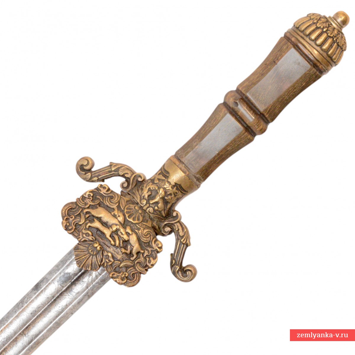 Эфес состоит из рукояти и крестовины. Рукоять роговая, фигурная, в сечении 8-гранная, с ободком по центру. Крестовина изготовлена из латуни методом литья, имеет фигурные изогнутые вниз концы. В центре крестовины по обеим сторонам изображены собаки и птицы, в растительном обрамлении. Навершие рукояти полусферической формы, выполнено в т.н. форме «дольки дыни». Под крестовиной с лицевой стороны установлен декоративный щиток, на котором изображена сцена псовой загонной охоты на кабана. В верхней и нижней частях щитка изображены пальметты. Хвостовик клинка стянут на навершии латунным винтом.