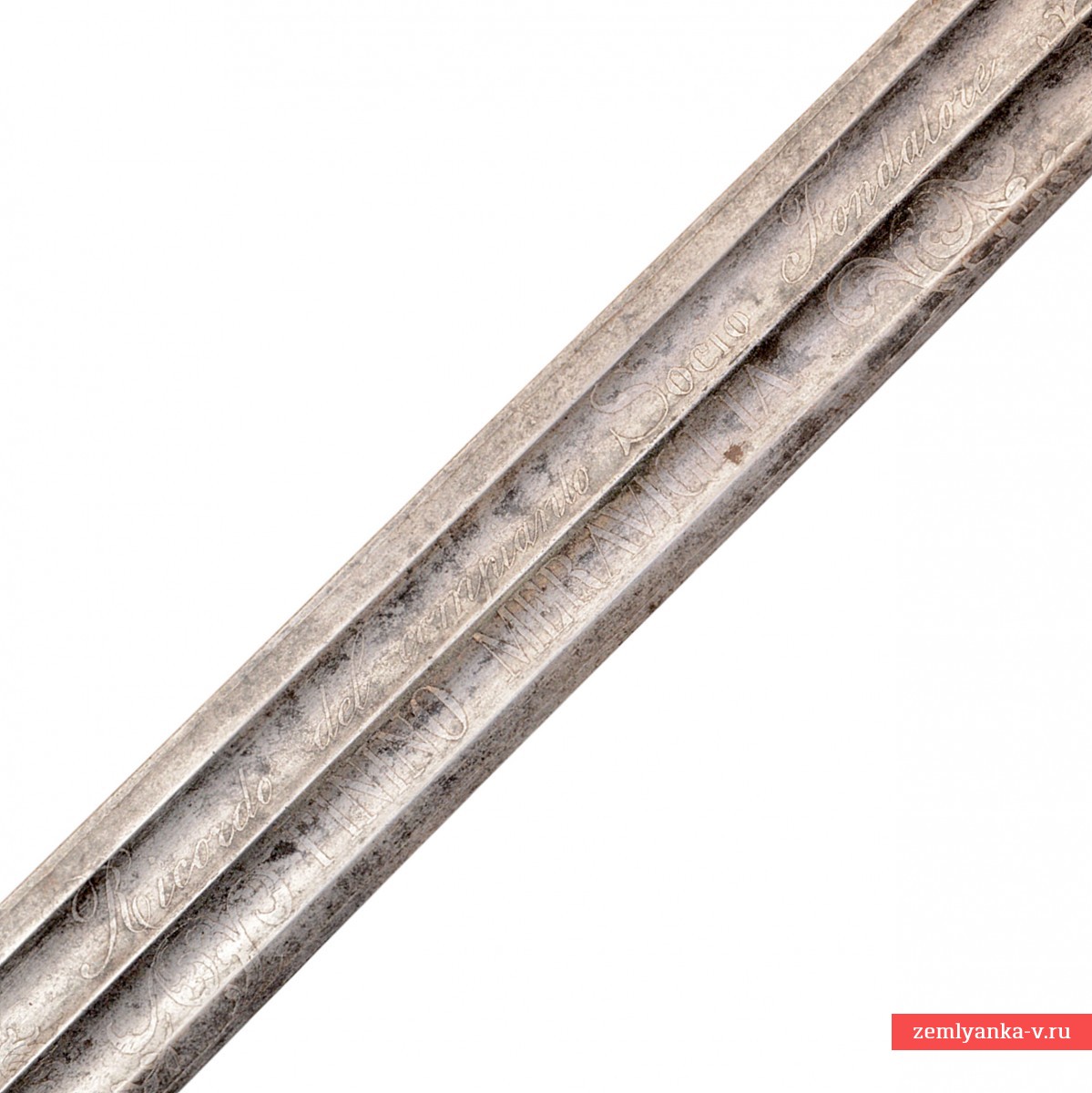 Кинжал состоит из клинка, эфеса и ножен. Клинок стальной, прямой, двулезвийный, с двумя долами на каждой голомени. На клинке с одной стороны травлением нанесена надпись «Ricordo del compianlo Socio Fondalore Pinino Meraviglia» ( «Памяти безвременно ушедшего (покойного) члена-основателя Пинино Меравилья», итал.), с другой «12 febbraio 1889» ( «12 февраля 1889 года», итал.) и плохо читаемо и неразборчиво «Regg.» (?). Таким образом, данный кинжал является мемориальным образцом оружия, изготовленным в 1889 году в Италии в память о Пинино Меравилья, вероятно, основателе одного из многочисленных охотничьих обществ. Традиция дарения памятных вещей членам подобных обществ после кончины их основателей была достаточно распространена в то время.
