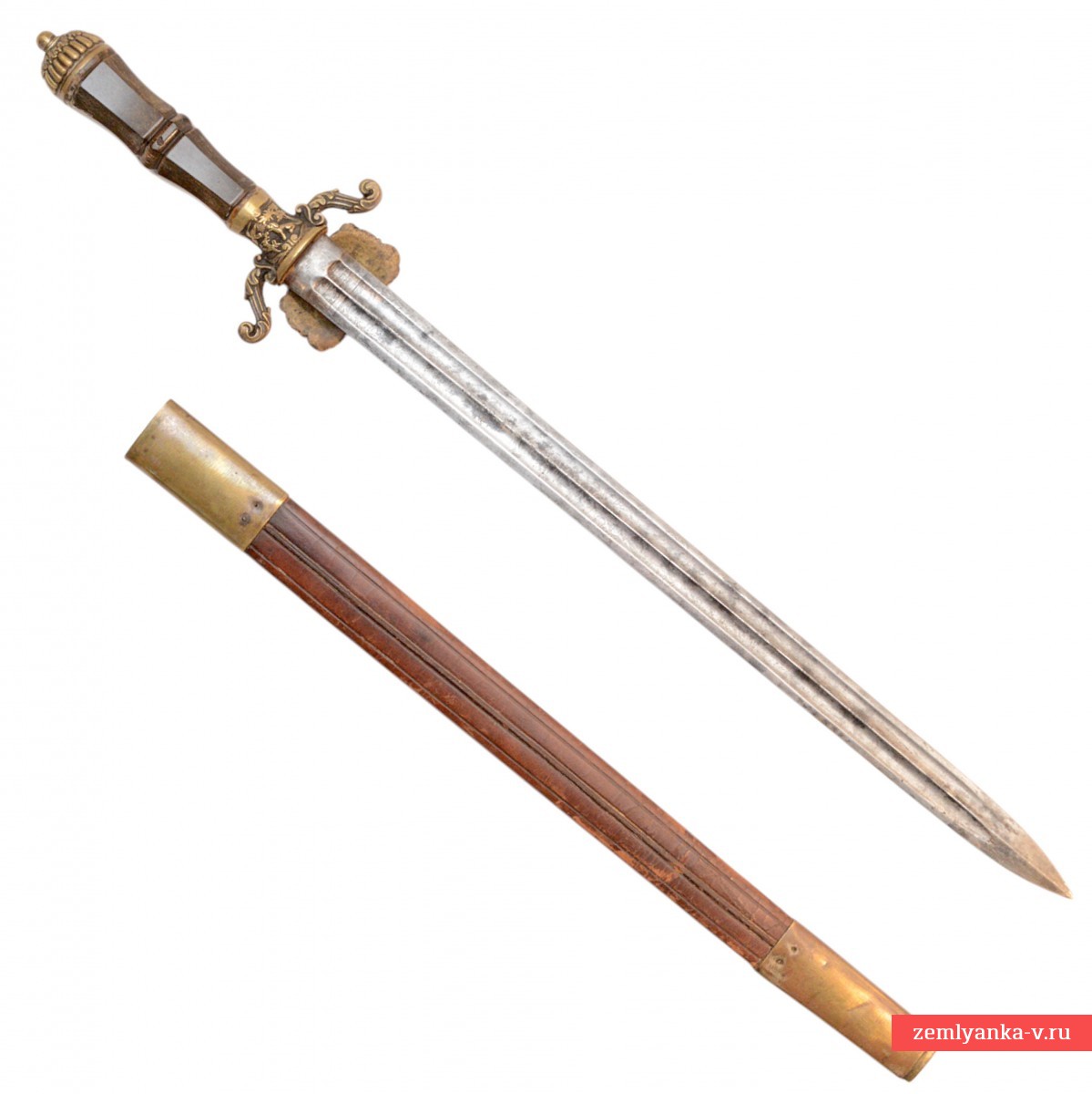 Ножны кожаные, с латунным прибором, состоящим из устья и наконечника со шпеньком, который украшен изображением 4-лепестковой розетки. На устье ножен гравировкой нанесено изображение цветка.