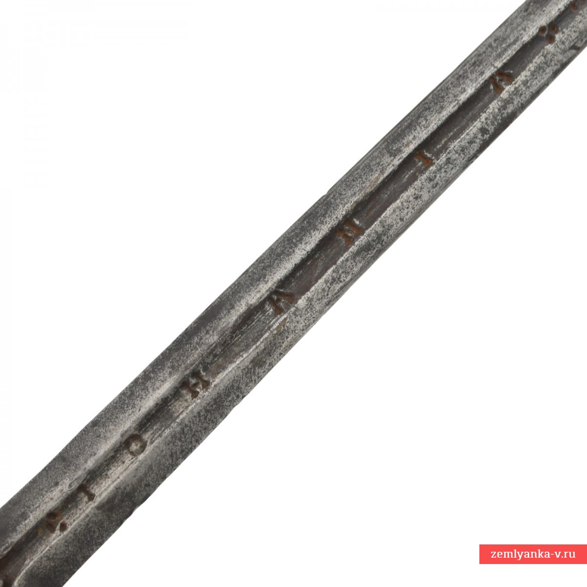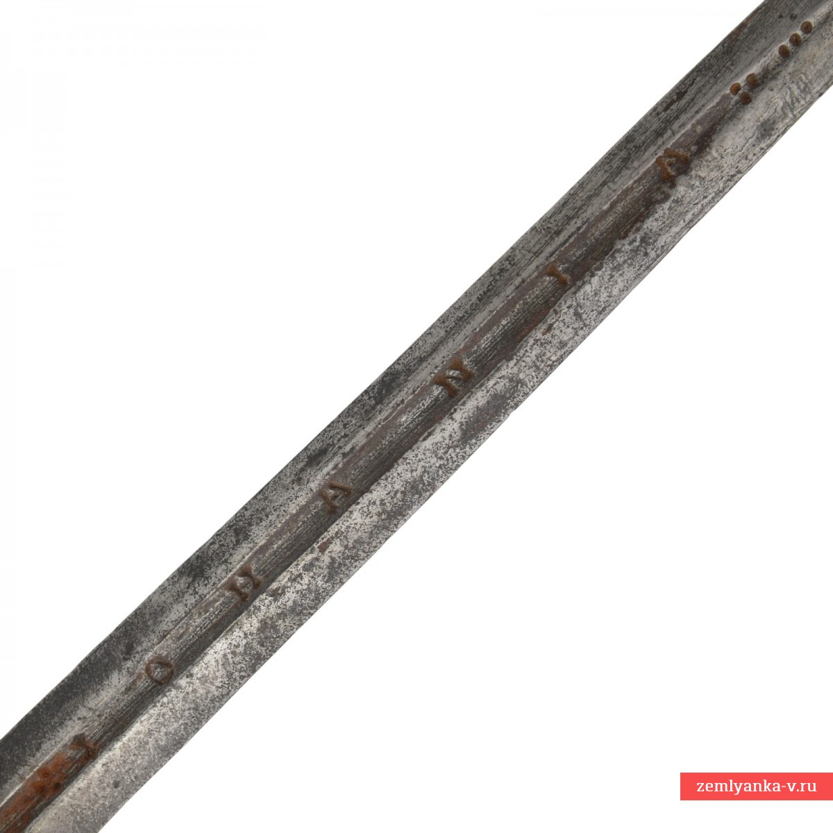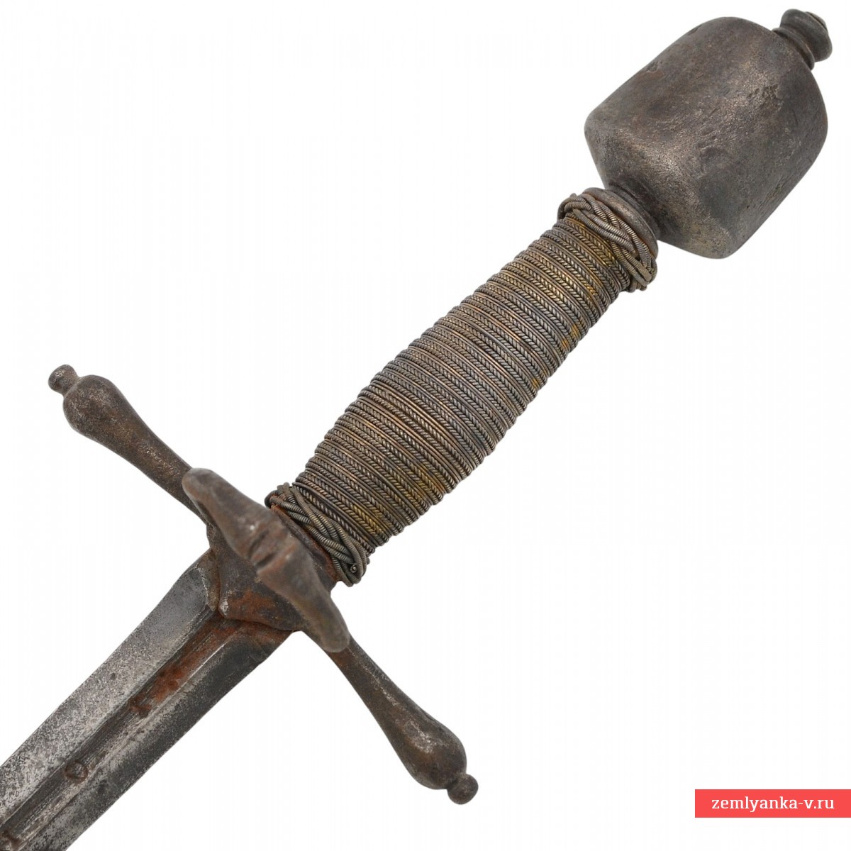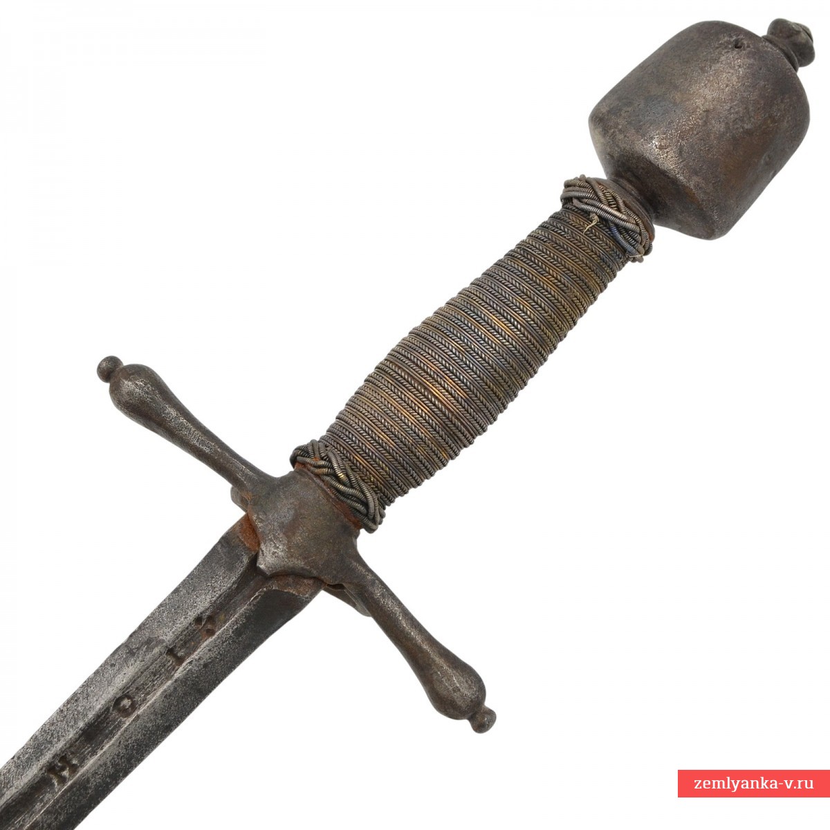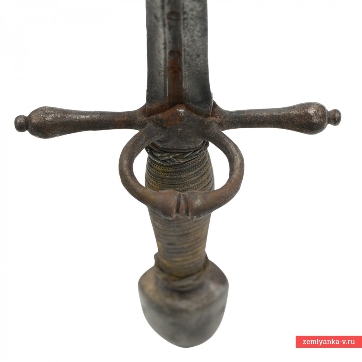Оригинальный и достаточно редкий кинжал в неплохом коллекционном состоянии. Кинжал имеет обоюдоострый клинок ромбического сечения, с долом по обеим голоменям в первой половине. В доле по обеим сторонам выбито имя мастера «IOHANIA» (вероятно, неграмотное воспроизведение немецкого имени «IOHANN»). Эфес состоит из рукояти и крестовины. Крестовина стальная, имеет прямые окончания. В центре рукояти с одной стороны установлено стальное кольцо. Рукоять деревянная, по всему периметру укрыта медным листом и перевита проволокой. Навершие рукояти массивное, овальной формы. Хвостовик клинка расклепан на навершии. Ножны отсутствуют. Гарантия подлинности.