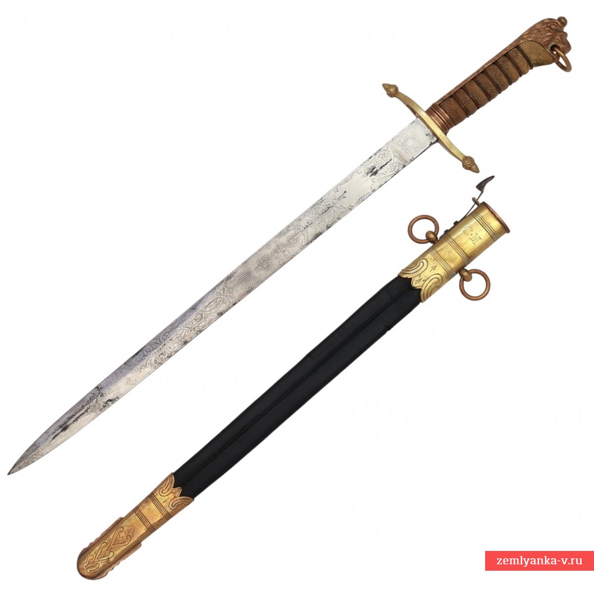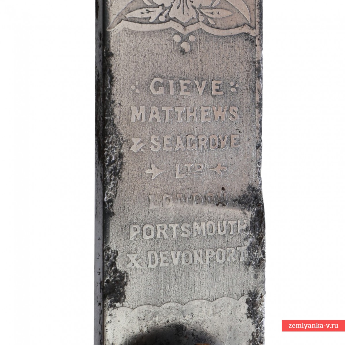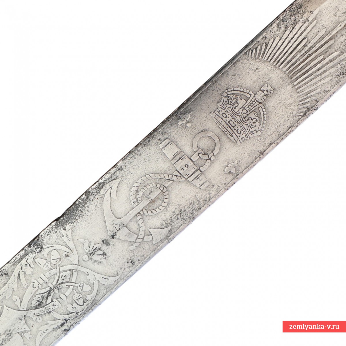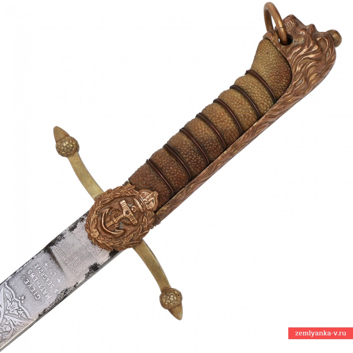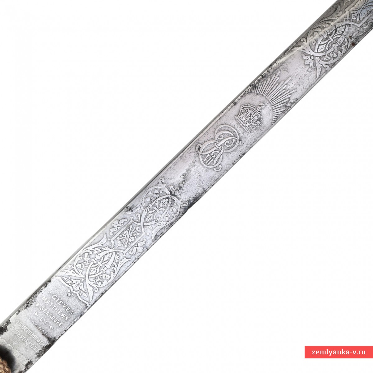 Клинок стальной, прямой, однолезвийный, плоский, без долов. В нижней трети двулезвийный. Клинок украшен травленым растительным орнаментом и изображениями на морскую тематику, также монограммой «ER VII» под короной – вензель короля Великобритании Эдуарда VII (1901-1910 гг. правления). На пяте клинка нанесена травлёная надпись «GIEVE MATTHEWS & SEAGROVE Ltd * LONDON PORTSMOUTH & DEVENPORT» — клеймо оружейной фирмы, которая изготавливала холодное оружие для Королевского флота Великобритании. Рукоять деревянная, обтянутая кожей ската с поперечными желобками, по которым обмотана медной проволокой. Головка рукояти рельефная, представляет собой голову льва, грива которого переходит в спинку. В зубах лев держит кольцо для темляка. Внизу рукояти имеется втулка. Хвостовик клинка проходит сквозь головку рукояти и расклепывается сверху. Крестовина плоская, с загнутыми в разные стороны концами, заканчивающимися изображениями желудей. На перекрестье расположен щитик с изображением обвитого канатом якоря, увенчанного короной, в обрамлении лавровых ветвей. Все детали рукояти и крестовина медные. В крестовине имеется отверстие, куда входит защелка для крепления кортика в ножнах. Ножны деревянные, обтянутые черной кожей. Прибор ножен состоит из устья. На устье с двух сторон расположены кольца для крепления ремней портупеи и справа защелка для фиксации кортика в ножнах. Прибор ножен медный, с зубчатыми краями, украшен простым геометрическим орнаментом. На устье нанесены гравированные инициалы владельца «С.М».