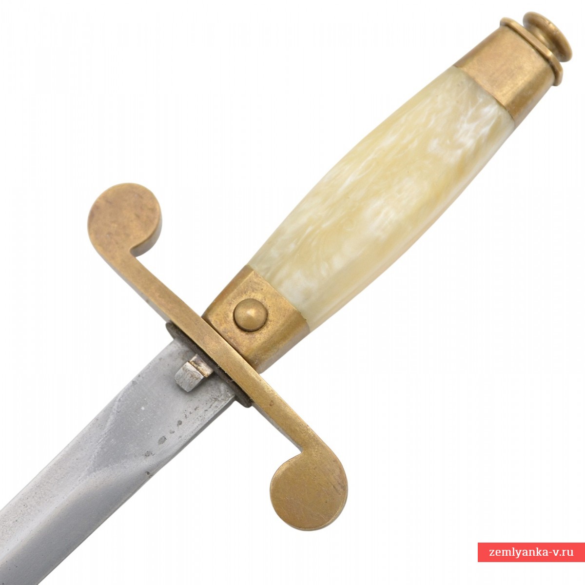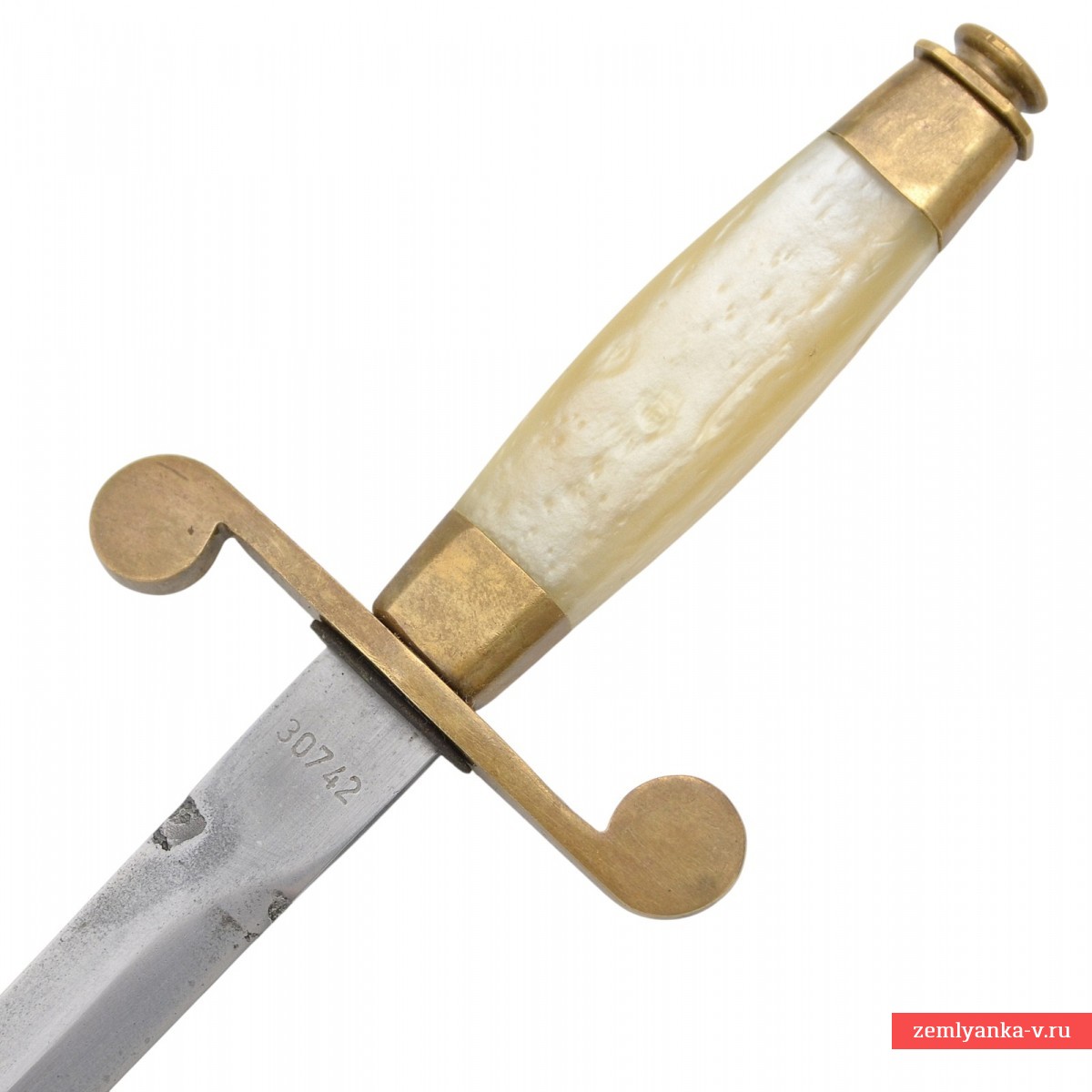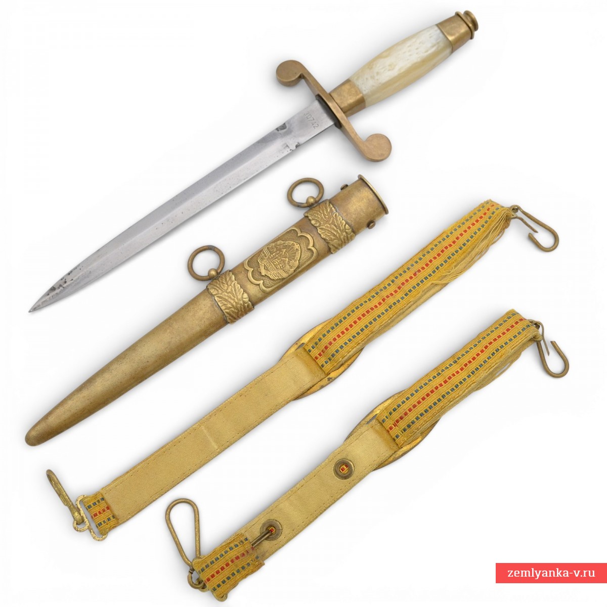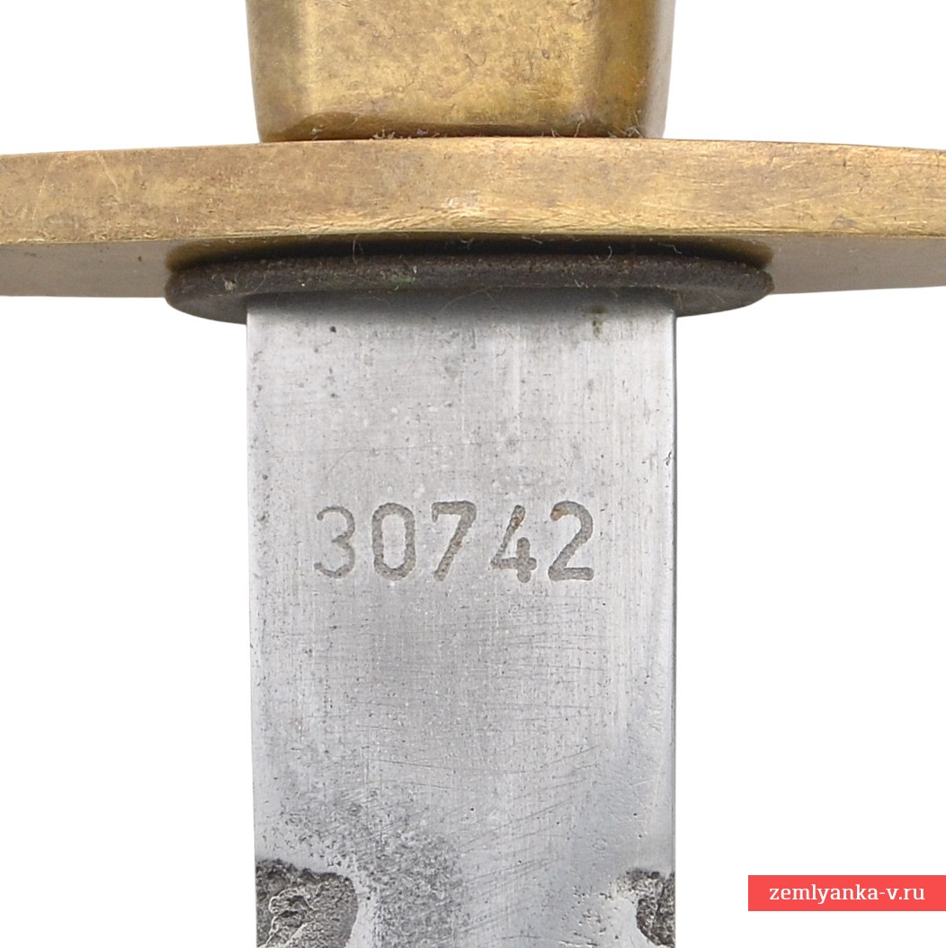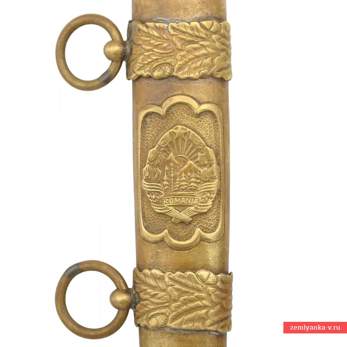 Оригинальный офицерский кортик в комплекте с подвесом. Клинок прямой, стальной, двулезвийный, ромбического сечения, без долов. На пяте клинка пробит номер оружия «30742». Эфес состоит из рукояти и крестовины. Рукоять прямая, из пластмассы бело-перламутрового цвета, прямоугольного сечения, с фасками. Сверху и снизу имеются конические втулки. Сверху на хвостовик клинка навинчивается прямоугольная гайка с выступающим приплюснутым шариком. На нижней втулке расположена кнопка пружинной защелки фиксатора кортика в ножнах. Крестовина прямая, плоская, с загнутыми в разные стороны закругленными окончаниями. Под крестовиной имеется овальная кожаная прокладка. Ножны латунные, гладкие, позолоченные. Прибор ножен латунный, позолоченный, состоит из двух гаек, украшенных рельефным растительным орнаментом (дубовые листья и желуди) с подвижными кольцами для ремней портупеи. Между гайками с обеих сторон в фигурном картуше расположено рельефное изображение герба Социалистической Республики Румыния. Гарантия подлинности.