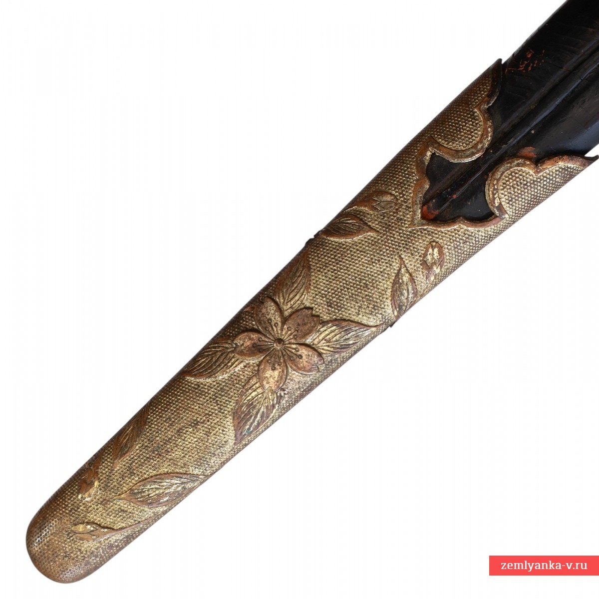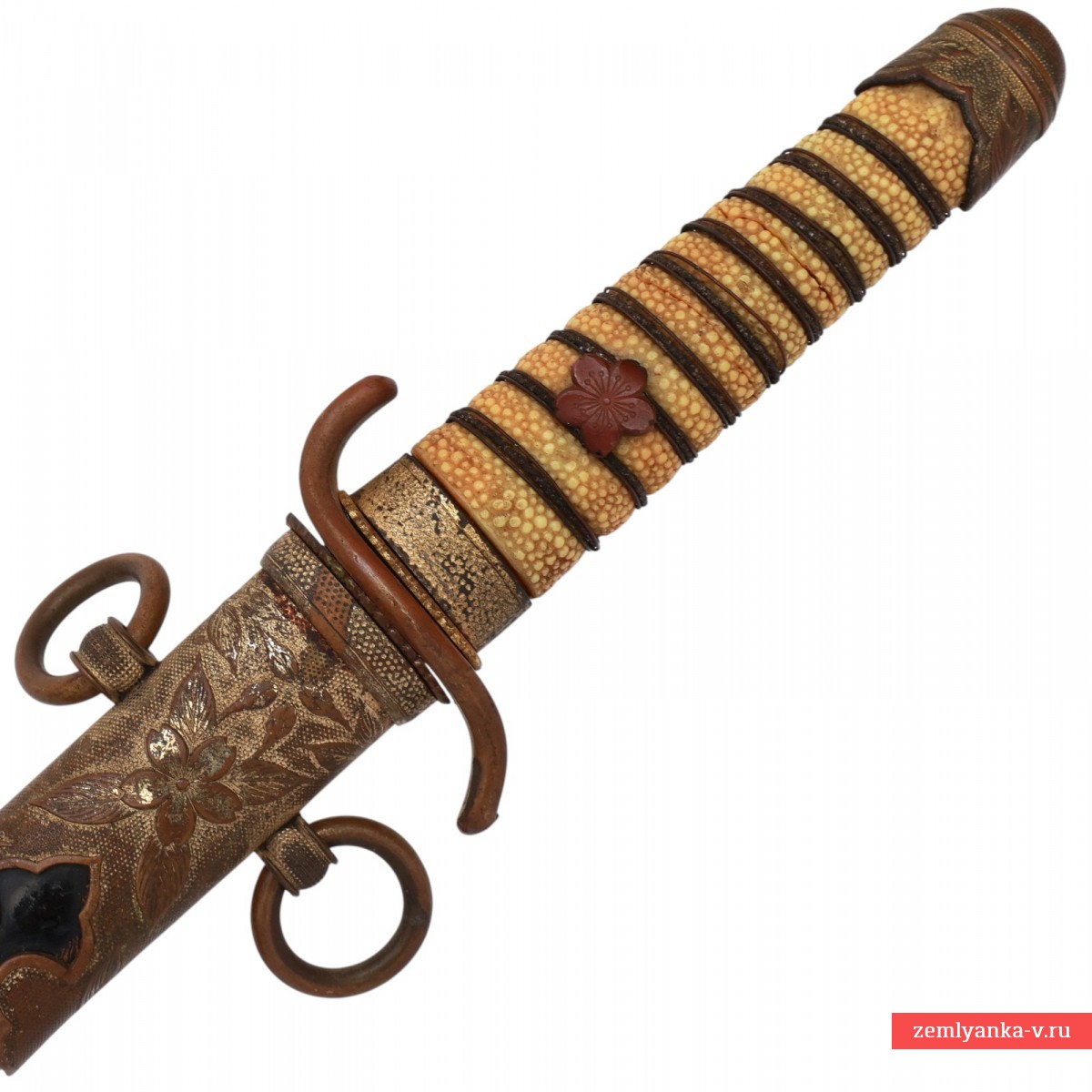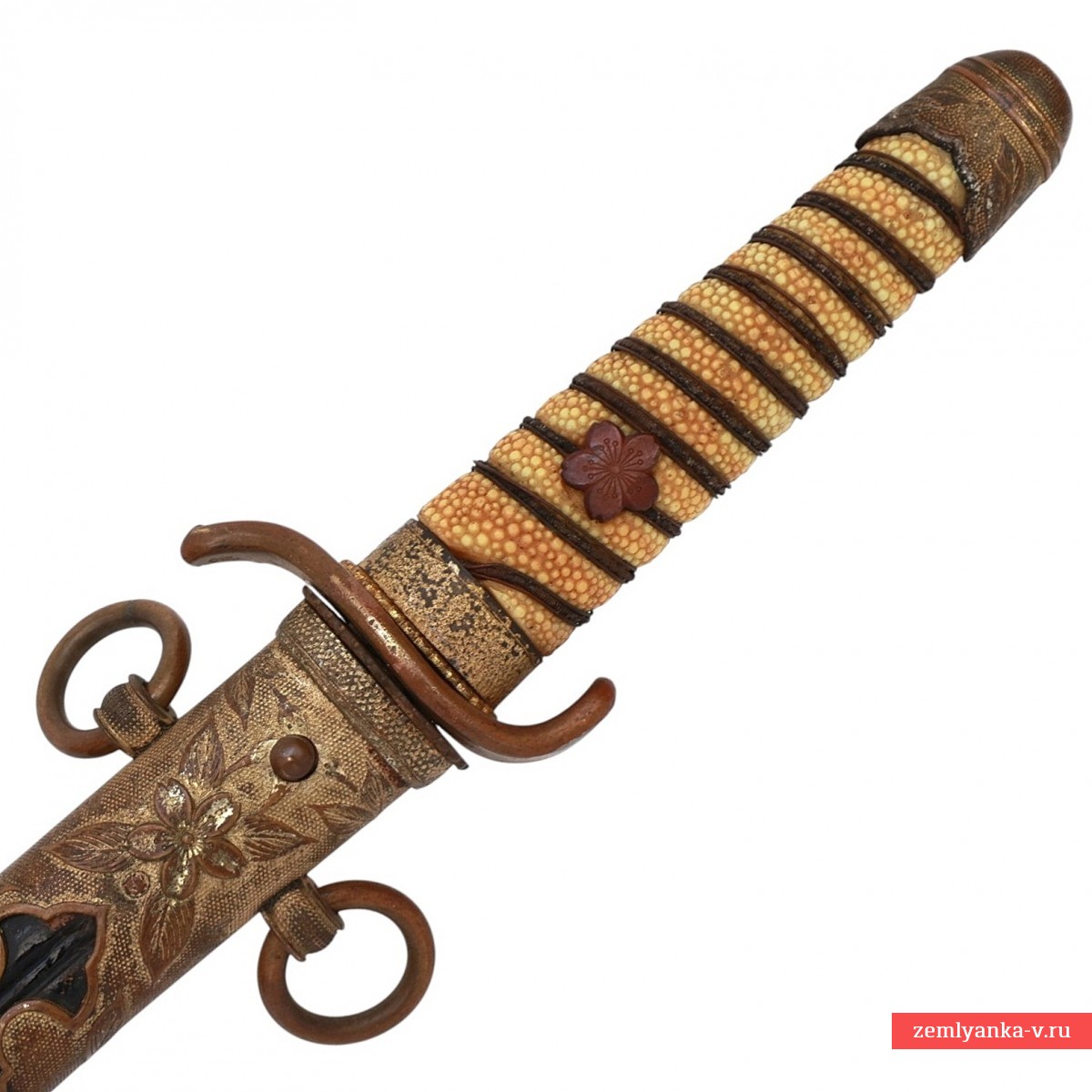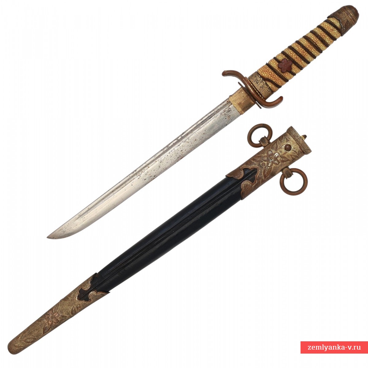 Оригинальный кортик в неплохом коллекционном состоянии. Клинок стальной, прямой, плоский, однолезвийный, никелированный, с одним узким долом с обеих сторон. На пяте клинка имеется латунный хабаки. Рукоять деревянная, овальною сечения, сужающаяся к головке, обтянутая белой крупнозернистой кожей ската. Рукоять имеет спиралевидный желобок, по которому обвита тремя рядами латунной проволоки. Головка рукояти округлая, украшенная гравированным изображением цветка и листьев сакуры. Внизу рукояти имеется втулка, украшенная точечным гравированным фоном и листьями сакуры. Рукоять крепиться на хвостовике при помощи деревянного штифта, торцы которого закрывают менуки (декоративные накладки) в виде листьев сакуры. Крестовина плоская, овальная, с отогнутыми в разные стороны концами. С обеих сторон крестовины имеются плоские овальные прокладки (сеппа), украшенные по периметру орнаментом. Все латунные части эфеса позолоченные. Ножны деревянные, плавно сужающиеся к концу, покрытые лакированной акульей кожей. Прибор ножен латунный, позолоченный, состоит из широкого устья и длинного наконечника. Прибор ножен украшен рельефными изображениями цветов и листьев сакуры на точечном гравированном фоне. Украшением нижней части устья и верхней части наконечника являются фигурные выточки в форме стрелы. На устье с обратной стороны расположена кнопка пружинной защелки, язычок которой фиксируется в отверстии на перекрестье. На устье с обеих его сторон имеются два кольца для крепления ремней портупеи. Портупея отсутствует, темляк не использовался.