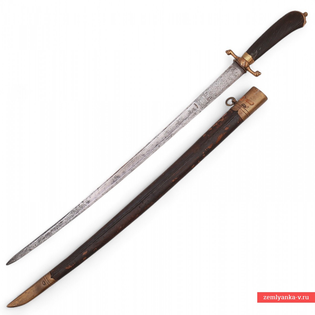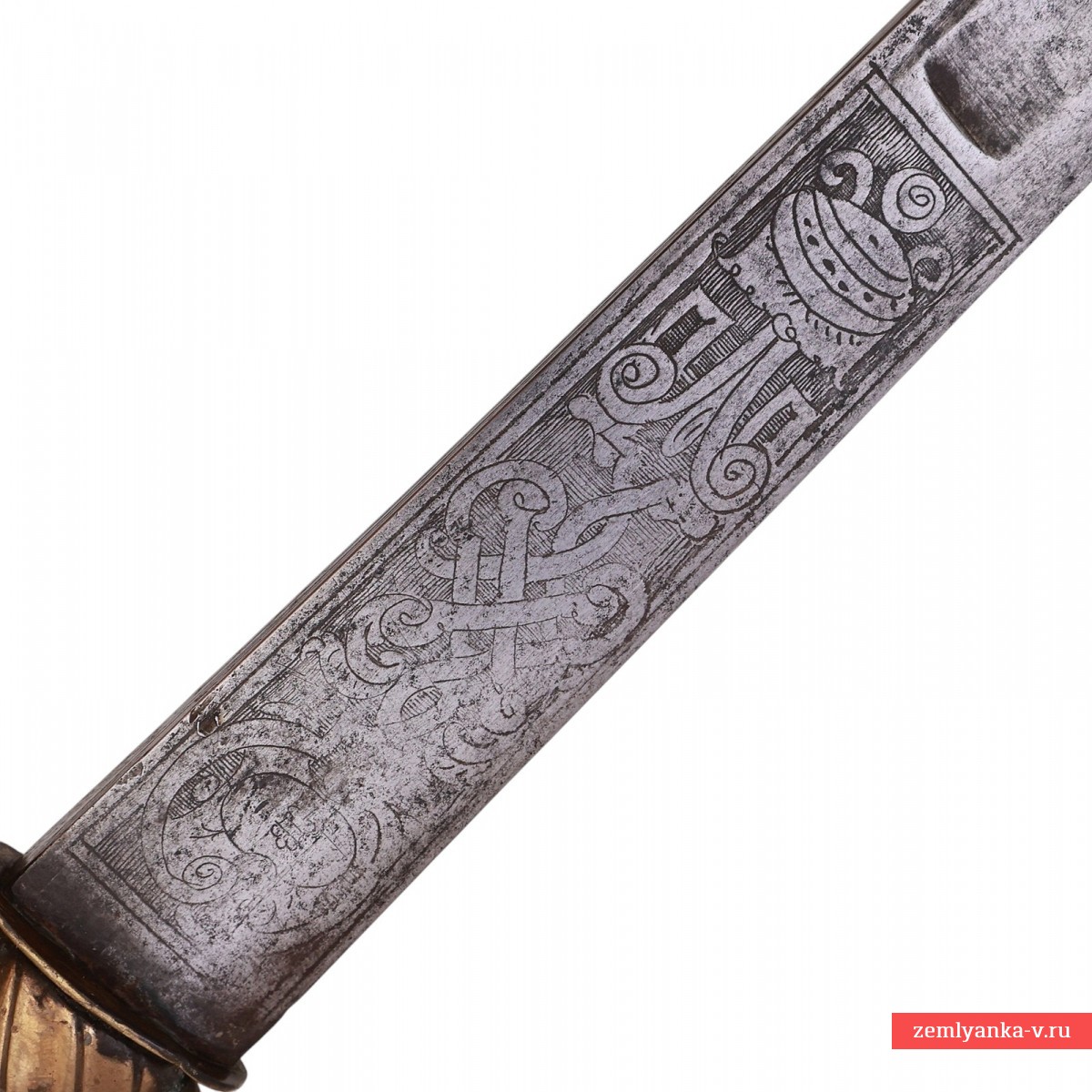 клинок стальной, незначительно изогнутый, однолезвийный, с одним широким и одним узким долами с обеих сторон; боевой конец двулезвийный. Клинок украшен орнаментами в виде завитков, а также стилизованной сценой охоты. Эфес состоит из рукояти и небольшой крестовины. Рукоять деревянная, коническая, фигурная с наклонными бороздками. У основания фигурная коническая латунная втулка. Навершие латунное, фигурное с пуговкой сверху, в которой расклёпан хвостовик клинка. Крестовина латунная с загнутыми в разные стороны окончаниями, который выполнены в виде стилизованных копыт кабана/оленя. Ножны кожаные с латунным прибором, состоящим из устья с обоймицей с подвижным кольцом и наконечника. Края прибора ножен фигурные.