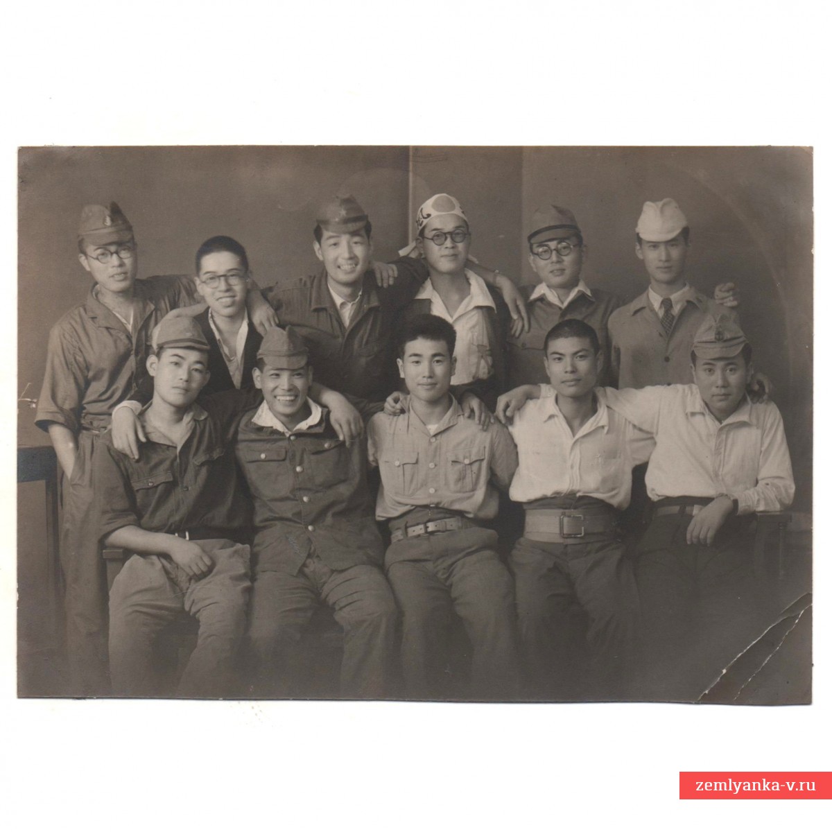 Оригинальный, качественный и достаточно редкий снимок в хорошем коллекционном состоянии. Замят правый нижний угол. На фото группа японских летчиков, среди которых как минимум один пилот-камикадзе, которого легко отличить по «хатимаки» — белой головной повязке, символизирующей у японцев непреклонность намерений и поддерживающей боевой дух. У неё также есть и непосредственная функция — защита лица от пота. Обычно под хатимаки понимают красную или белую полоску ткани около 5 сантиметров шириной и 120 длиной. Раньше хатимаки повязывали камикадзе, кайтэн и другие тэйсинтай перед атакой. Во время войны вручение хатимаки летчикам-камикадзе входило в ритуал чествования самоубийц. Накануне вылета на задание их угощали праздничным обедом, а перед самым вылетом командир наливал церемониальную рюмку саке и повязывал хатимаки. Повязка могла быть чисто белой или красной, или с нанесением символа солнца с написанными вдохновляющими иероглифами. Гарантия подлинности. Редкость.