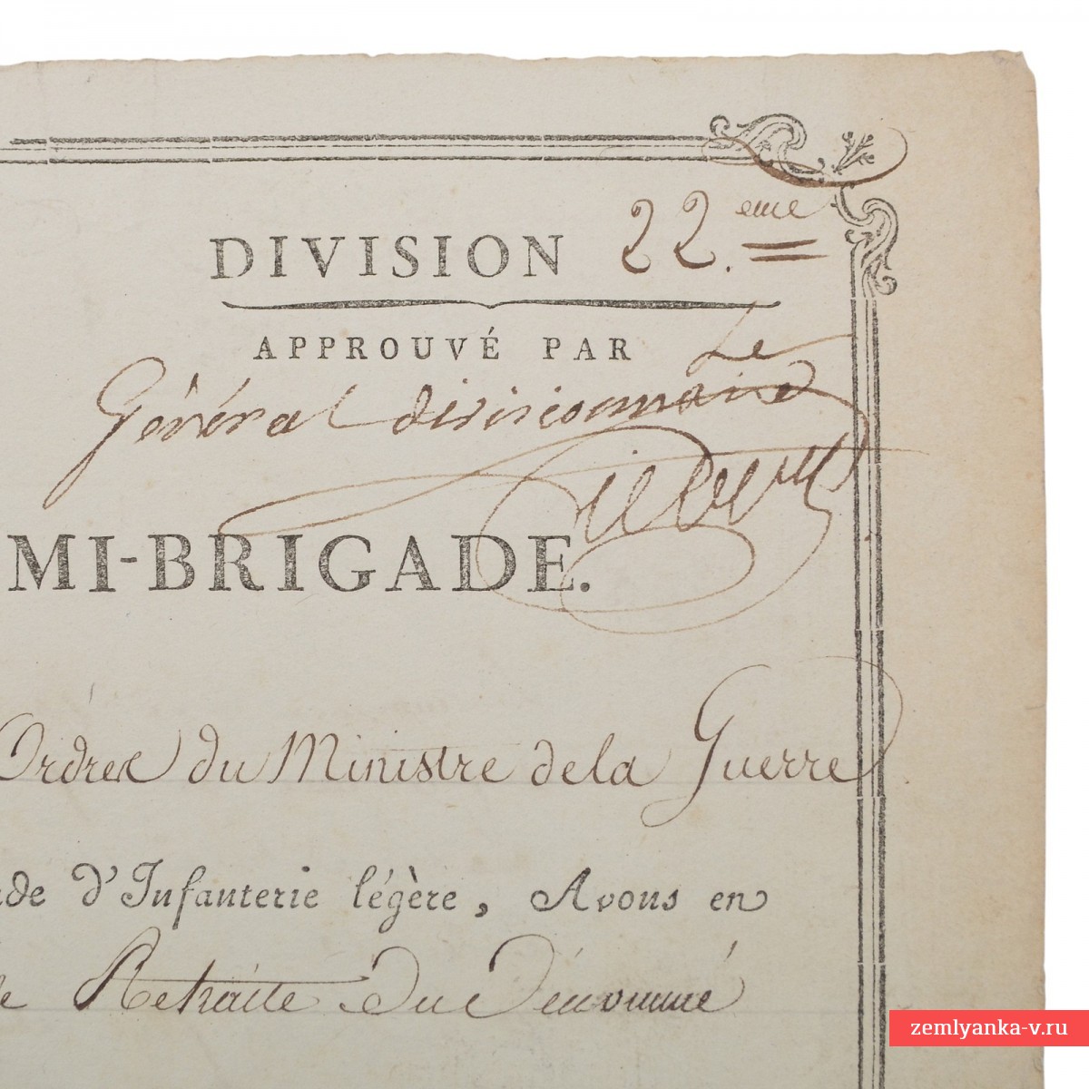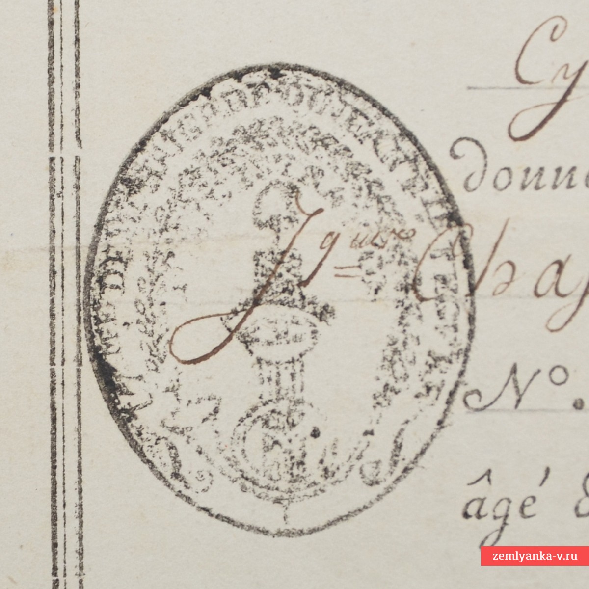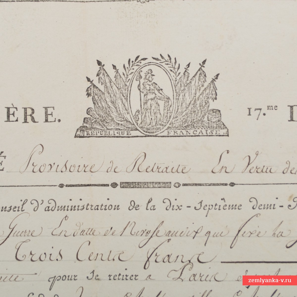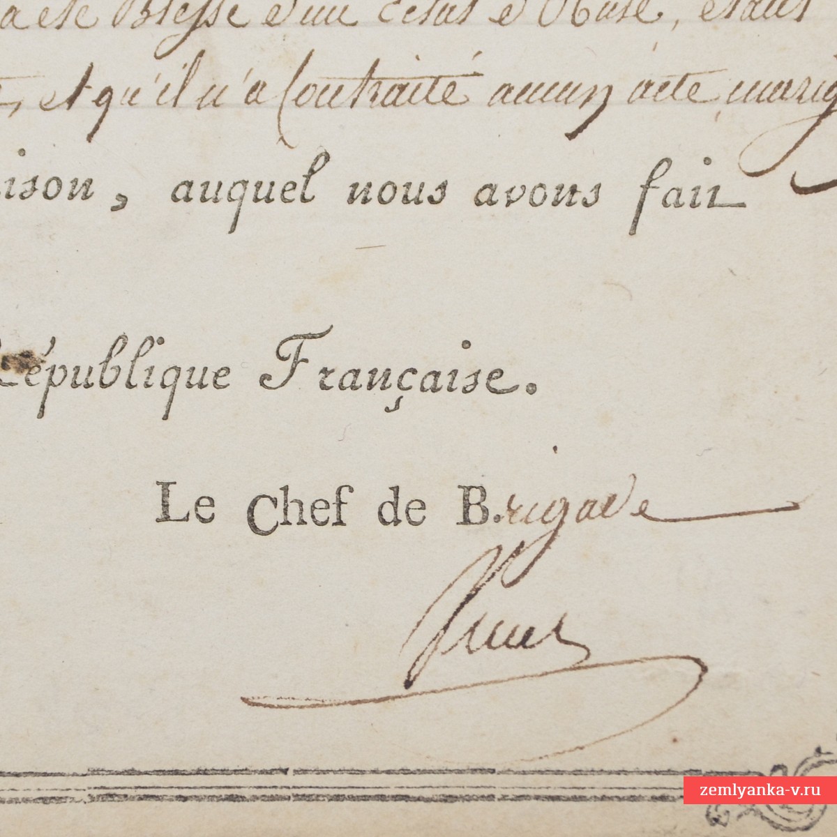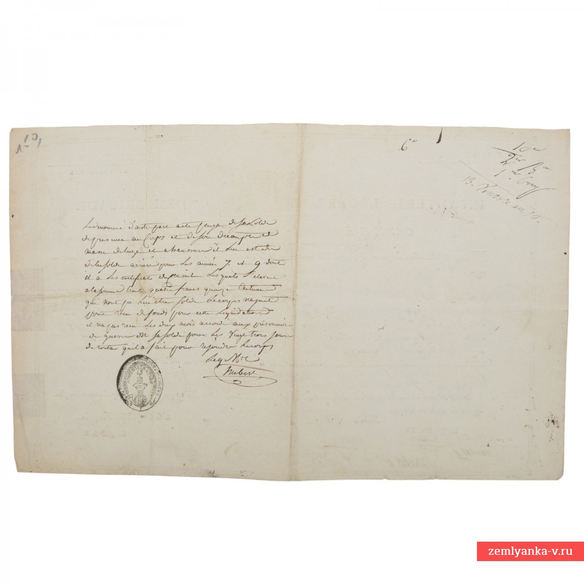 Оригинальный и достаточно редкий документ эпохи Консулата Наполеона Бонапарта в очень хорошем коллекционном состоянии. Бумага верже, типографская печать. Водяные знаки. Подписан командиром бригады и офицерами. Размер листа 253*398 мм. Перегиб по центру. Гарантия подлинности.