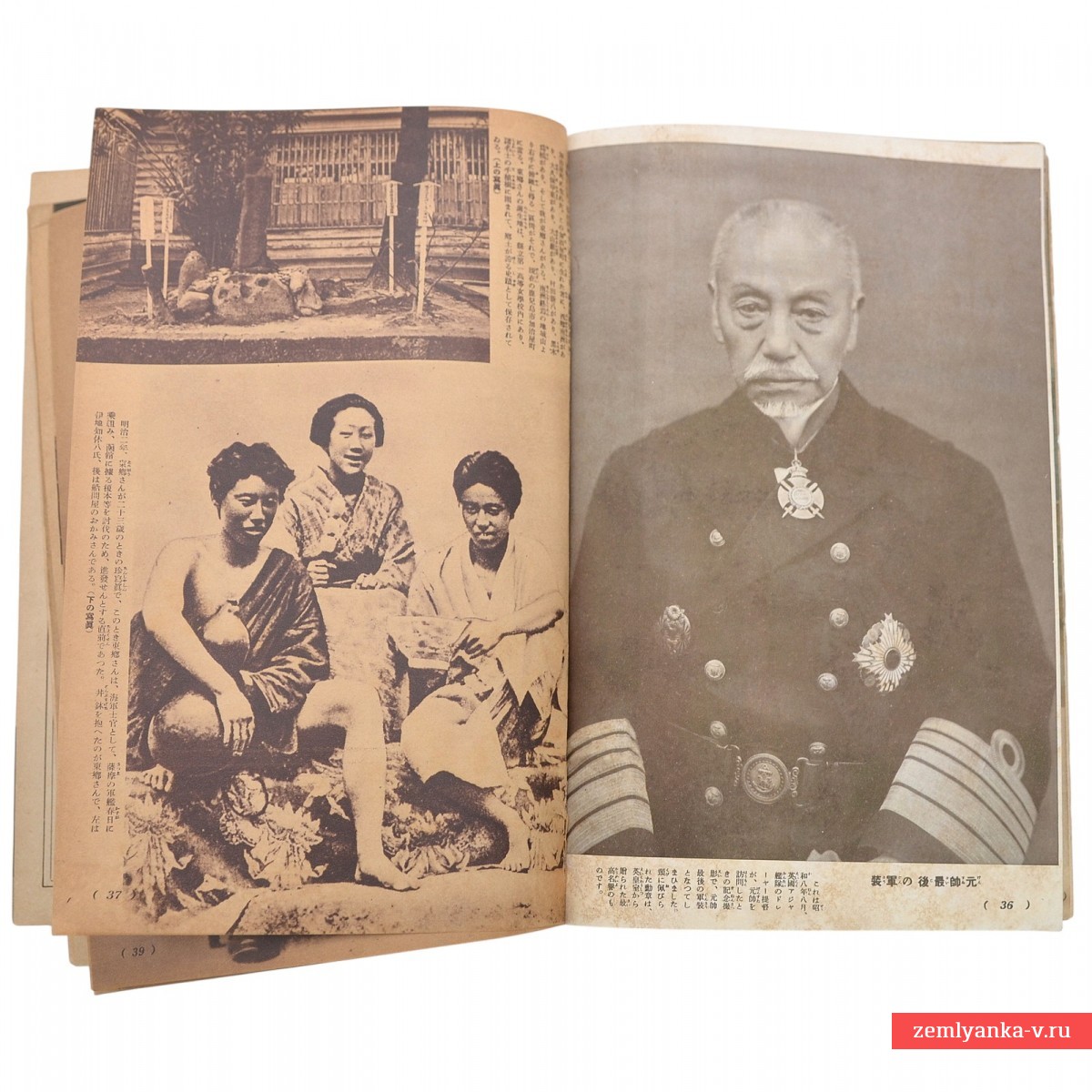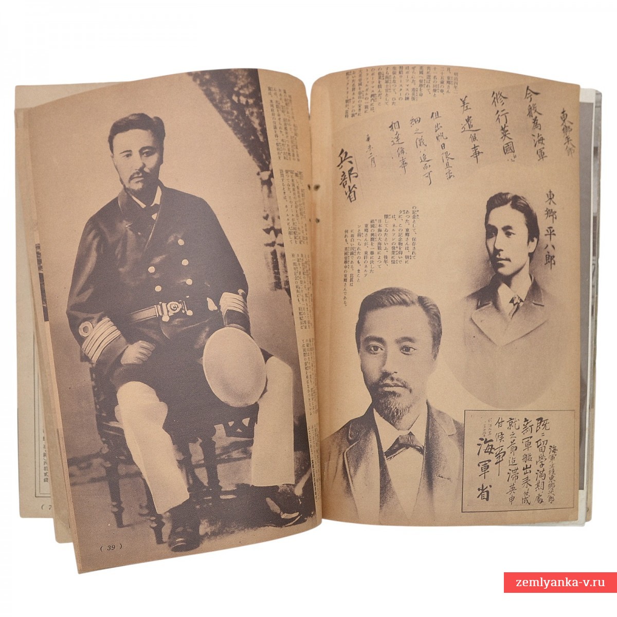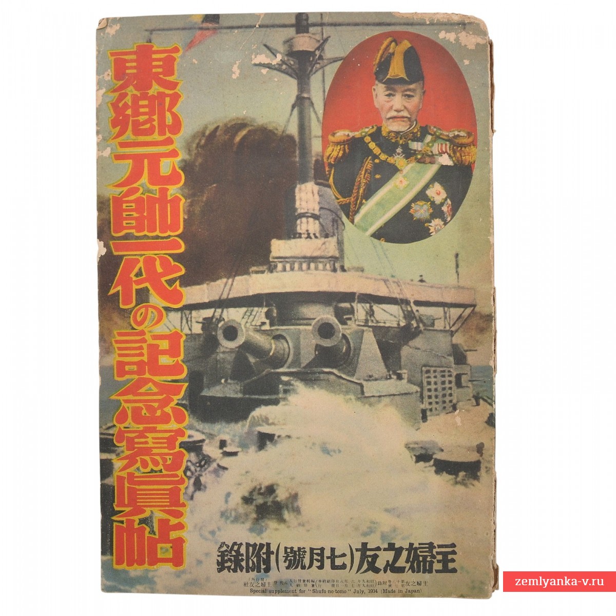 Специальное приложение к японскому женскому журналу Shufu no Tomo ( «Подруга домохозяйки») за июль 1904 года, посвященное адмиралу Того Хэйхатиро. Изображенный на нем адмирал Того известен как герой Русско-японской войны 1904–1905 годов, особенно благодаря решающей победе в Цусимском сражении, где он командовал Объединенным флотом Японии и разгромил Балтийский флот России. Содержит несколько вкладок – постеров. Редкое издание.