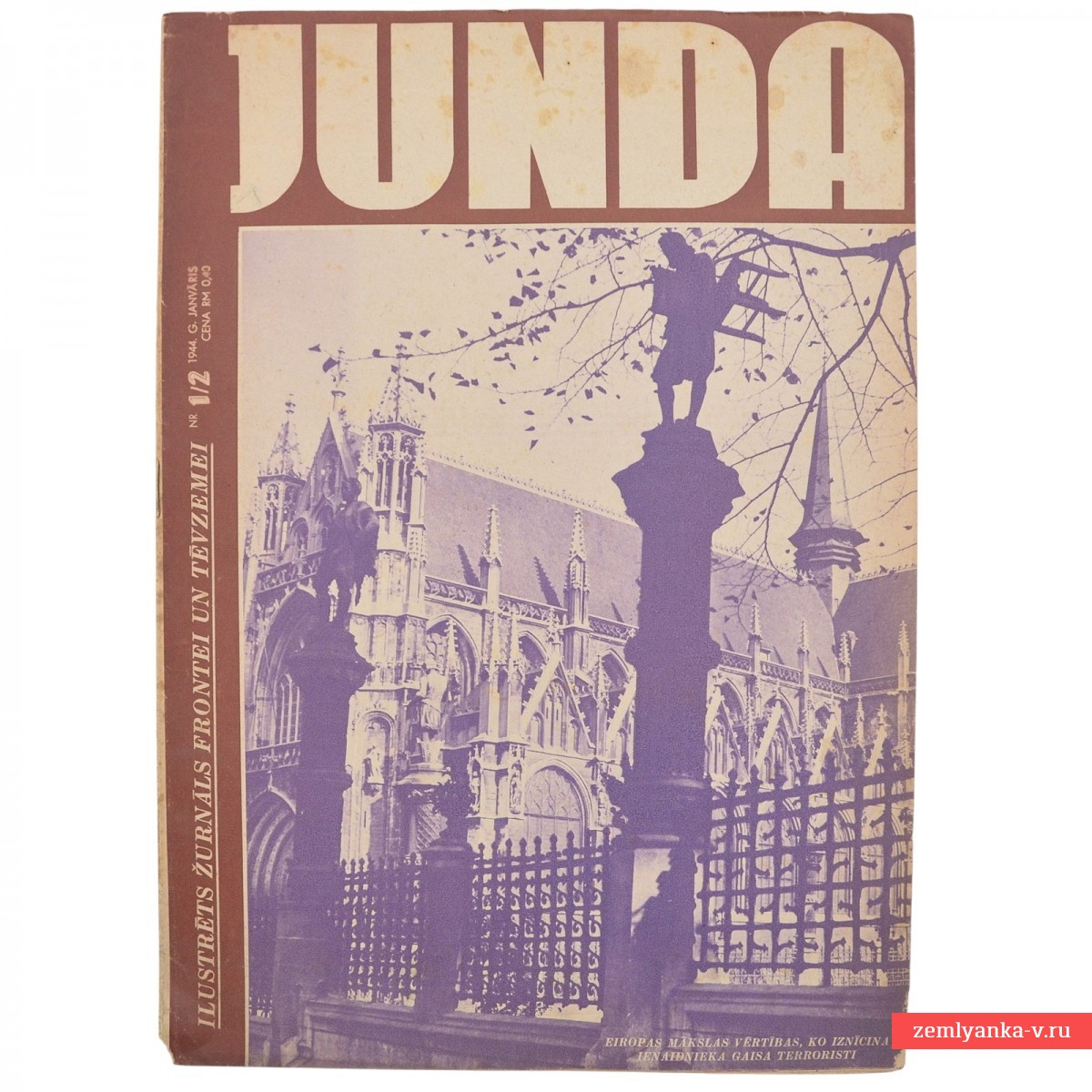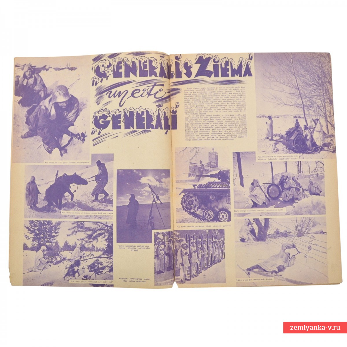 Бумага. Журнал находится в хорошем коллекционном состоянии. Размер 355*253. Цветные иллюстрации и карикатуры. На обложке изображено готическое или неоготическое здание с детализированными архитектурными элементами, статуями и остроконечными шпилями. Вероятно, это здание из Западной Европы. Журнал издавался в Риге на латышском языке. Он был ориентирован как на солдат на фронте, так и на гражданских лиц в тылу, и содержал статьи, иллюстрации и пропагандистские материалы. Выпуск вышел в разгар Второй мировой войны, когда Прибалтика находилась под немецкой оккупацией (Рейхскомиссариат Остланд). На обложке указан номер выпуска (Nr. 1/2), дата (1944. G. JANVĀRIS) и цена (CENA RM 0.40). Гарантия подлинности.
