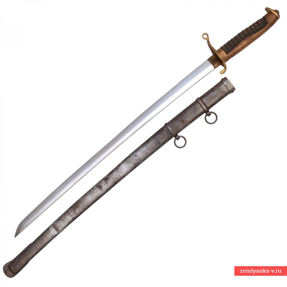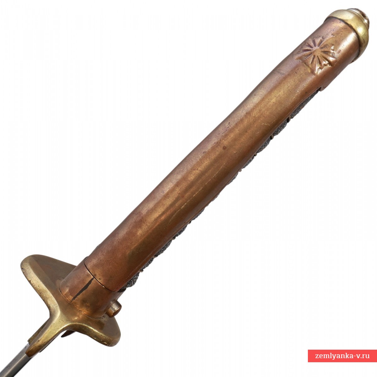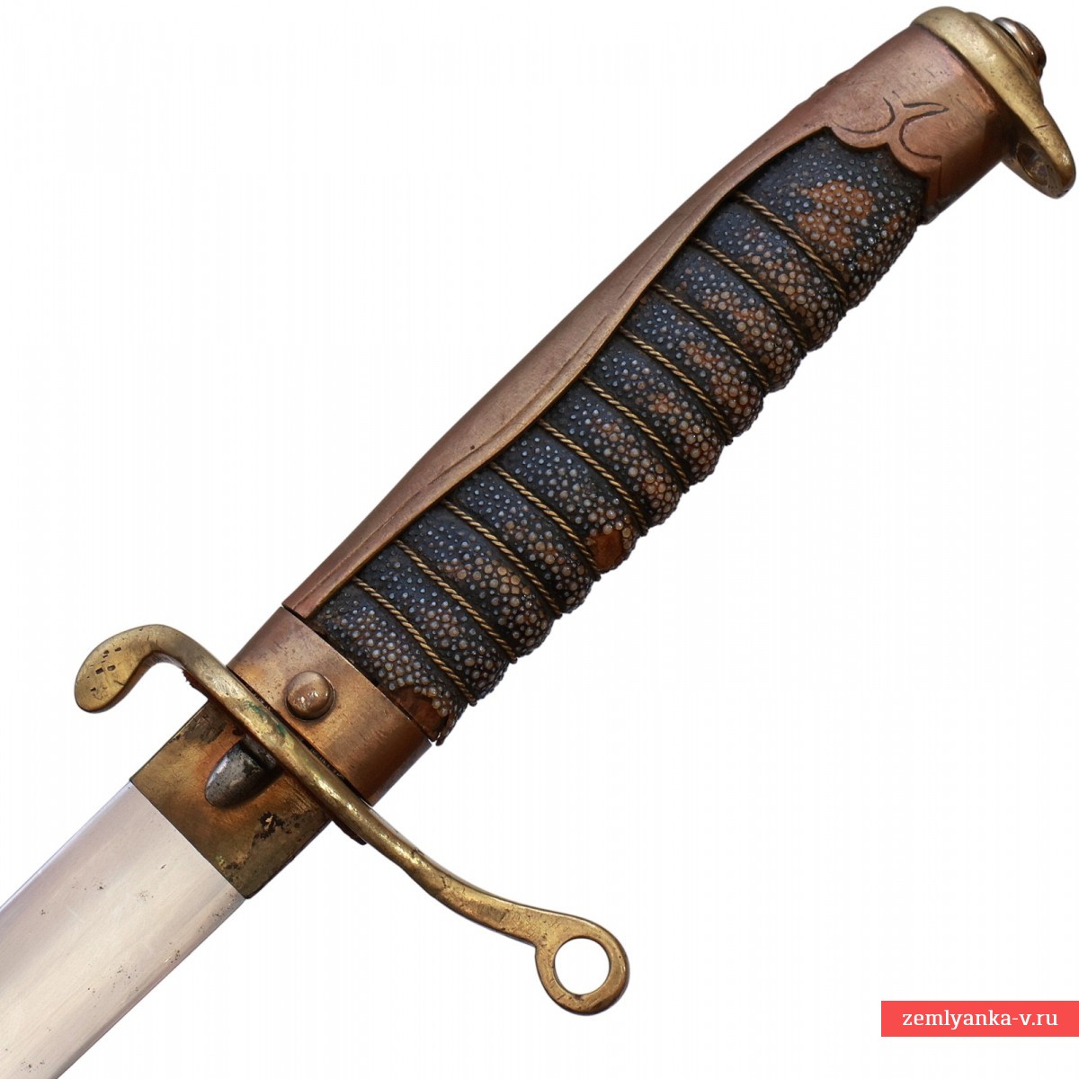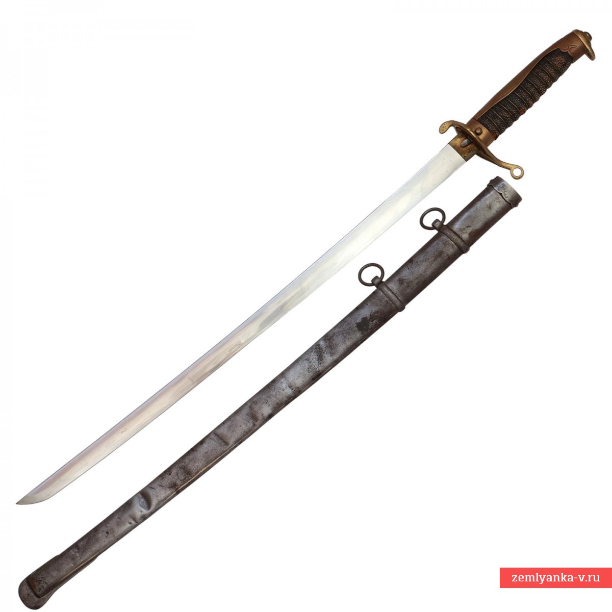 Оригинальный японский полицейский меч в неплохом коллекционном состоянии. Сталь, латунь, кожа ската, ковка, литье. Клинок незначительно изогнутый, стальной, однолезвийный, без долов, с традиционным японским скосом на конце. Хабаки латунный. Эфес состоит из рукояти и крестовины. Рукоять деревянная, обтянутая кожей ската, с поперечными желобками, перетянутыми латунной витой проволокой. Спинка рукояти латунная, гладкая, с расширением в центре, плавно переходящая в головку. На головке имеется петля с отверстием для темляка. Крестовина рукояти латунная, загнутая концами в противоположные стороны, с отверстием для темляка. Между рукоятью и крестовиной располагается латунная втулка, на которой укреплена подпружиненная кнопка, предназначенная для отжима фиксирующей пружины, расположенной у пяты клинка. Ножны стальные с накладным устьем, двумя обоймицами с подвижными кольцами для ремней портупеи и асимметричным башмаком.