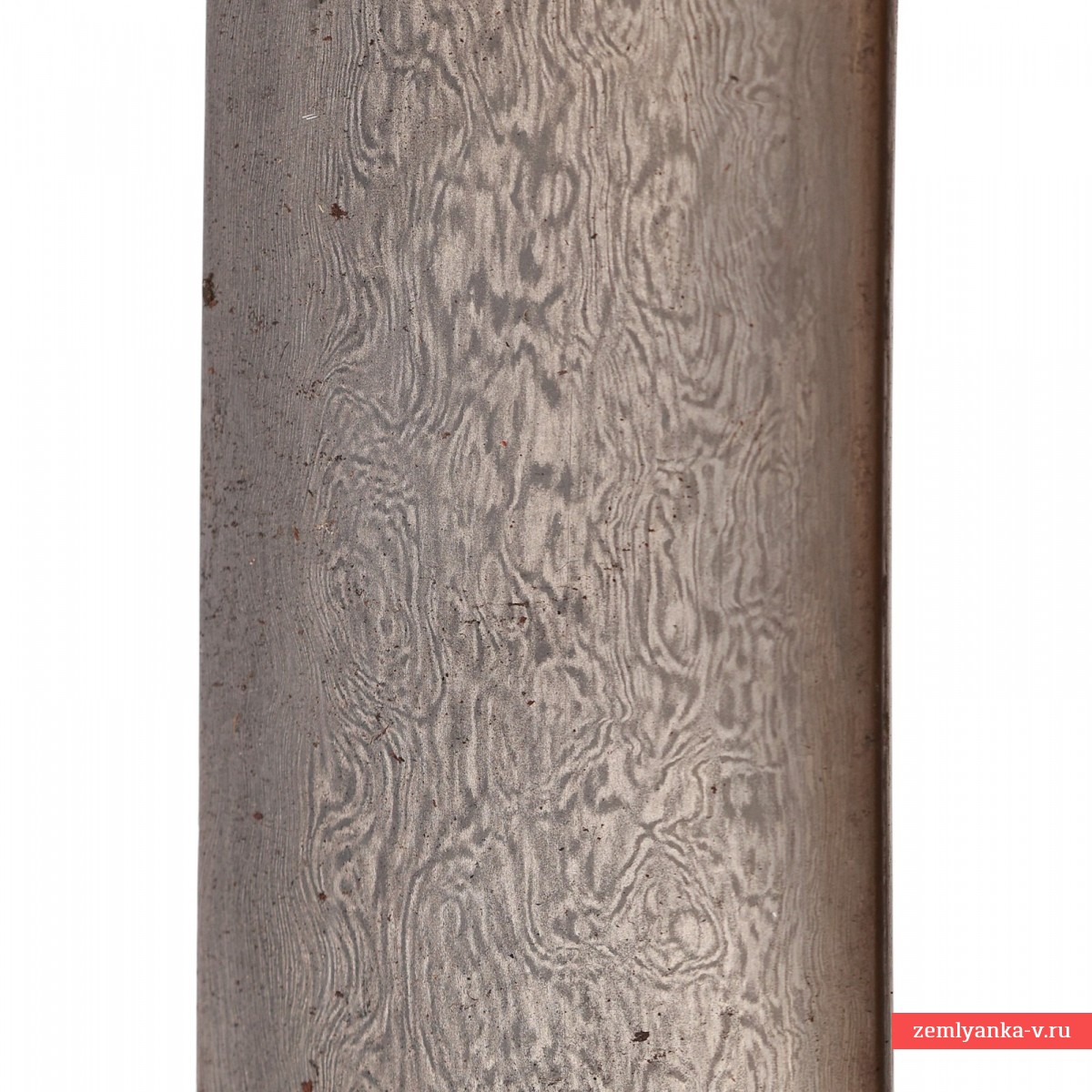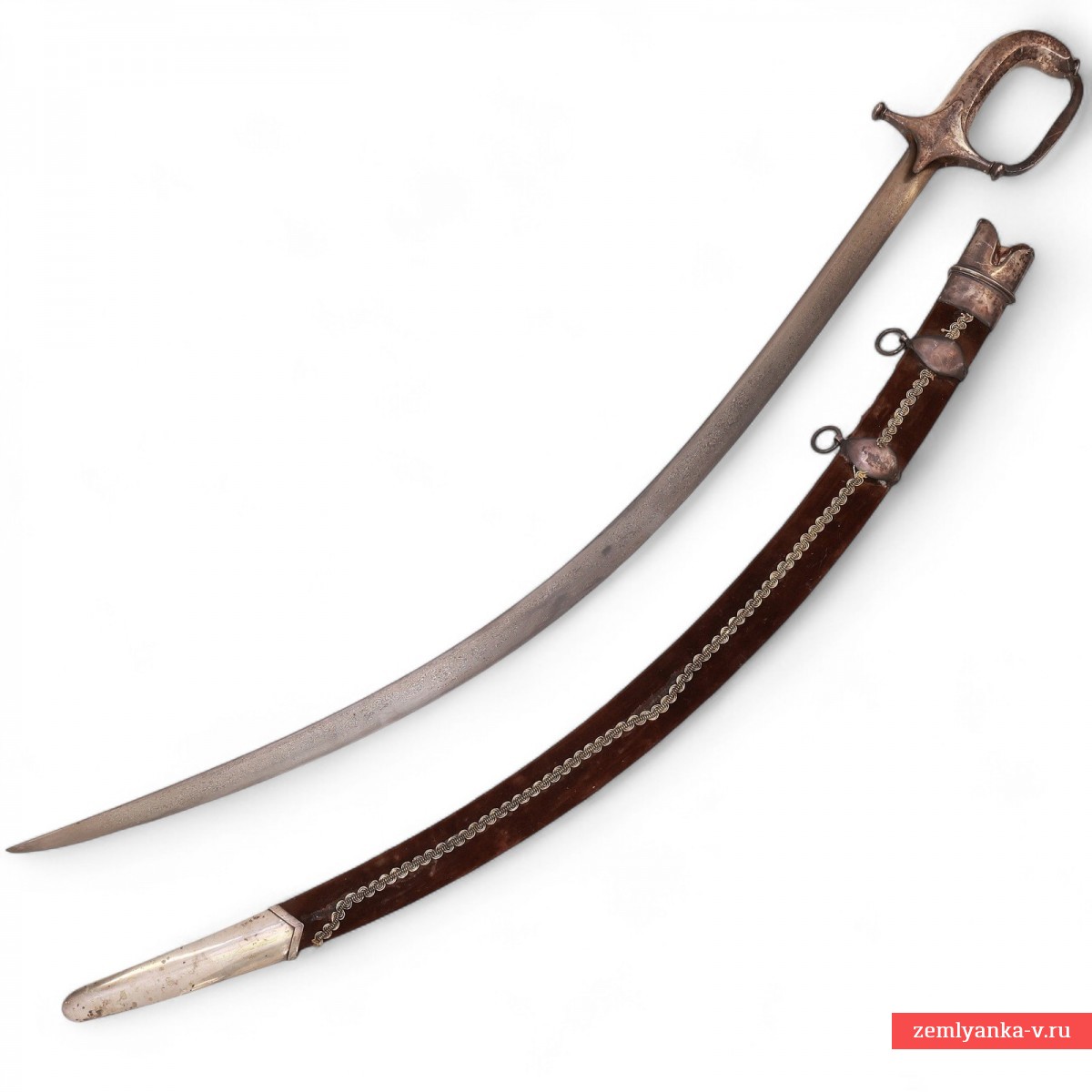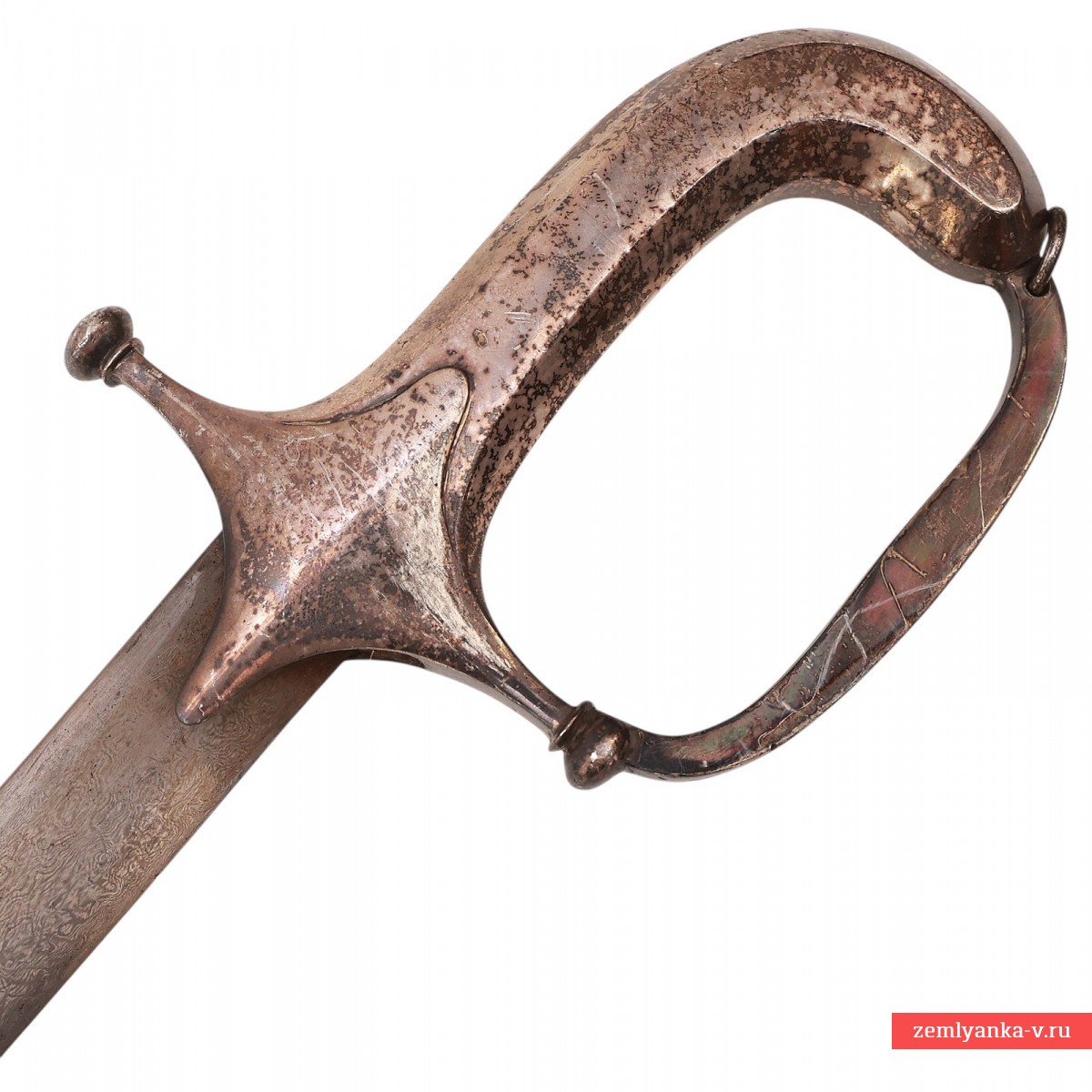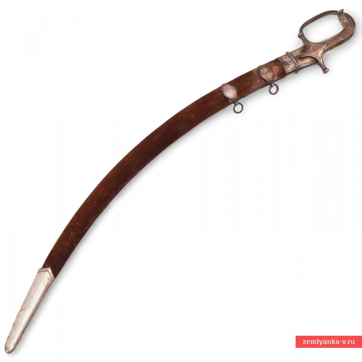 Весьма редкая сабля в прекрасном коллекционном состоянии. Клинок изготовлен из дамасской стали типа «шам», значительно изогнутый, однолезвийный, плоский без долов. Эфес цельнометаллический, состоит из рукояти и гарды. Рукоять прямая с гранями, плавно переходит в головку под прямым углом. Гарда образована одной D-образной защитной дужкой, которая плавно переходит в крестовину с декоративным расширением в центре, которое выполнено в виде четырёхугольной звезды. Концы крестовины в виде приплюснутых шариков. В дужке имеется отверстие, в которое вставлено подвижное кольцо. Ножны деревянные, обтянутые красным бархатом, с металлическим прибором, состоящим из накладного устья, двух массивных обоймиц с подвижными кольцами для портупеи и наконечника. Прибор ножен и эфес серебряные (?).