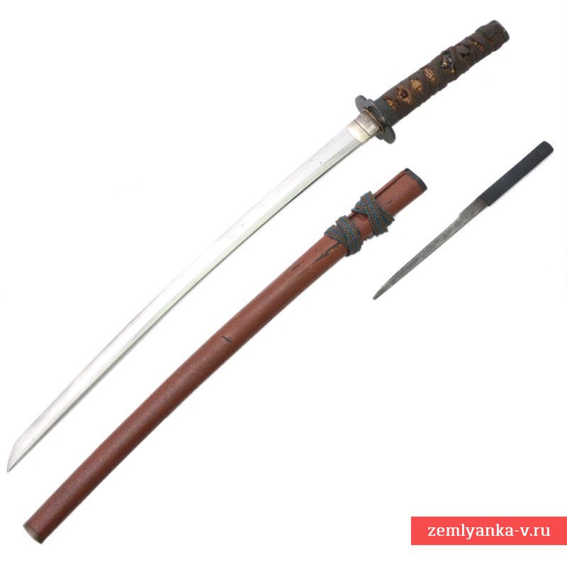 Крайне редкий образец японского оружия, представляющий собой миниатюрную копию меча-катаны в оправе «косираэ» стиля «букэ-дзукури». Клинок изготовлен мастером Сэтцу дзю Фудзивара Ёсикуни (живущий в провинции Сэтцу Фудзивара Ёсикуни). Данный мастер был достаточно известен в XVII века, происходил из селения Накамура. Первоначально имел творческий псевдоним Ёсинари, позже за свои достижения получил право носить аристократическую фамилию Фудзивара. Пик его активности приходился на 1661-1673 гг. Мечи его работы считаются «вадзамоно», т.е. имеют высший статус оценки. Рукоять деревянная, покрыта кожей ската «самэ», оплетена шнуром. «Мэнуки» редкого типа, выполнен в виде фигуры бегущего кабана. Бытовой нож «ко-гатана» выполнен двумя мастерами: рукоять мастером Минамото Корэкацу, клинок – Рай Канэсигэ.