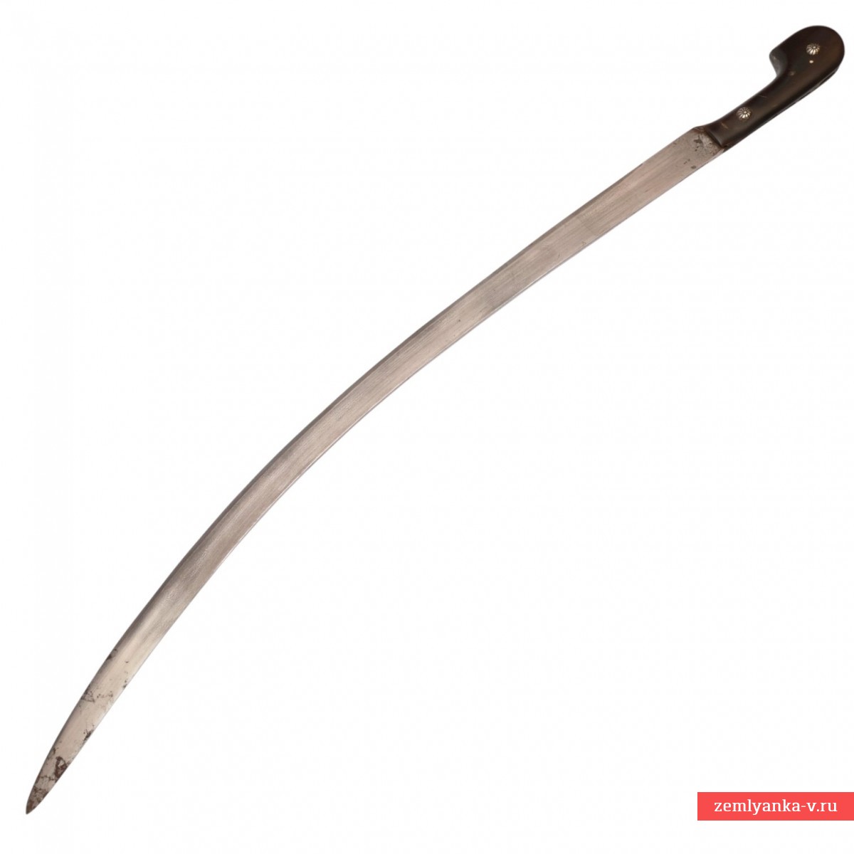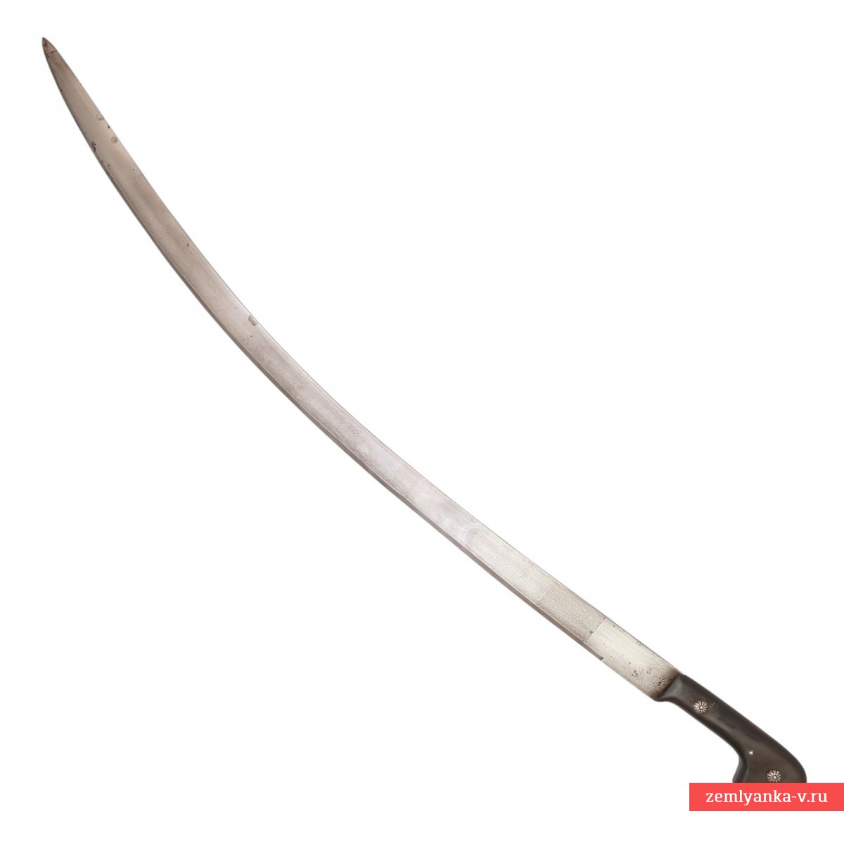 Оригинальная шашка в хорошем коллекционном состоянии. Клинок изготовлен из дамасской стали (?), незначительно изогнутый, однолезвийный, плоский, без долов, боевой конец двулезвийный. Эфес состоит только из рукояти с раздвоенной головкой. Рукоять изготовлена из рога и крепится к черенку клинка при помощи двух заклёпок, которые закрывают декоративные накладки. Ножны отсутствуют.