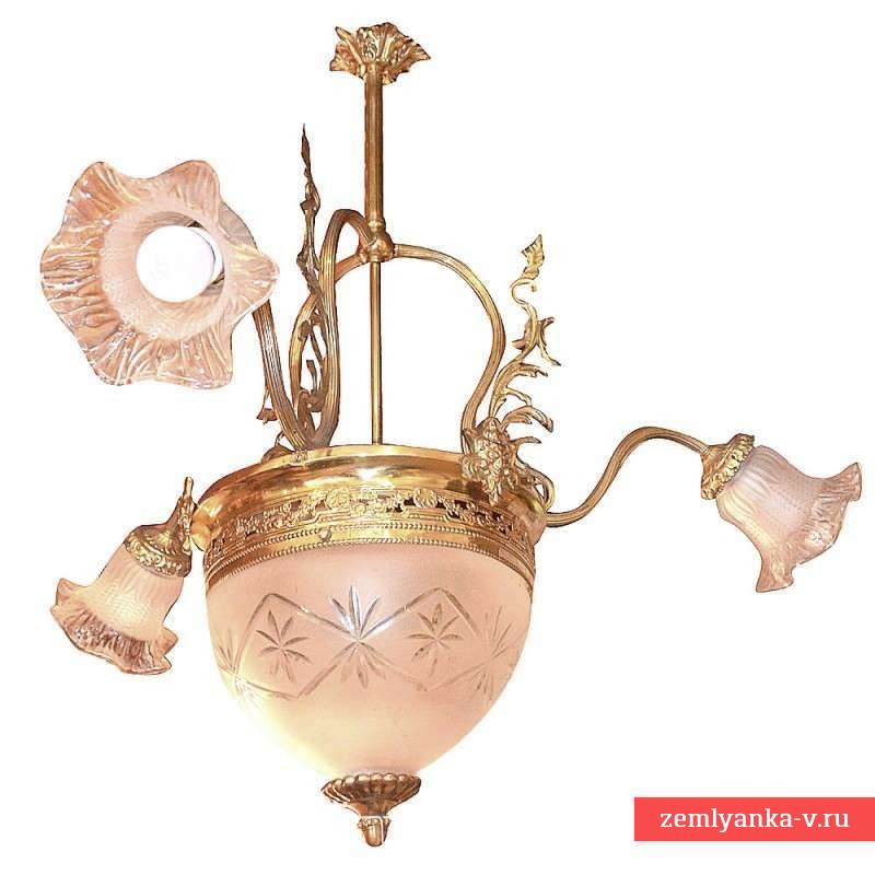 Бронза, стекло, золочение. Очень изящная работа. Люстра в очень хорошем коллекционном состоянии, полностью оригинальный сбор. Массивная. Высота около 60 см. Плафоны, изображенные на последнем фото, в комплекте. Оригинал.