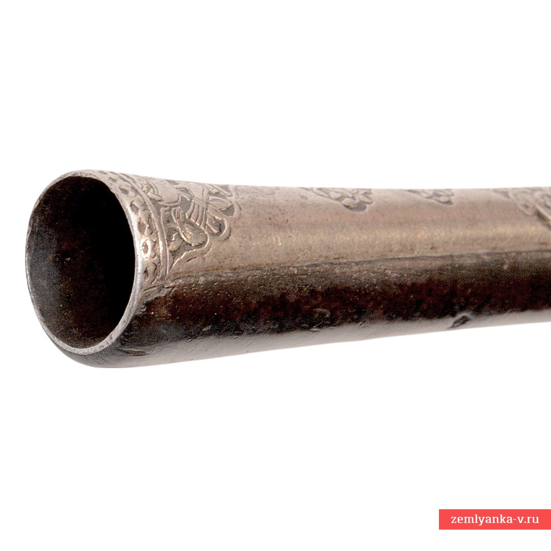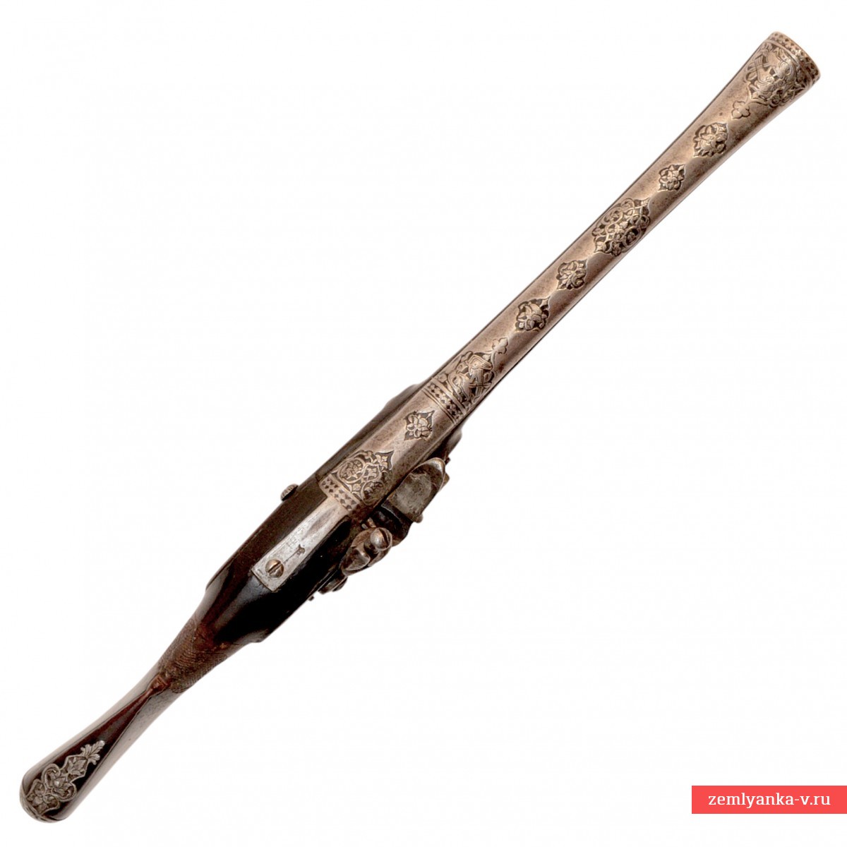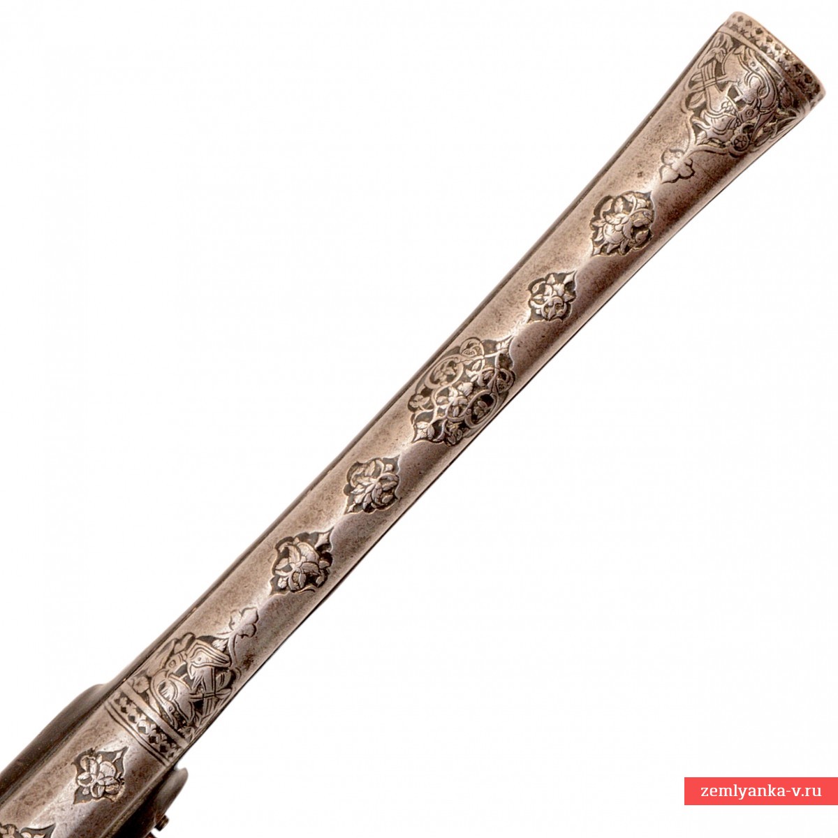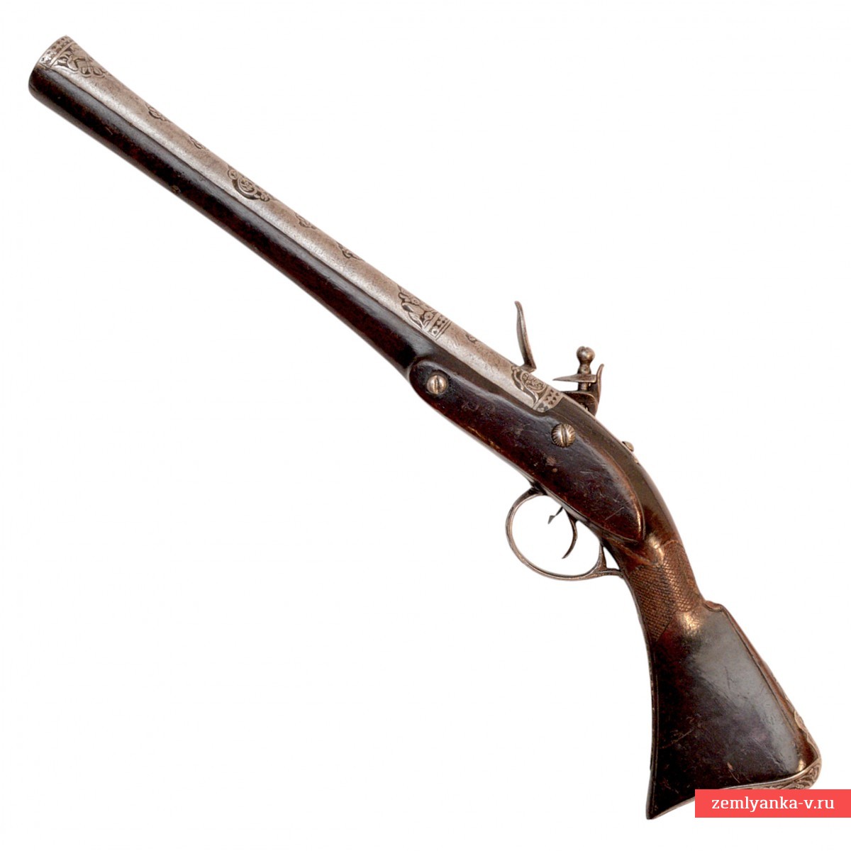 Оригинальный и достаточно редкий мушкетон в очень хорошем коллекционном состоянии. Сталь, дерево. Дульный срез ствола с раструбом, предназначенным для облегчения засыпания пороха во время качки на море или стрельбы с лошади. Верхняя часть ствола украшена изображениями растительных композиций. Замок кремневый, французского батарейного типа. Такой тип замка был создан в 1610 г. французским оружейником из Лизье (Нормандия) Марэн Ле Буржуа (1550—1634) гг. Он был на порядок надежнее колесцового, благодаря чему распространился по всему миру на следующие три столетия, как основной механизм ручного огнестрельного оружия. Чтобы подготовить такой замок к выстрелу, стрелок был должен (зарядив собственно оружие, то есть, забив в ствол пороховой заряд, пулю и пыж) поставить курок на предохранительный взвод; открыть крышку полки; если нужно, прочистить затравочное отверстие; насыпать на полку небольшую порцию пороха; закрыть крышку; поставить курок на боевой взвод. Ложа деревянная, цевье на всю длину ствола. Шейка приклада украшена перекрестной насечкой. Спусковая скоба стальная, овальной формы. Тыльник приклада стальной, Г-образный, украшен глубокой гравировкой.