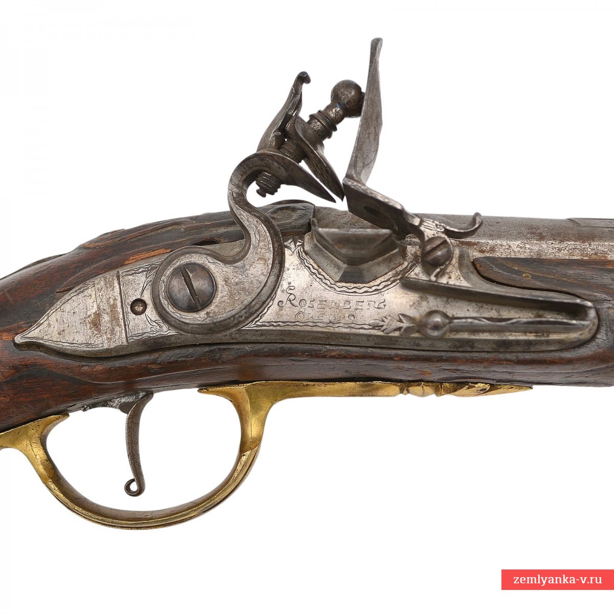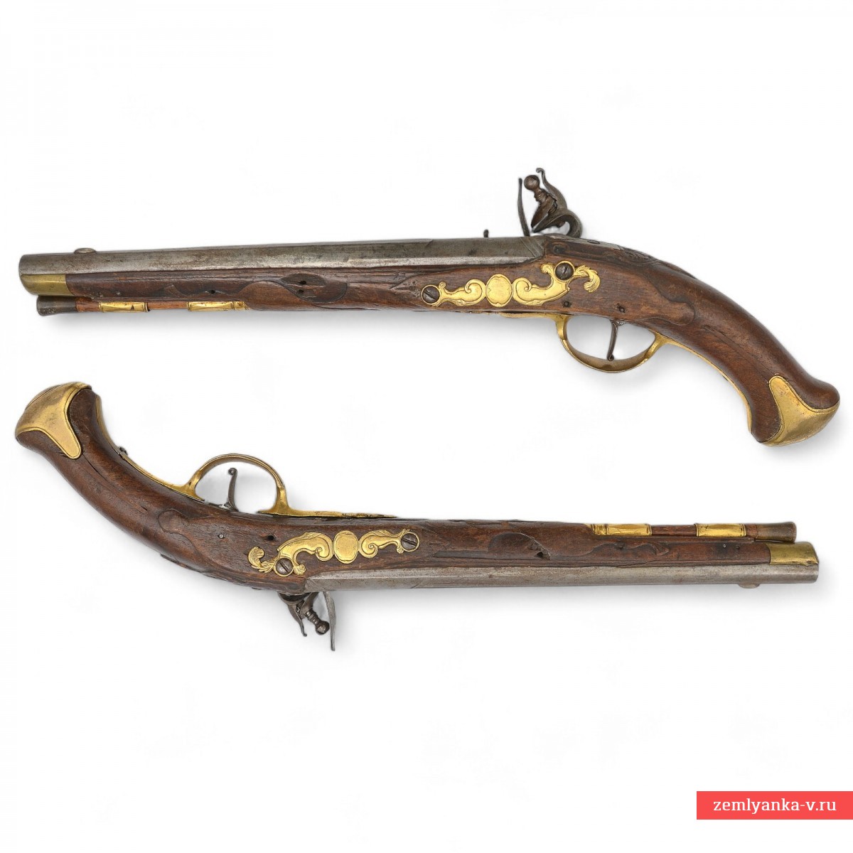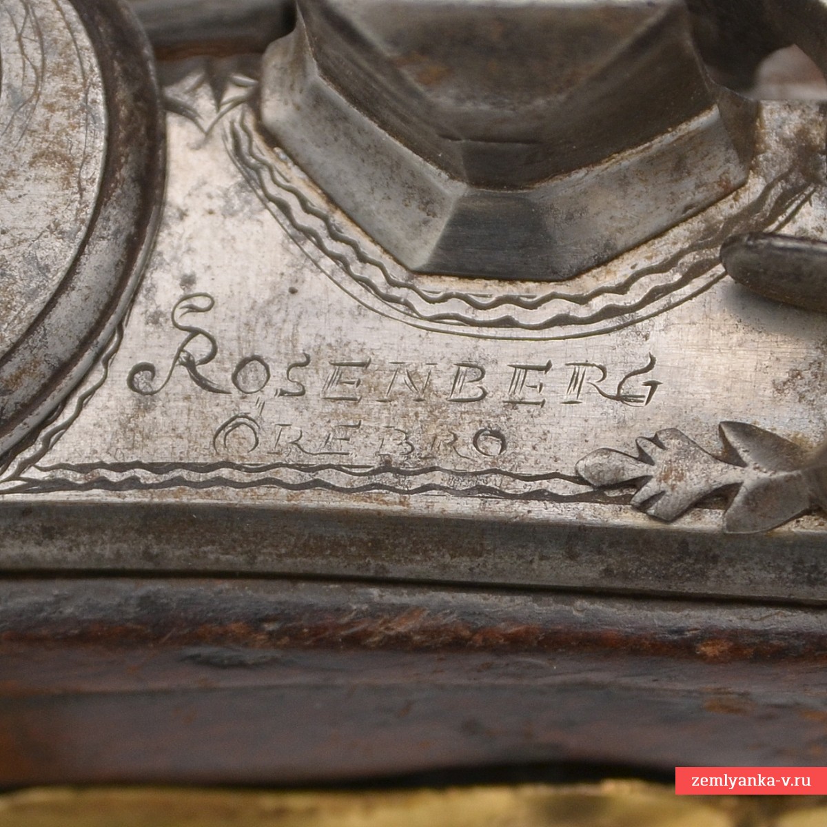 Крайне редкие массивные кавалерийские пистолеты в очень хорошем коллекционном состоянии. Об офицерской принадлежности оружия говорит наличие позолоты на всех латунных частях. Пистолеты снабжены кремневыми замками батарейного типа, установленными в правых частях оружия. В некоторых источниках его называют французский замок, или замок французского типа (образца) из-за того, что его изобретателем считается французский королевский художник и оружейник Марэн ле Буржуа (Marin le Bourgeoys 1550 – 1634) из Нормандского городка Лизье. Изобретатель удачно объединил положительные черты средиземноморского и балтийского замков в единую конструкцию. Замочные доски стальные, гладкие. На каждой доске иглой нанесена надпись «Rosenberg Orebro» в две строки. Согласно справочнику Штокеля, данное клеймо принадлежит Иокиму Розенбергу (.. – 1745 гг) — сыну известного немецкого мастера Юргена Розенберга (1677-1724 гг), работавшему в Штральзунде, Мекленбург. В 1709 году стал полноправным гражданином (бюргером). В период с 1716 по 1725 гг Иоким работал в г. Эребру (Швеция) в качестве оружейного мастера по военным заказам армии Карла XII, что дает возможность точно датировать представленную пару пистолетов эпохой Северной войны. На внутренней стороне замков пробито инспекторское (?) клеймо в виде короны. Ложи деревянные, цевье на всю длину ствола. В цевье вложены деревянные шомполы. Пистолеты всегда приобретались парами и носились в седельных сумах, т.н. «ольстрах». Пример подобного ношения можно видеть на портрете Карла XII в ленте лота. Редкость музейного уровня, настоящая находка для любой частной или музейной коллекции, посвященной Северной войне или Петру I.