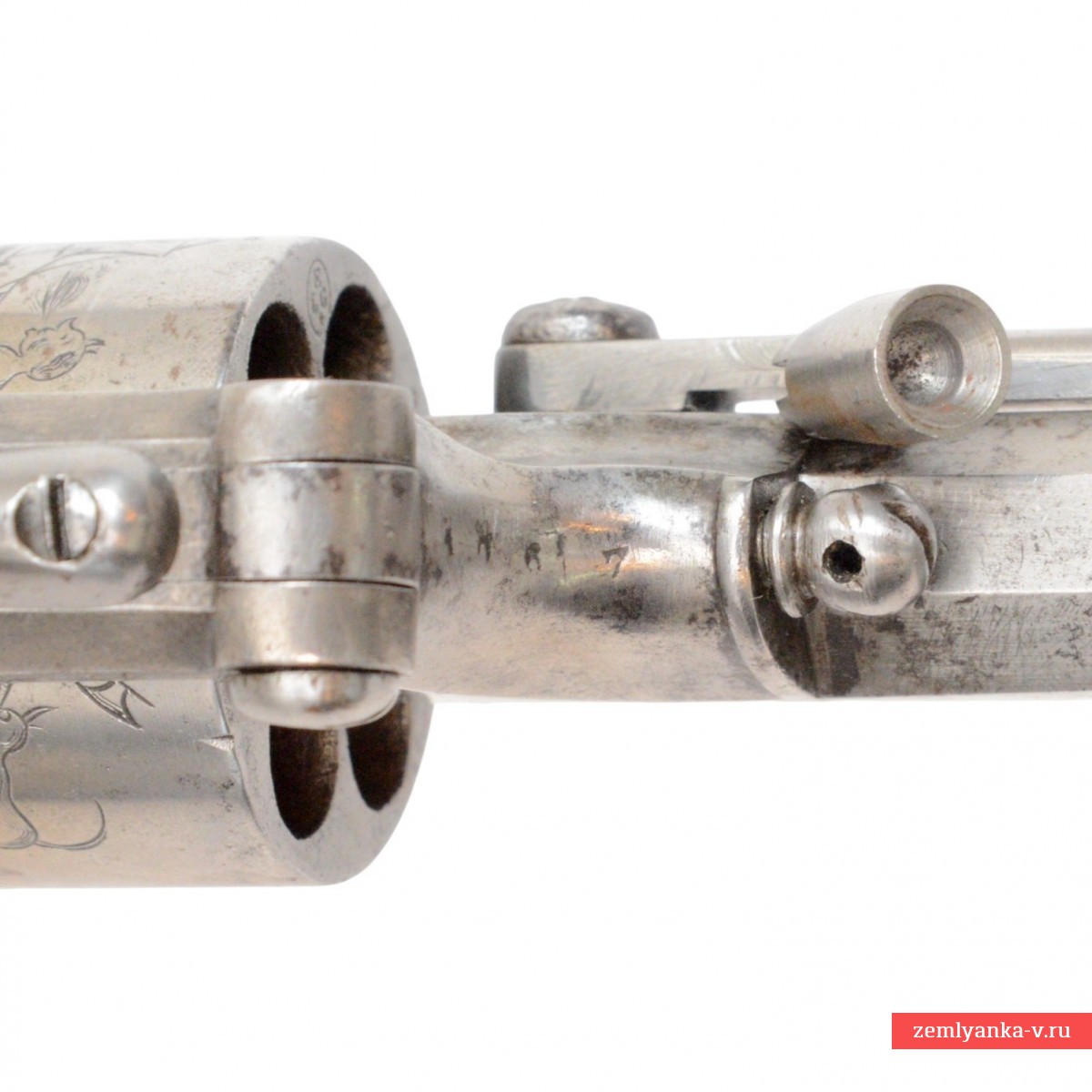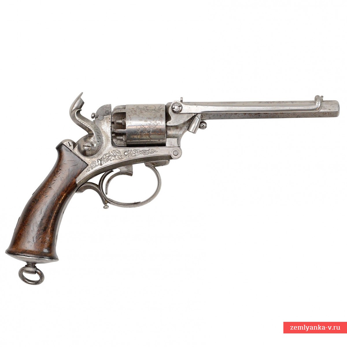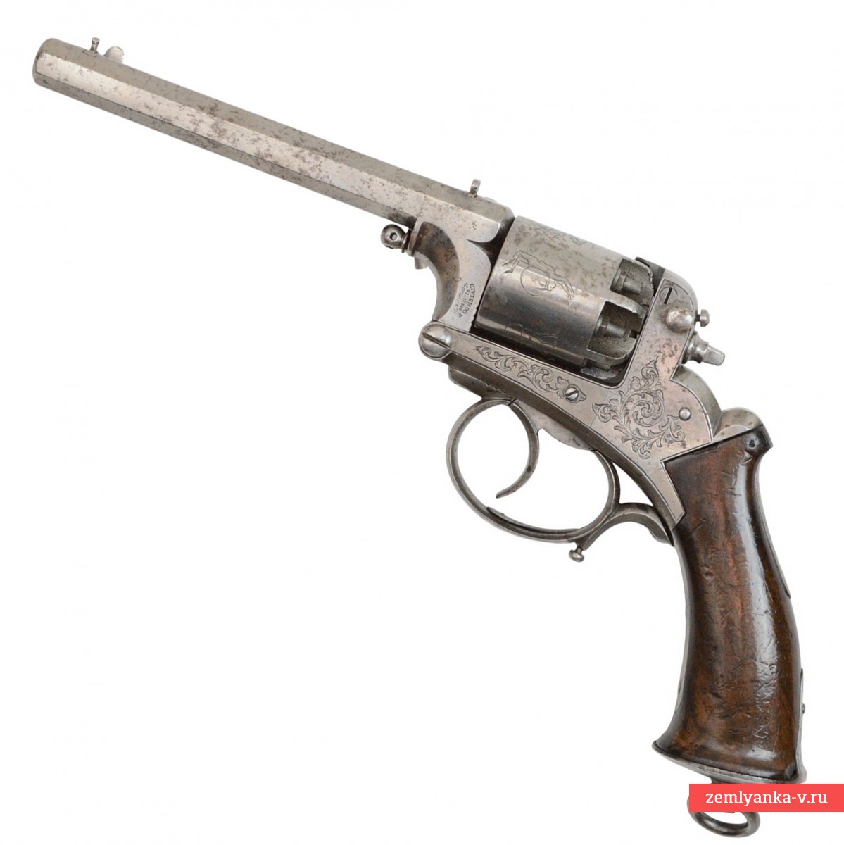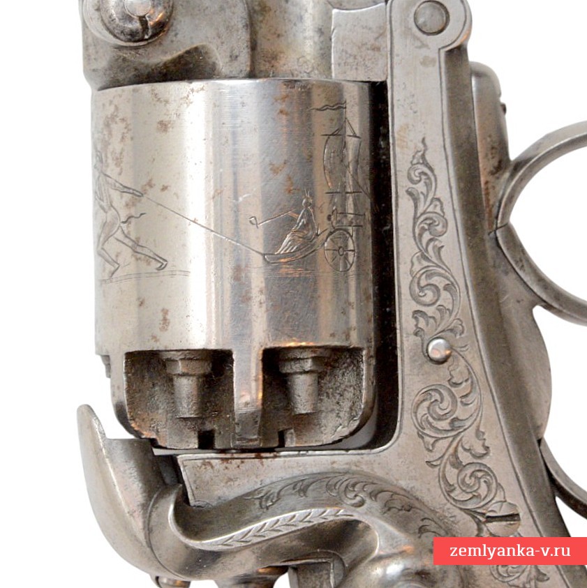 Очень интересный по своей конструкции и исполнению капсюльный револьвер в прекрасном состоянии. Револьвер имеет нарезной 8-гранный в сечении ствол с установленным на правой вертикальной грани пыжевателем Рута. Он имел двойное назначение: с одной стороны им запрессовывали пули в каморы, а с другой стороны рычаг был ключом под головку оси. Им можно было вкручивать-выкручивать и чинить ось при уходе за револьвером и снимать барабан.