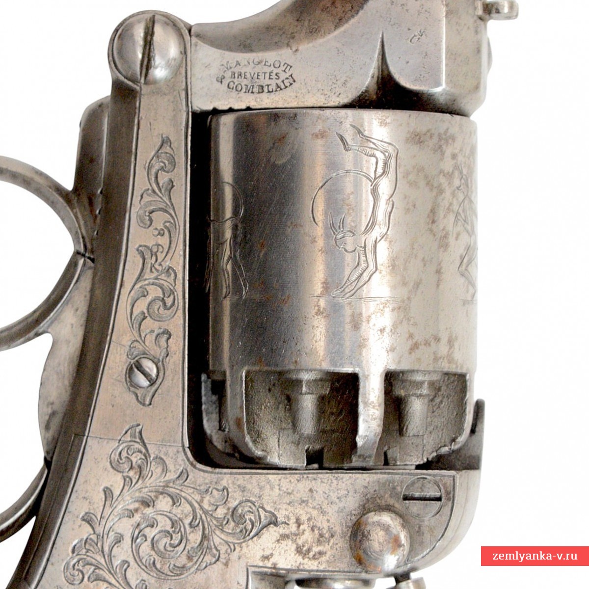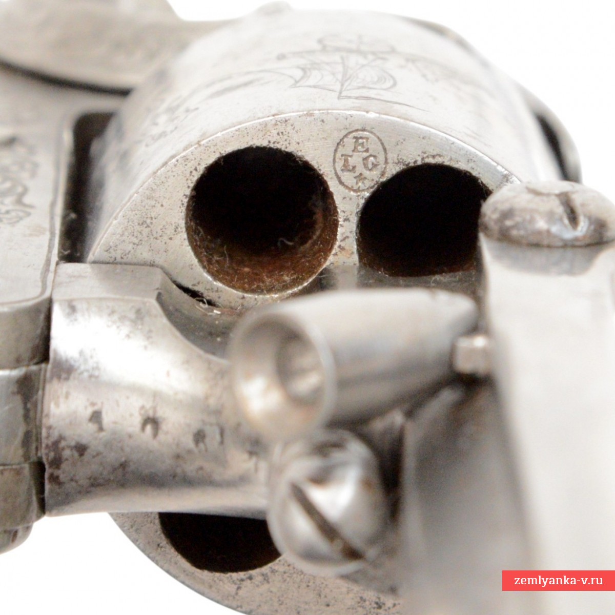 Барабан гладкий, на 6 камор. В тыльной торцевой части барабана пробито клеймо «E.L.G.» над звездой в овале– клеймо Льежской оружейной фабрики. В данном клейме буква «Е» означает «epreve», а буквы «L» и «G», в отличие от клейма испытаний стволов-заготовок, имеют другое происхождение и взяты из городского девиза Льежа «Libertas Gentis» — «Свобода народа». Данное клеймо наносилось на готовое оружие, собранное в период между 20 февраля 1811 года и 11 июля 1893 года. Имеются противоречивые данные по времени применения этого клейма в качестве приемного: с 18 мая 1811 г. по 14 сентября 1813 г.; с 18 августа 1818 (?) г. по 11 июля 1893 г.; с 8 сентября 1846 г. по 11 июля 1893 г. (из других источников — с 1845 по 1893 гг.) с 11 июля 1893 г. по настоящее время — для дульнозарядных ружей. Вариант этого клейма с многолучевой звездой наносился на готовое гладкоствольное оружие, собранное в период между 14 сентября 1813 года и 18 августа 1818 (?) года.