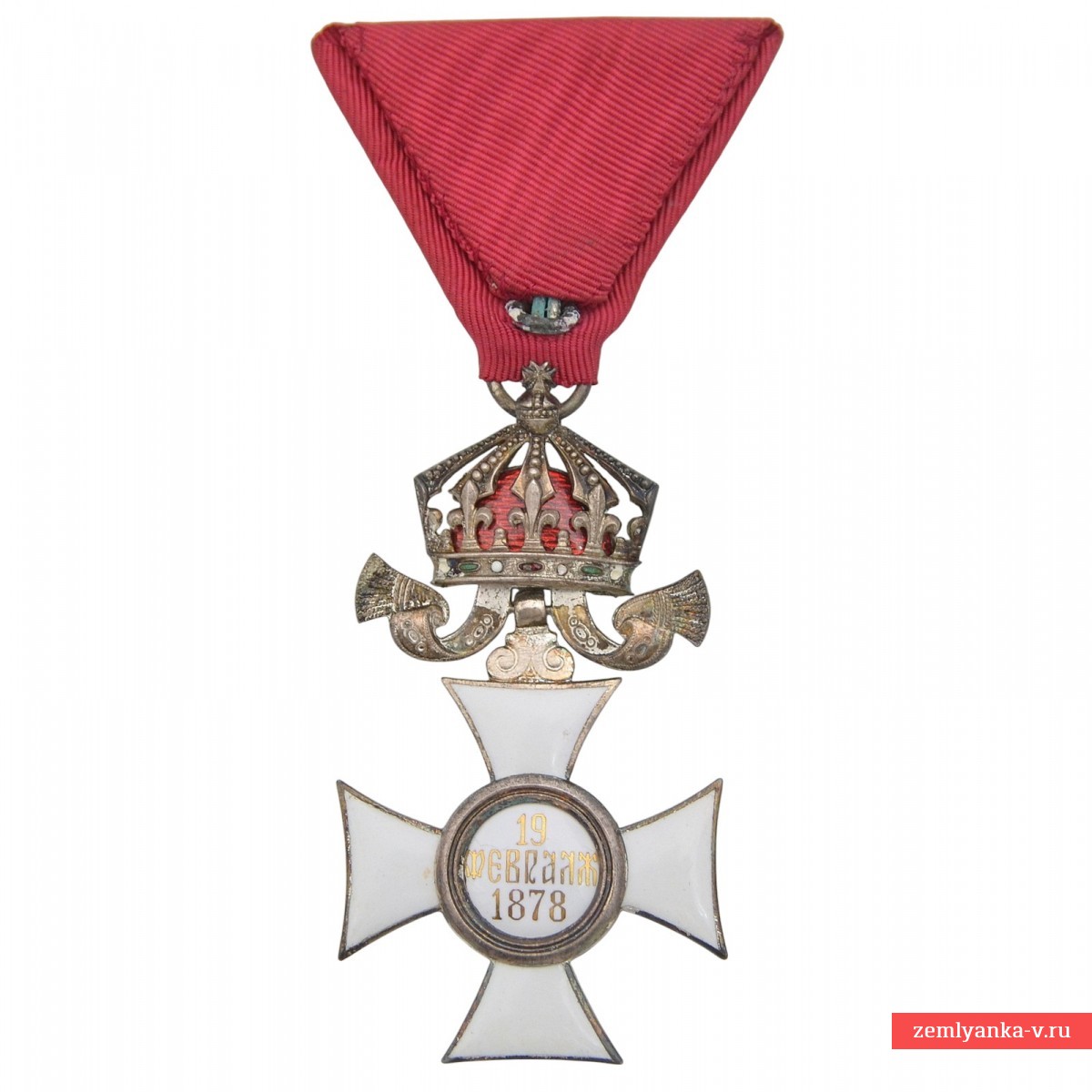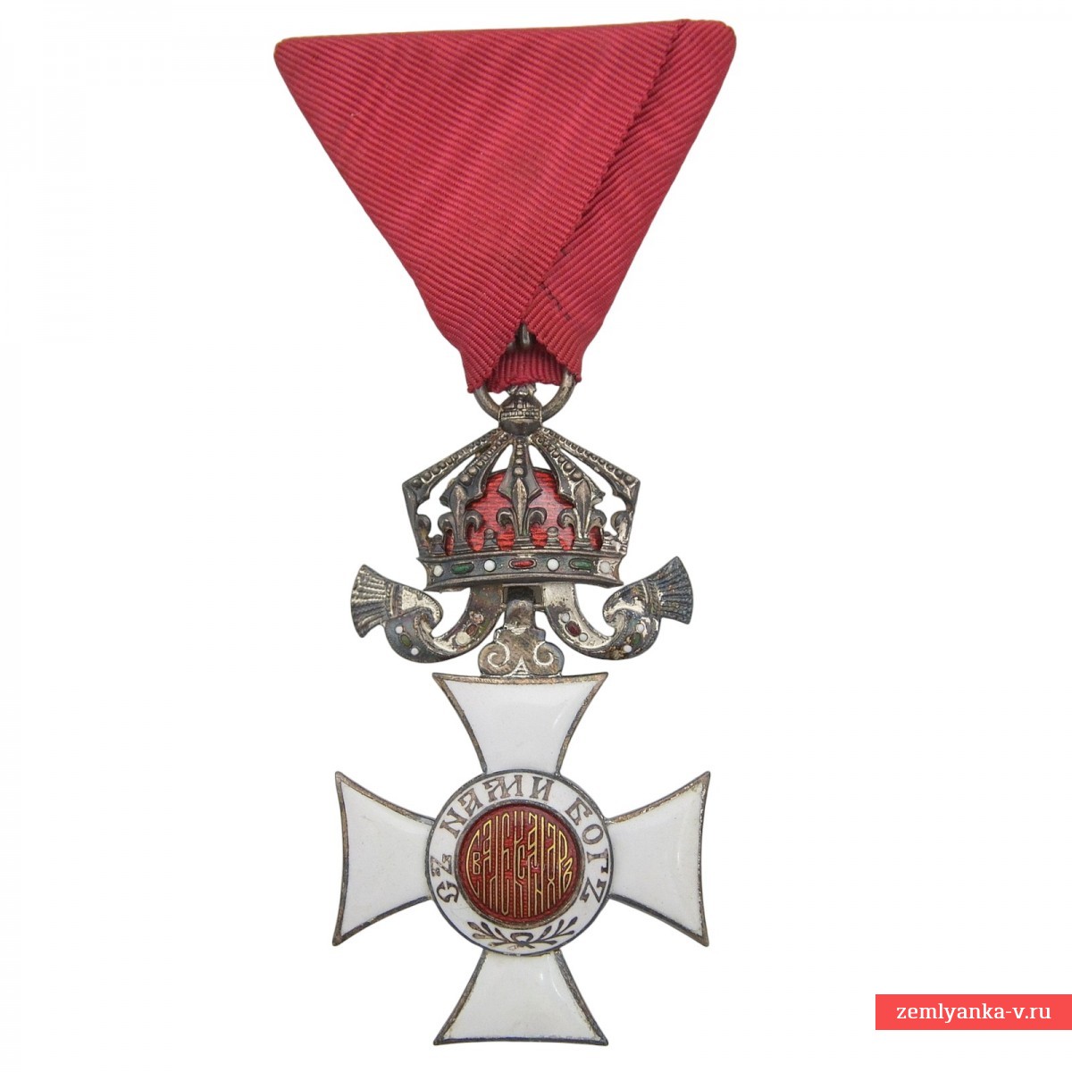 Оригинальный орден в отличном коллекционном состоянии. Серебро, штамповка, эмаль, серебрение. Поверхностный скол эмали на шесть часов. Орден представляет собой белый эмалевый крест с золотистой окантовкой. В центральном медальоне на красном фоне расположена надпись старославянской вязью «СВ. АЛЕКСАНДРЪ». Медальон окружен белым кольцом с золотистым девизом ордена «СЪ НАМИ БОГЪ» (С нами Бог). Лента муаровая красного цвета, сложенная треугольником (традиционная форма для болгарских и австро-венгерских наград). Награда с мечами над крестом, что указывает на вручение за военные заслуги в мирное время. Гарантия подлинности.