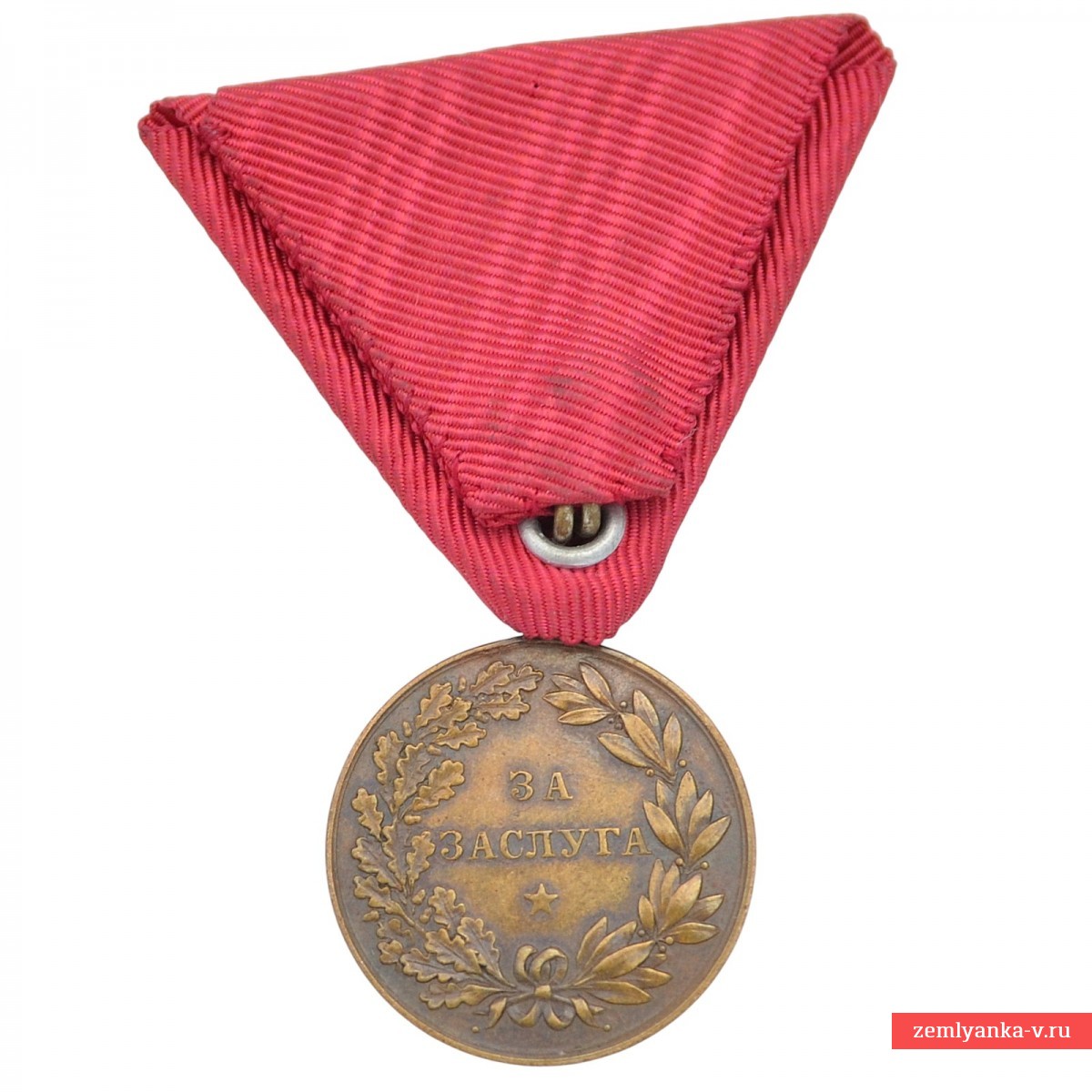 Медаль была учреждена в 1881 году и вручалась за выдающиеся заслуги перед болгарской нацией и короной. Аверс (лицевая сторона): изображен профиль правящего монарха Фердинанда I, с надписью на болгарском языке по окружности: «ФЕРДИНАНДЪ I КНЯЗЬ НА БЪЛГАРИЯ» ( «Фердинанд I Князь Болгарии»). Лик «молодая голова». Без подписи медальера. Реверс (обратная сторона): в центре расположена надпись «ЗА ЗАСЛУГА» ( «За заслуги», болг.) в две строки, окруженная венком из дубовых и лавровых листьев, связанных лентой, и пятиконечной звездой внизу (эта сторона не видна на изображении, но является стандартной для медали). Награда на оригинальной колодке. Изначально медаль вручалась на малиновой ленте, но позже было одобрено использование ленты ордена «За храбрость» (красной) для заслуг во время войны и на поле боя.