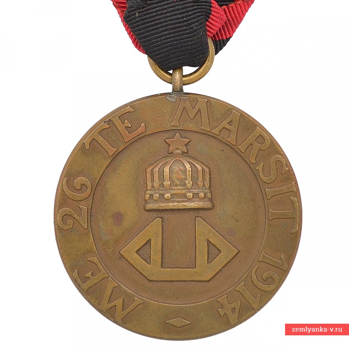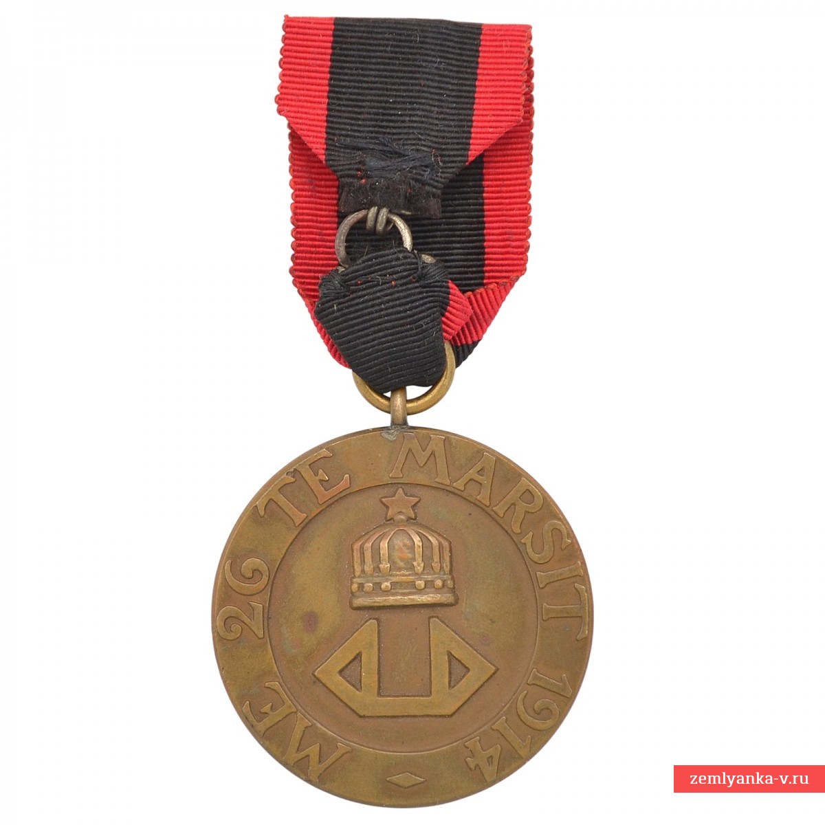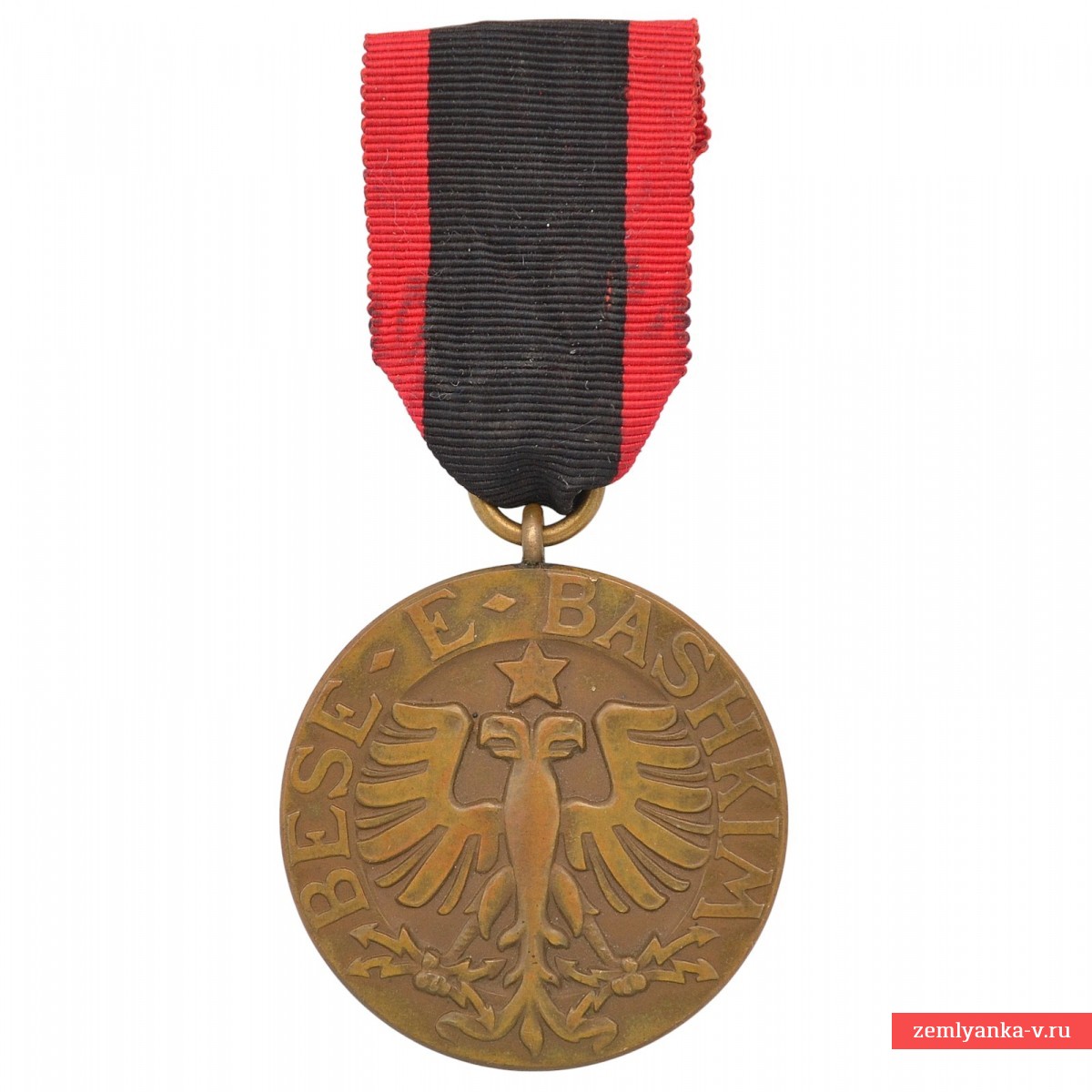 Редкая медаль в отличном коллекционном состоянии. Бронза, штамповка, патинирование. На колодке с оригинальной лентой. Редкая медаль, существовавшая всего около 6 месяцев, учреждена она была 26 марта 1914 году князем Албании Вильгельмом Видом, а упразднена 5 сентября 1914 года. Бронза., штамповка. Диаметр 37 мм. На аверсе изображение двуглавого орла увенчанного пятиконечной звездой (герб Албании) держащего в своих когтях пучки молний, надпись на албанском языке по окружности «BESE E BASHKIM» ( «ПРЕДАННОСТЬ И ЕДИНСТВО», алб.). На реверсе изображение вензеля князя Албании Вильгельма Вида (годы правления 7 марта — 3 сентября 1914 года) в виде буквы «W» (от имени «ВИЛЬГЕЛЬМ») увенчанной княжеской короной с пятиконечной звездой. Надпись по окружности на албанском языке и даты «ME 26 TH MARSIT» ( «26 МАРТА 1914 года», рус.). Редкая. Гарантия подлинности.
