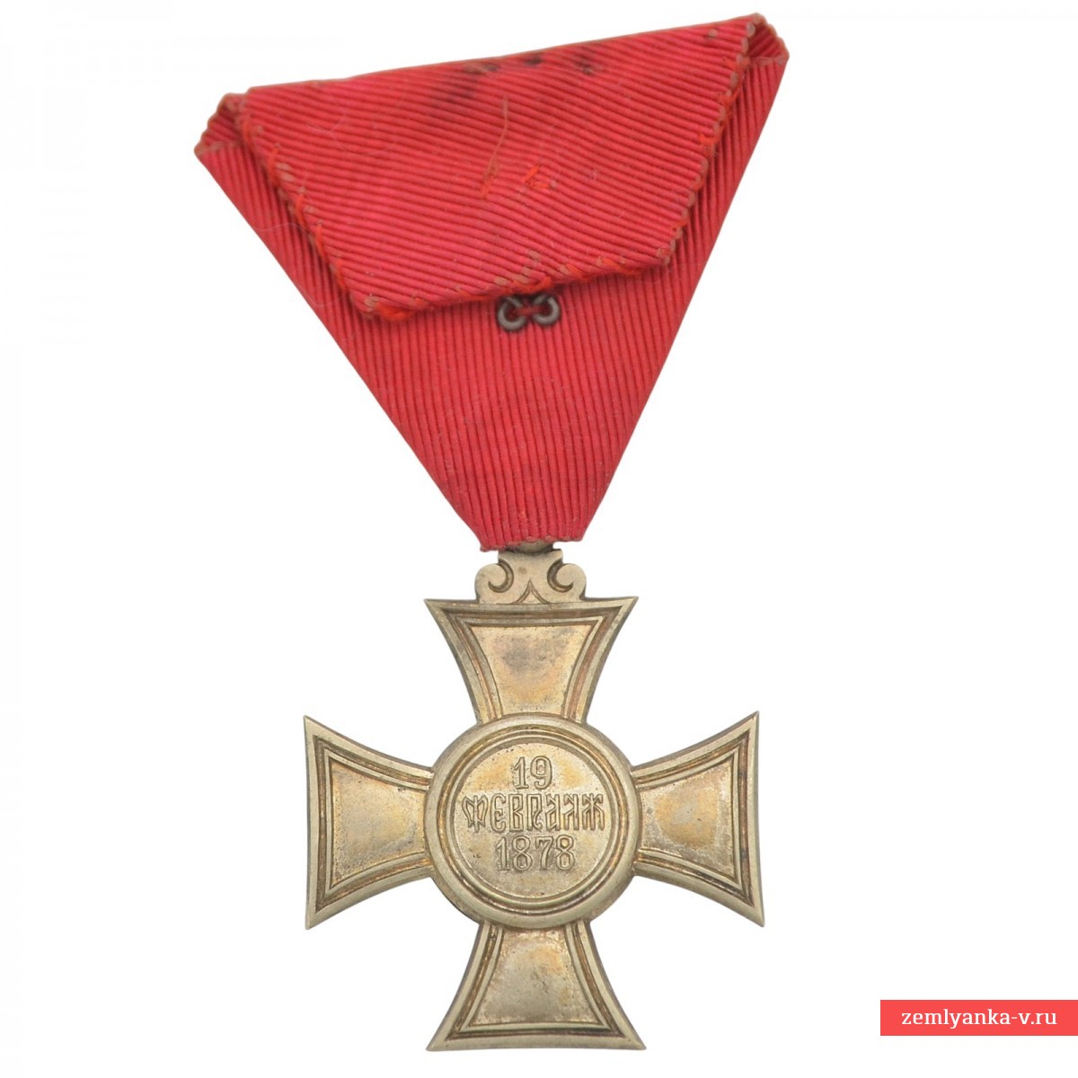 Знак ордена относится к 6-й (низшей) степени Ордена Святого Александра, которая представляла собой серебряный крест (без эмали). В центральном медальоне на реверсе (изображен на фото) указана дата «19 ФЕВРАЛЪ 1878» (19 февраля 1878 года по старому стилю). Эта дата ознаменовала подписание Сан-Стефанского мирного договора, который привел к освобождению Болгарии от османского владычества и созданию автономного Болгарского княжества. Сам орден был учрежден указом князя Александра I Баттенбергского 25 декабря 1881 года. Орден вручался болгарским и иностранным гражданам за выдающиеся гражданские и военные заслуги, а также за лояльную службу монарху и нации. Награда носится на темно-красной (малиновой) ленте, сложенной характерным для российских и некоторых других наград треугольником.