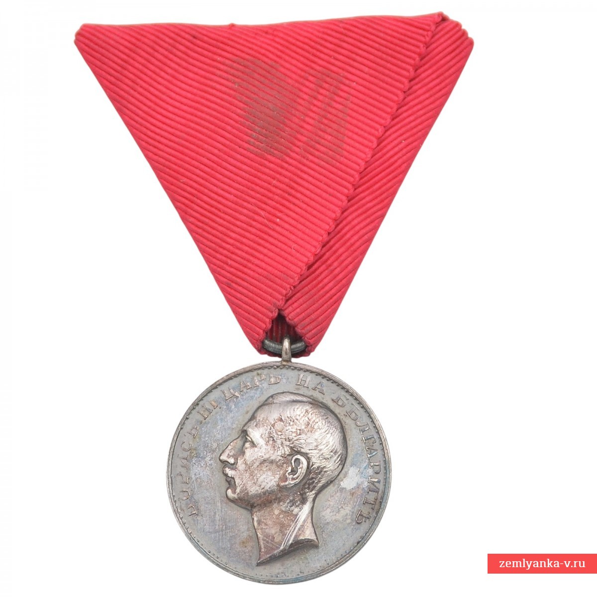 Медаль «За заслуги» была учреждена 25 декабря 1881 года князем Александром I Баттенбергом. Ею награждали как военных, так и гражданских лиц за заслуги перед престолом и Отечеством. Данный тип медали с титулом «Царь» выпускался после провозглашения Болгарии независимым царством в 1908 году. Медаль имела три степени: золотую, серебряную и бронзу. Судя по внешнему виду (светлый металл без короны). Награды носились на треугольной колодке с темно-красной муаровой лентой (лента ордена Святого Александра) для мирного времени. Представленный вариант с портретом Бориса III вручался нижним чинам армии и государственным служащим за преданную службу и заслуги перед отечеством в период его