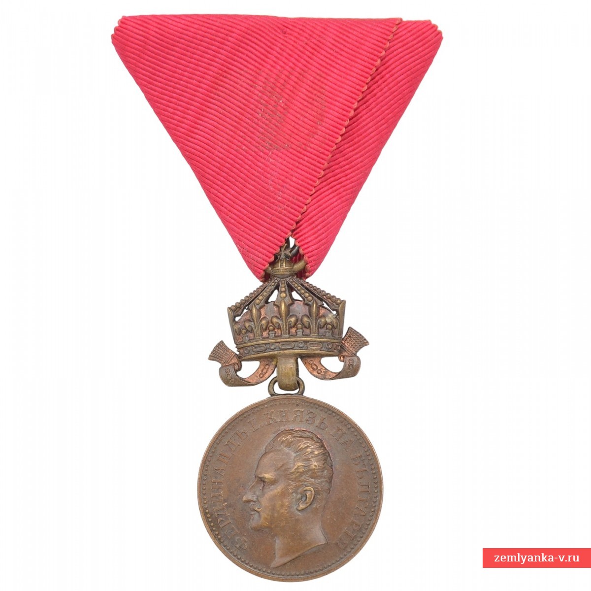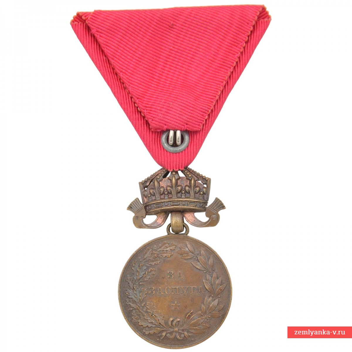 Медаль была учреждена в 1881 году и вручалась за выдающиеся заслуги перед болгарской нацией и короной. Аверс (лицевая сторона): изображен профиль правящего монарха Фердинанда I, с надписью на болгарском языке по окружности: «ФЕРДИНАНДЪ I ЦАРЬ НА БЪЛГАРИТѢ» (Фердинанд I Царь Болгар). Реверс (обратная сторона): в центре расположена надпись «ЗА ЗАСЛУГА» (За заслуги) в две строки, окруженная венком из дубовых и лавровых листьев, связанных лентой, и пятиконечной звездой внизу (эта сторона не видна на изображении, но является стандартной для медали). Награда на оригинальной колодке. Изначально медаль вручалась на малиновой ленте, но позже было одобрено использование ленты ордена «За храбрость» (красной) для заслуг во время войны и на поле боя.