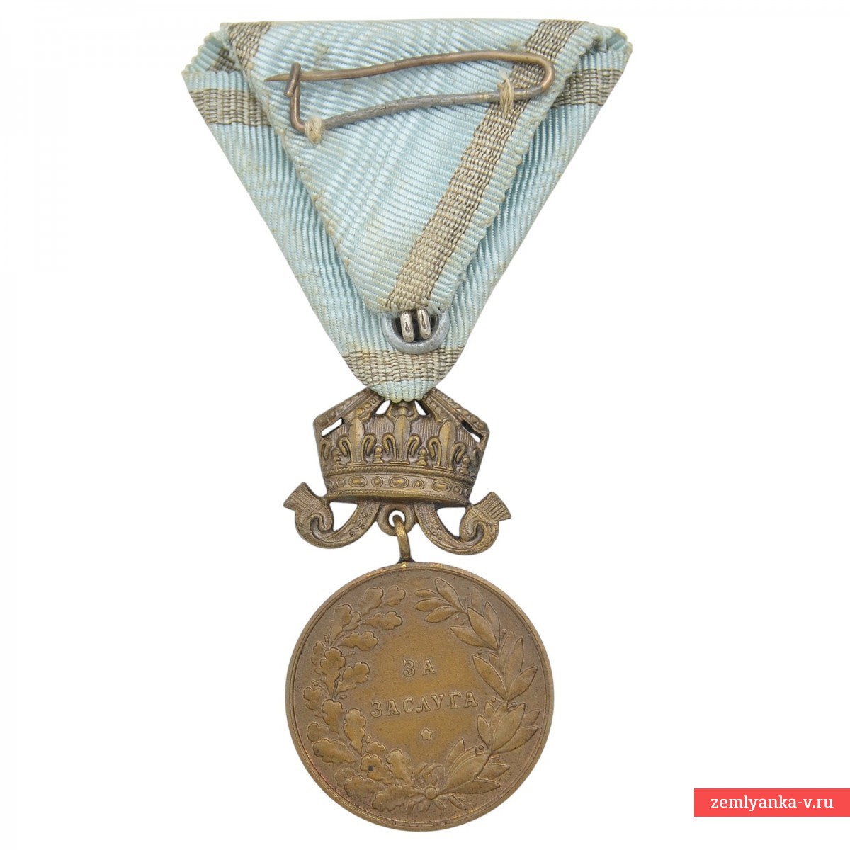 Бронза, штамповка. Эмиссия Бориса III. Медаль была учреждена в 1881 году и вручалась за выдающиеся заслуги перед болгарской нацией и короной. На аверсе (лицевой стороне) медали по окружности расположена надпись на болгарском языке: «БОРИСЪ III ЦАРЪ НА БЪЛГРИТЬ» (рус. «Борис III Царь Болгарии»). Образец, показанный здесь, является редким вариантом, где в слове «БЪЛГАРИТЬ» отсутствует буква «А». Реверс (обратная сторона): в центре расположена надпись «ЗА ЗАСЛУГА» (За заслуги) в две строки, окруженная венком из дубовых и лавровых листьев, связанных лентой, и пятиконечной звездой внизу (эта сторона не видна на изображении, но является стандартной для медали). Награда подвешена на красной ленте. Изначально медаль вручалась на малиновой ленте, но позже было одобрено использование ленты ордена «За храбрость» для заслуг во время войны и на поле боя. Отличное состояние. В комплекте оригинальный футляр. Гарантия подлинности.