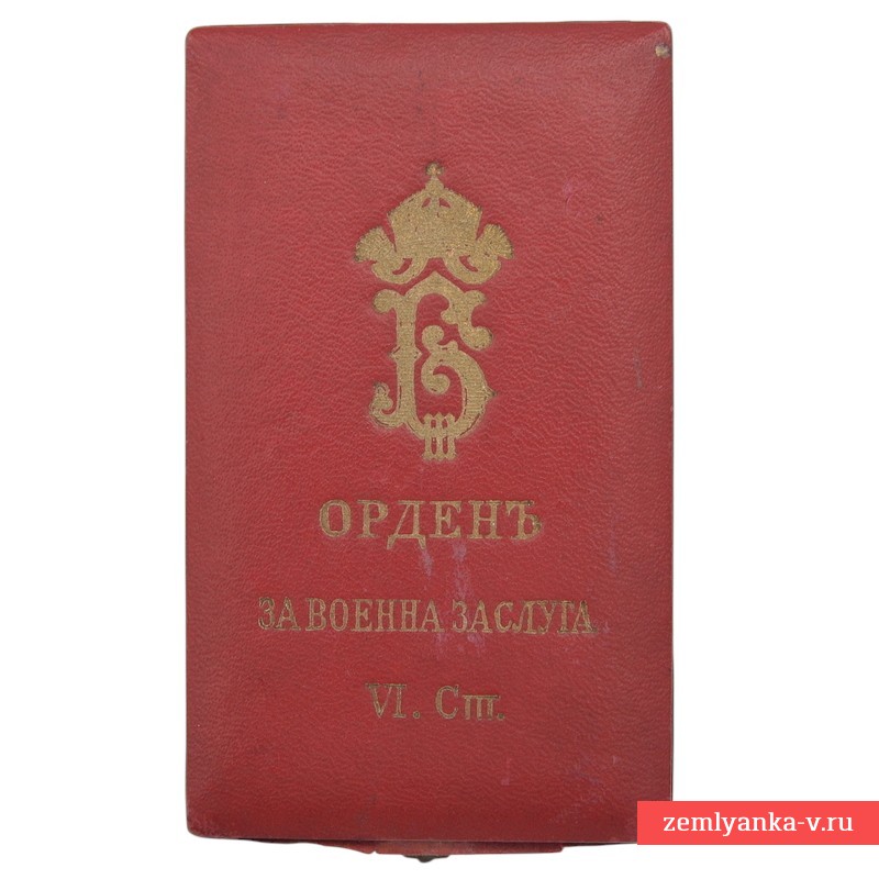 Орден «За военные заслуги» был учрежден князем Фердинандом I (1887-1908 гг.) 18 мая 1900 года. Знаками Ордена награждались военнослужащие Болгарской Армии, Флота и ВВС (с 1912 года), а также гражданские лица, добровольцы и волонтеры за проявленные военные заслуги, как в мирное, так и военное время (в том числе и за прошлые войны; Сербо-болгарская война 1885 года). Награду также могли получить и иностранные подданные. В мирное время лента состояла из белого, желтого и черного цвета, в военное время лента состояла из светло-синего и серебристого цвета (пропущенная по полосе серебряная нить). Всего в Ордене «За военные заслуги» существовало 6 степеней.