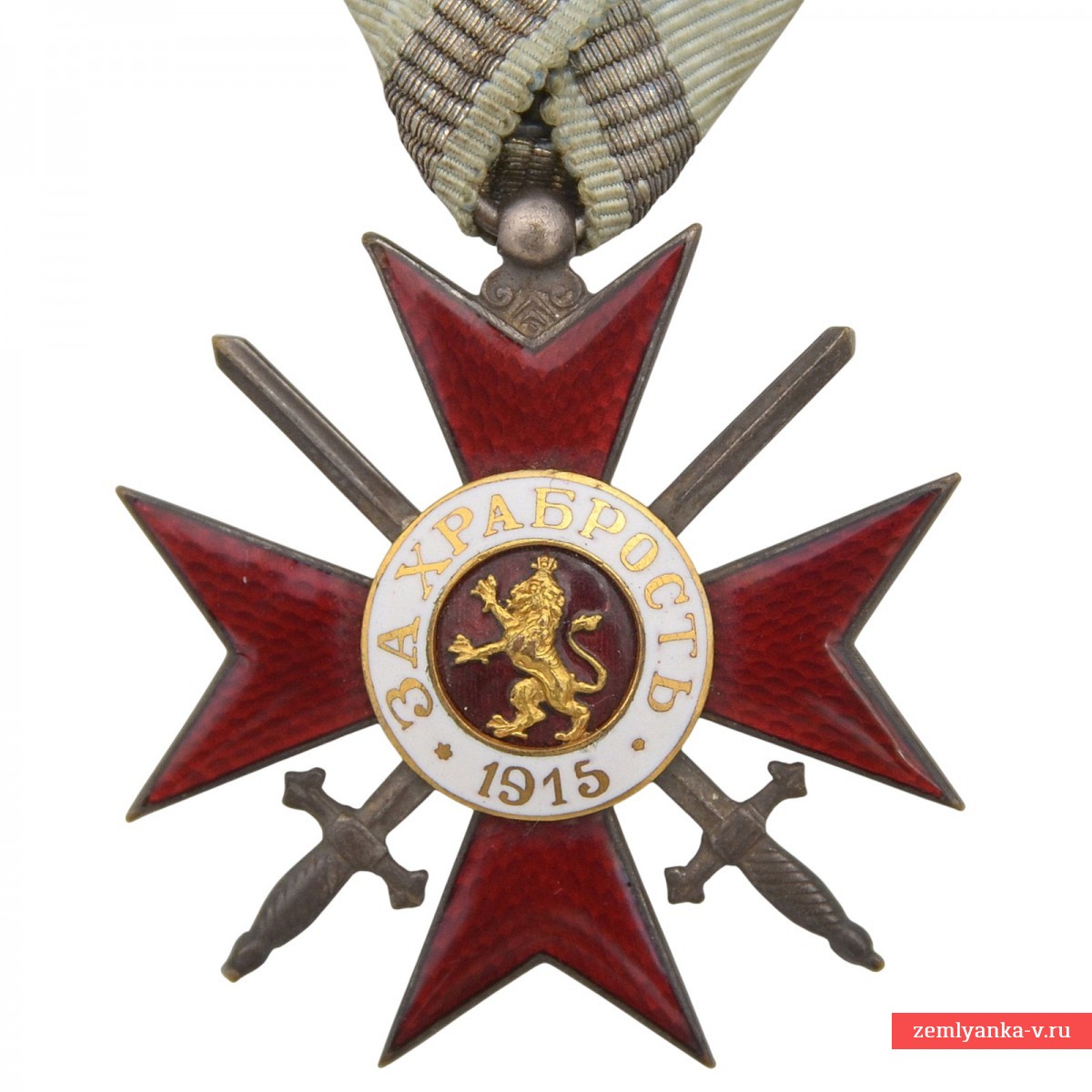 Оригинальный орден в отличном коллекционном состоянии. Бронза, штамповка, эмаль, позолота, серебрение. Футляр в отличном состоянии. Орден представляет собой красный эмалированный крест с белым кольцом вокруг центрального медальона (IV ст.). В центре изображен золотой коронованный болгарский лев. Надпись на болгарском языке: «ЗА ХРАБРОСТЬ» и год 1915. Перекрещенные мечи между лучами креста указывают на то, что награда вручена за боевые заслуги непосредственно на поле боя. Голубая лента с серебристыми полосками по краям — традиционная лента ордена «За храбрость». Редкий. Гарантия подлинности.