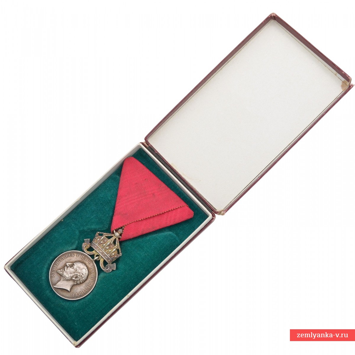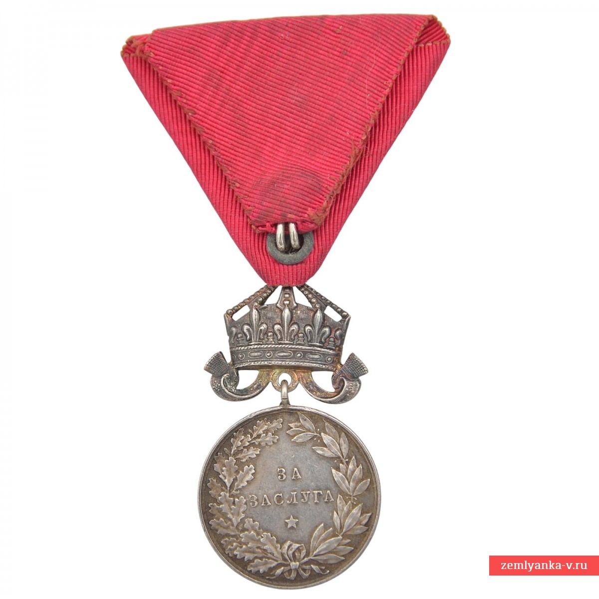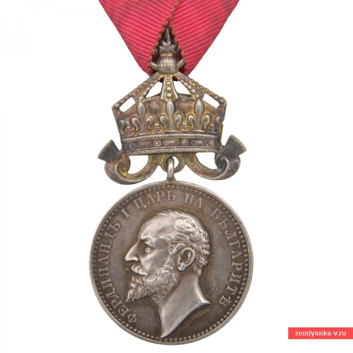 Медаль была учреждена в 1881 году и вручалась за выдающиеся заслуги перед болгарской нацией и короной. Аверс (лицевая сторона): изображен профиль правящего монарха Фердинанда I, с надписью на болгарском языке по окружности: «ФЕРДИНАНДЪ I ЦАРЬ НА БЪЛГАРИТѢ» (Фердинанд I Царь Болгар). Реверс (обратная сторона): в центре расположена надпись «ЗА ЗАСЛУГА» (За заслуги) в две строки, окруженная венком из дубовых и лавровых листьев, связанных лентой, и пятиконечной звездой внизу (эта сторона не видна на изображении, но является стандартной для медали). Награда подвешена на красной ленте. Изначально медаль вручалась на малиновой ленте, но позже было одобрено использование ленты ордена «За храбрость» (красной) для заслуг во время войны и на поле боя. Отличное состояние. Медаль в оригинальном футляре. Эмиссия Фердинанда. Редкая разновидность со знаком медальера и клеймом на гурте. Данный вариант с короной встречается очень редко. Знаки с именем медальера отличаются более высоким качеством изготовления нежели чем знаки без подписи.