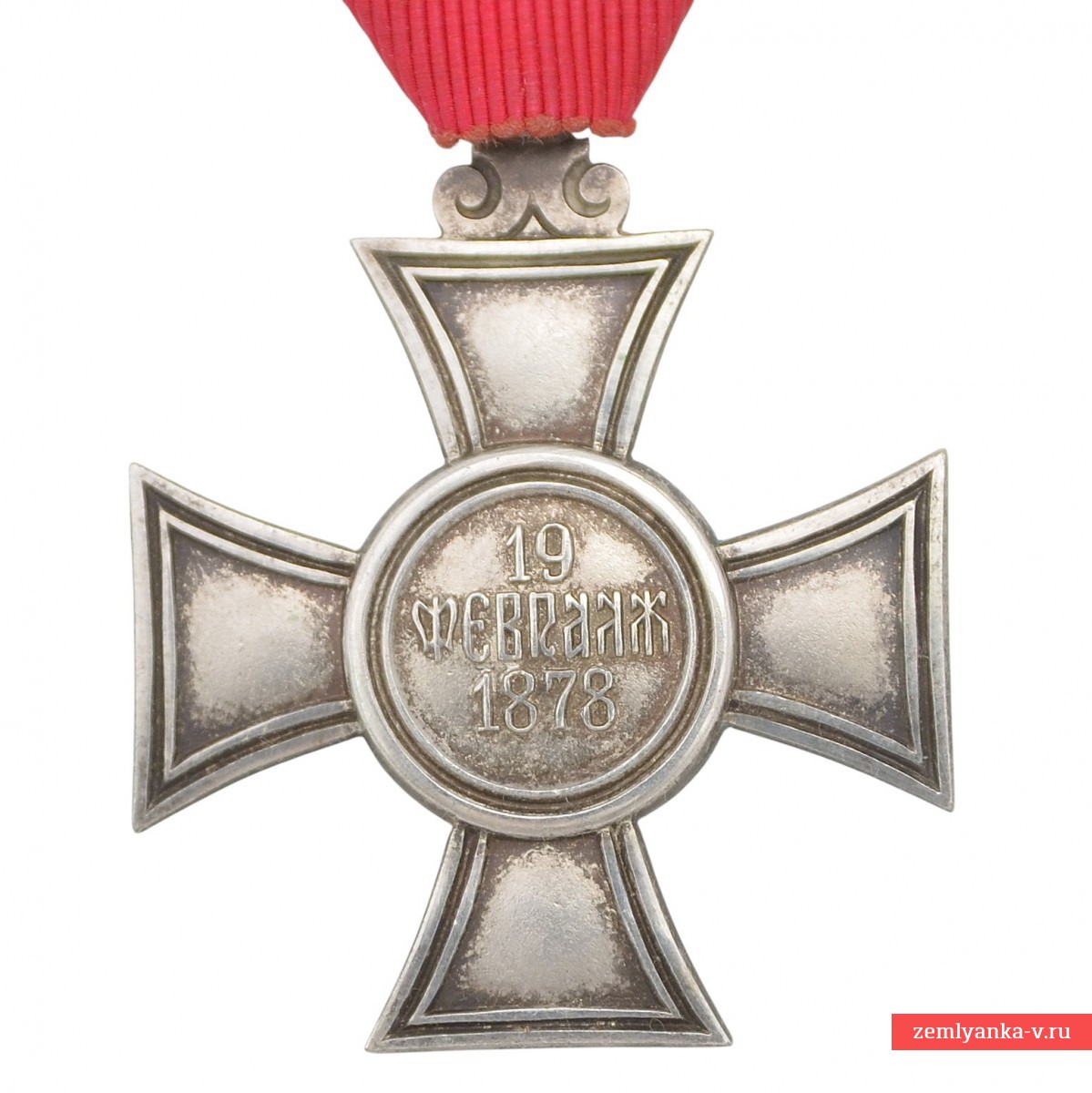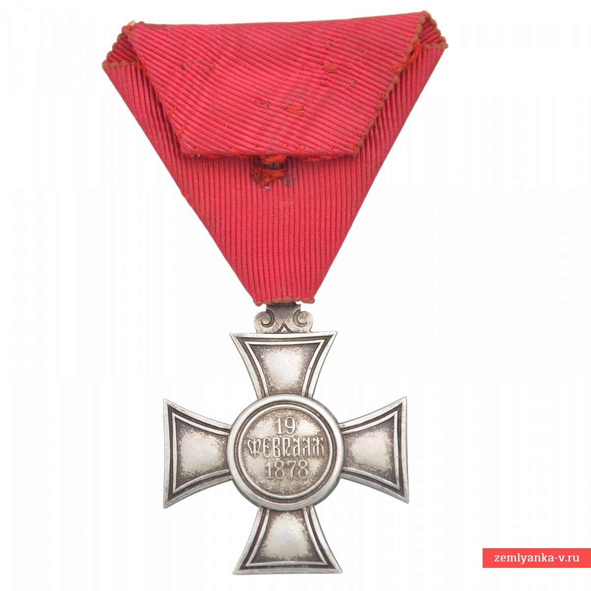 Знак ордена относится к 6-й (низшей) степени Ордена Святого Александра, которая представляла собой серебряный крест (без эмали). В центральном медальоне на реверсе (изображен на фото) указана дата «19 ФЕВРАЛЪ 1878» (19 февраля 1878 года по старому стилю). Эта дата ознаменовала подписание Сан-Стефанского мирного договора, который привел к освобождению Болгарии от османского владычества и созданию автономного Болгарского княжества. Сам орден был учрежден указом князя Александра I Баттенбергского 25 декабря 1881 года. Орден вручался болгарским и иностранным гражданам за выдающиеся гражданские и военные заслуги, а также за лояльную службу монарху и нации. Награда носится на темно-красной (малиновой) ленте, сложенной характерным для российских и некоторых других наград треугольником.