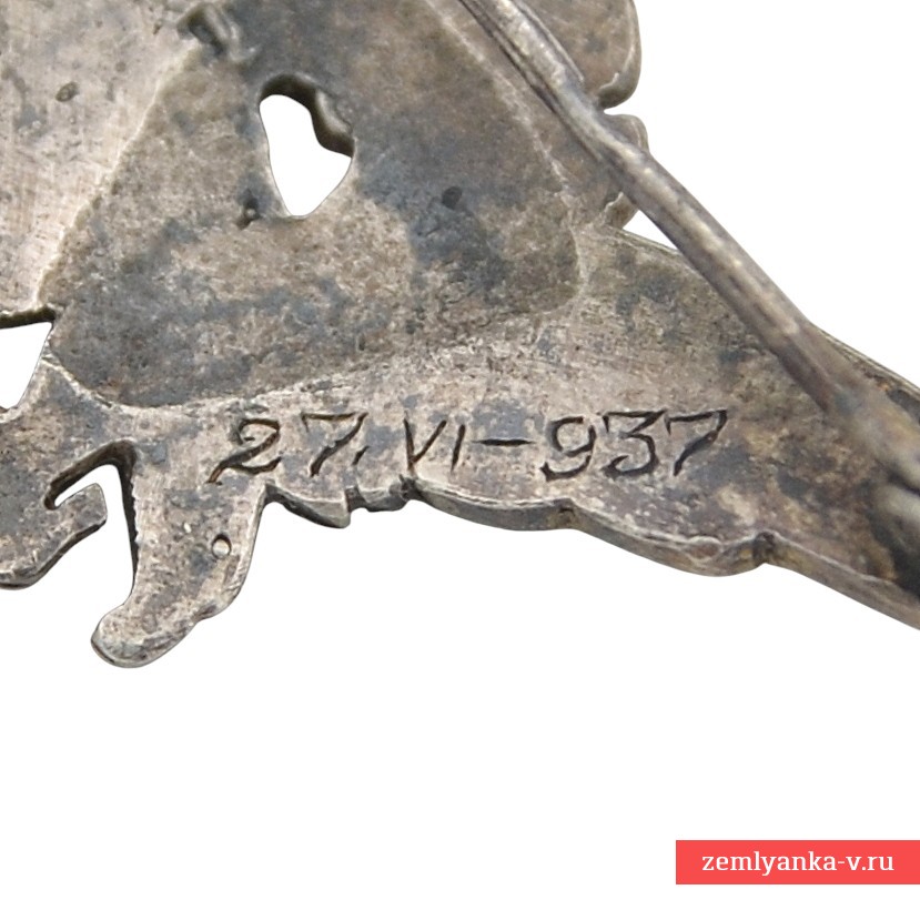 Оригинальный редкий знак 1-го типа, выпуска 1930-1937 годов. Бронза, литьё, штихелёвка, толстое серебрение. На реверсе штихелем вырезана дата вручения знака: 27. VI. 1937 года. С конца 1937 года вручались уже знаки с позолотой, а не серебрением. Отличное коллекционное состояние. Клеймо производителя на игле. Гарантия подлинности.