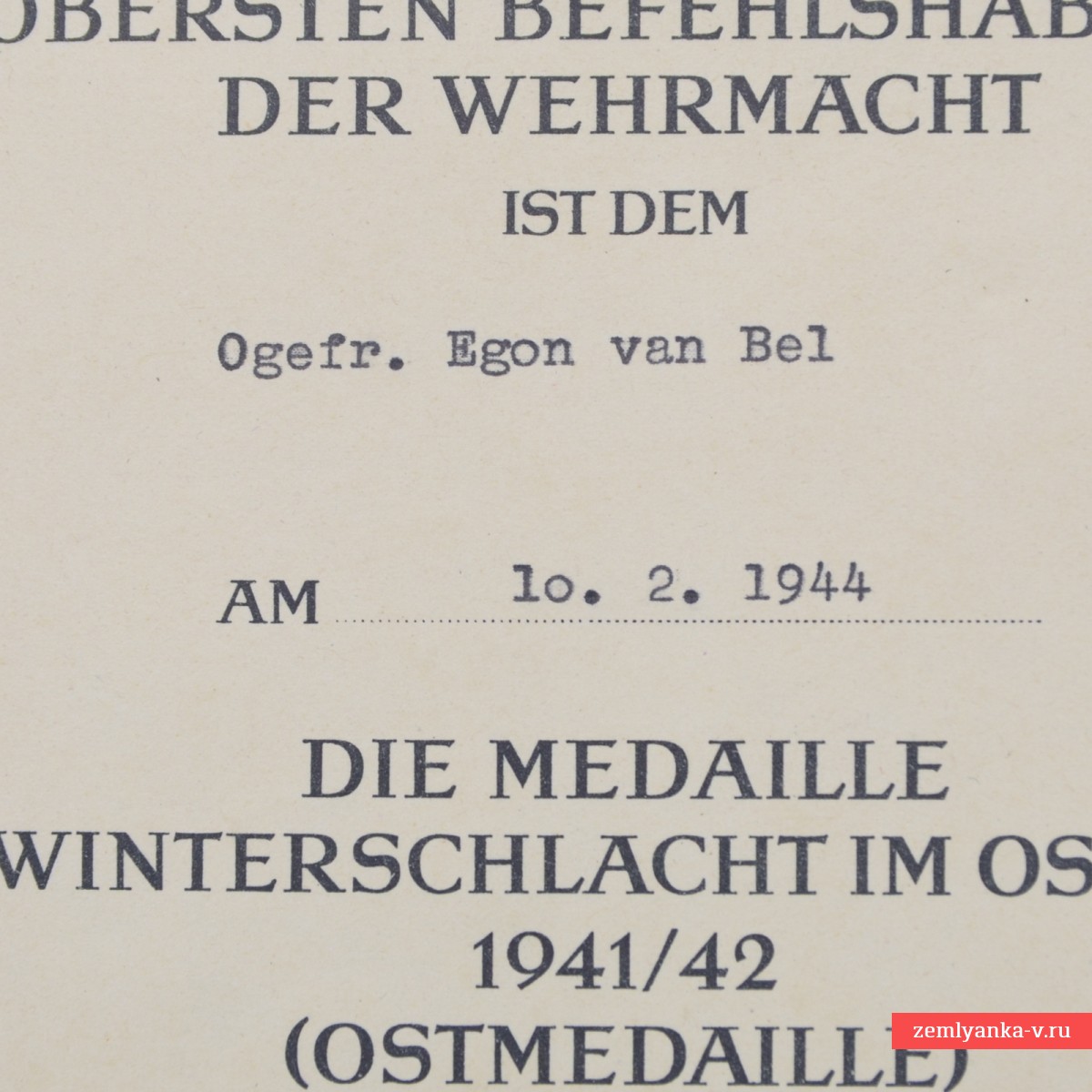 Оригинальная медаль в очень хорошем коллекционном состоянии. Цинк, штамповка, морозное серебрение. Клеймо производителя на кольце читается плохо. Медаль на оригинальной ленте. В комплекте также оригинальная фельдшпанга и оригинальный документ. Согласно тексту, медаль вручена обер-ефрейтору (Ogefr.) Егону ван Белю (Egon van Bel), — этническому голландцу и, вероятно, добровольцу в составе Вермахта, 10 февраля 1944 года. Подпись заверена майором и командиром дивизиона (Major und Abt.-Kdr.). Формат А5. Позднее награждение — 1944 года. Редкость. Гарантия подлинности.