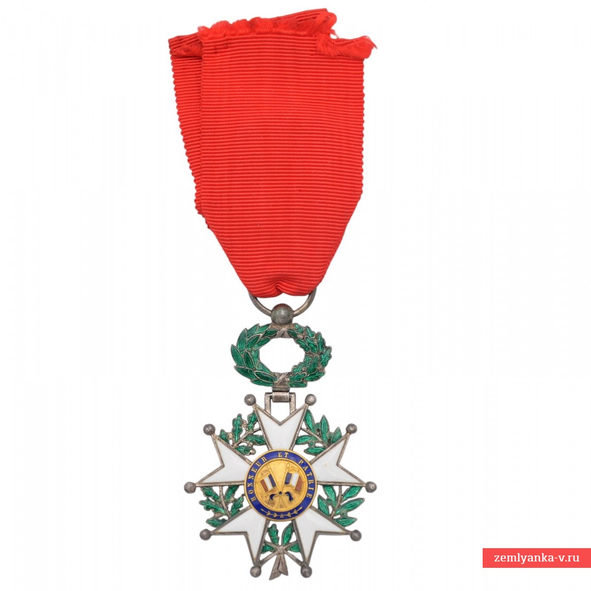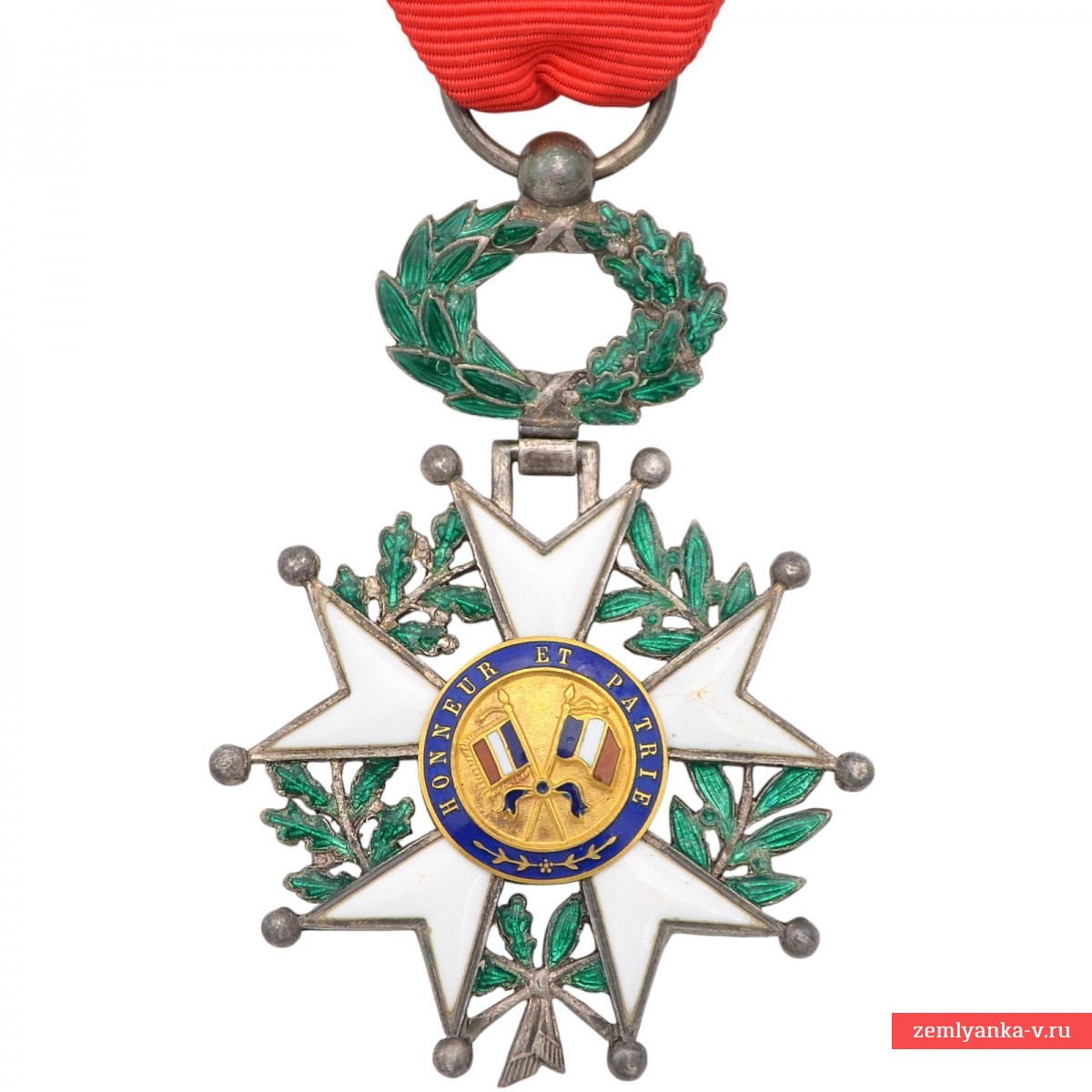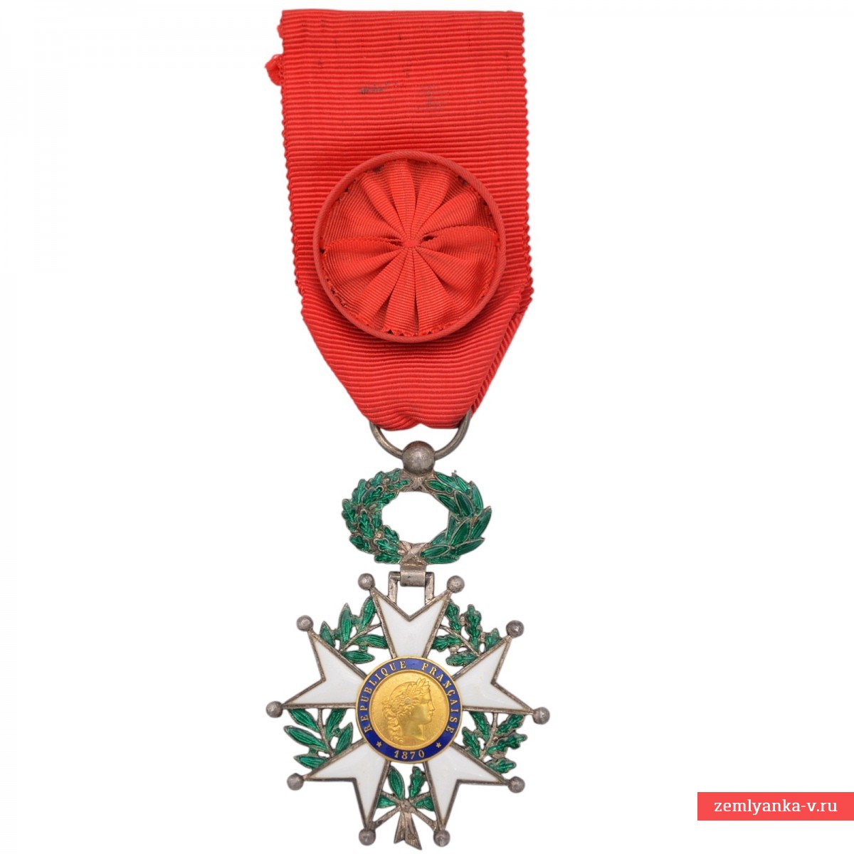 Оригинальная высшая государственная награда Франции в отличном состоянии. Серебро, штамповка, пайка, серебрение, позолота, эмаль. Вся эмаль в отличном состоянии, без утрат и сколов. Клеймо на венке на 6 часов. На синем эмалевом кольце в центре медальона указан год — 1870. Знаки этого образца выпускались в период с 1870 по 1951 год. Пятилучевая «звезда» с белой эмалью, обрамлённая венком из лавровых и дубовых листьев с зелёной эмалью. В центре медальона изображён профиль Марианны — символа республики. Диаметр 43 мм. Гарантия подлинности.