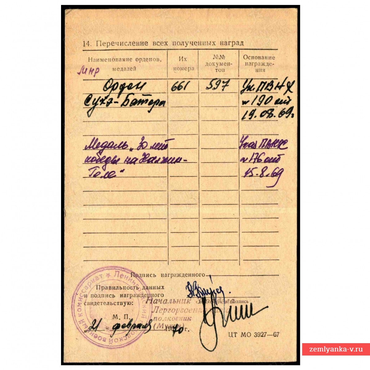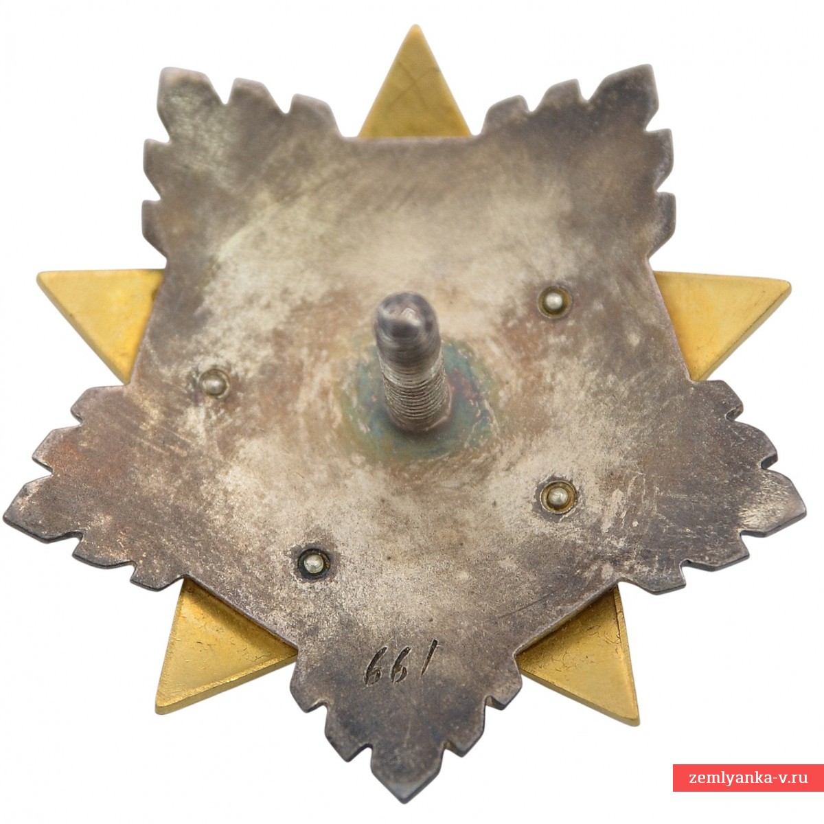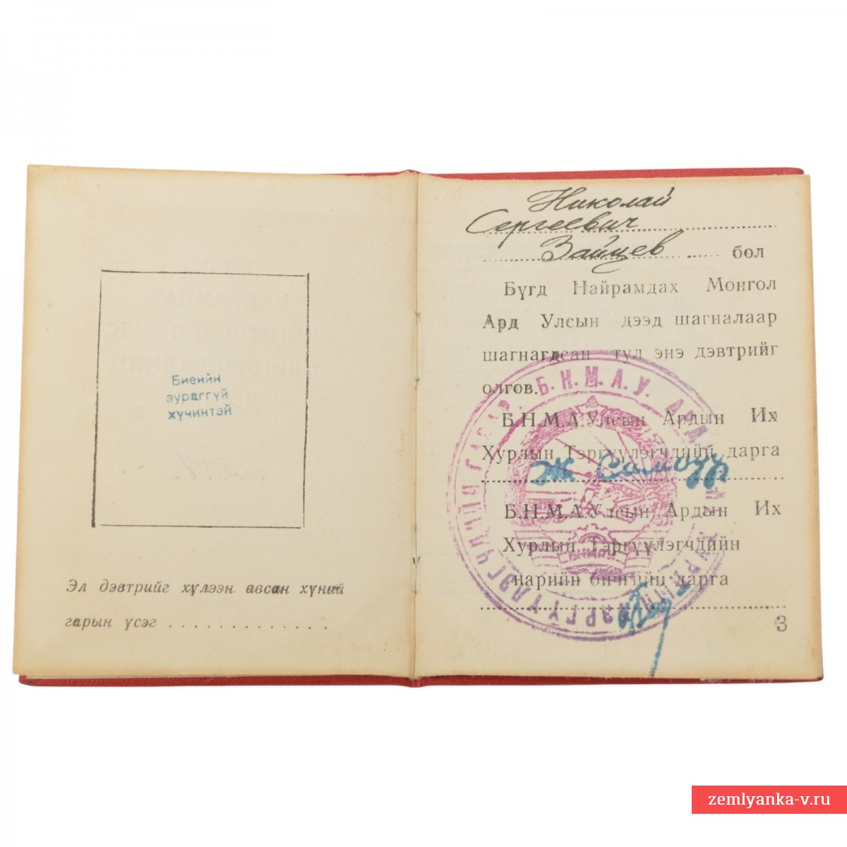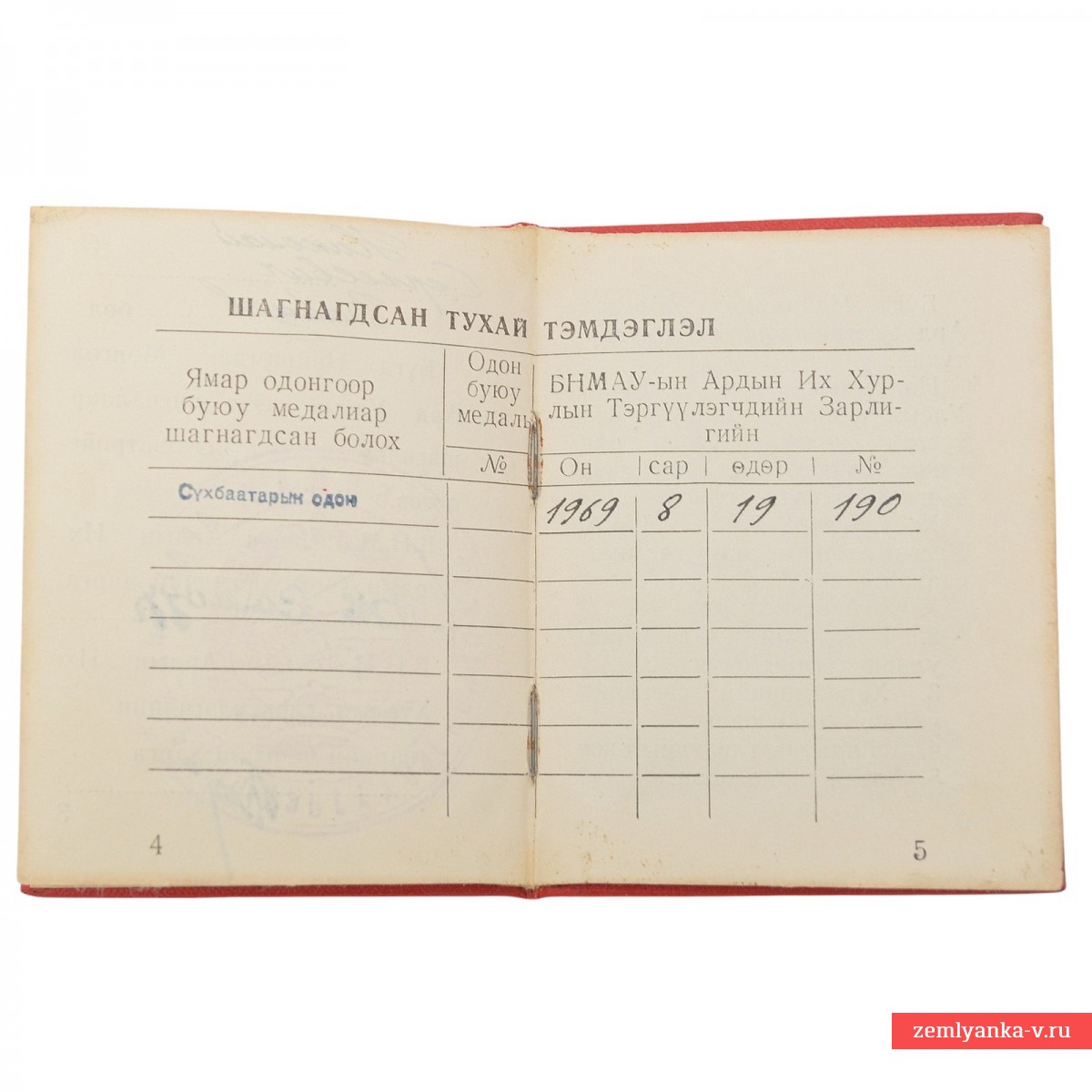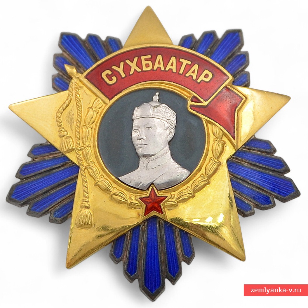 Редчайшая на нашем рынке награда в отличном состоянии. В комплекте оригинальный футляр и наградная книжка. Золото, платина, серебро, эмаль. Орден представляет собой выпуклую полированную золотую пятиконечную звезду, между концами которой расположены серебряные плоские заострённые лучи разной величины, покрытые синей эмалью. В центре орденской звезды помещено платиновое погрудное рельефное изображение Сухэ-Батора на фоне круга, покрытого серой эмалью и окружённого золотым венком. Над портретом реет развёрнутое вправо красное эмалевое революционное знамя с пышными кистями и надписью «СҮХБААТАР», а под ним изображена красная эмалевая звезда. Оборотная сторона ордена гладкая, слегка вогнутая. В центре её припаян нарезной штифт с гайкой для крепления ордена к одежде. На реверсе нанесен номер награждения – 661. Орденом с этим номером был награжден Николай Сергеевич Зайцев (1911—1971) — гвардии полковник Советской Армии, участник Второй мировой войны, Герой Советского Союза (1945).