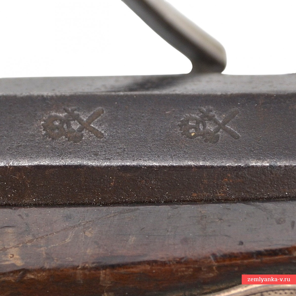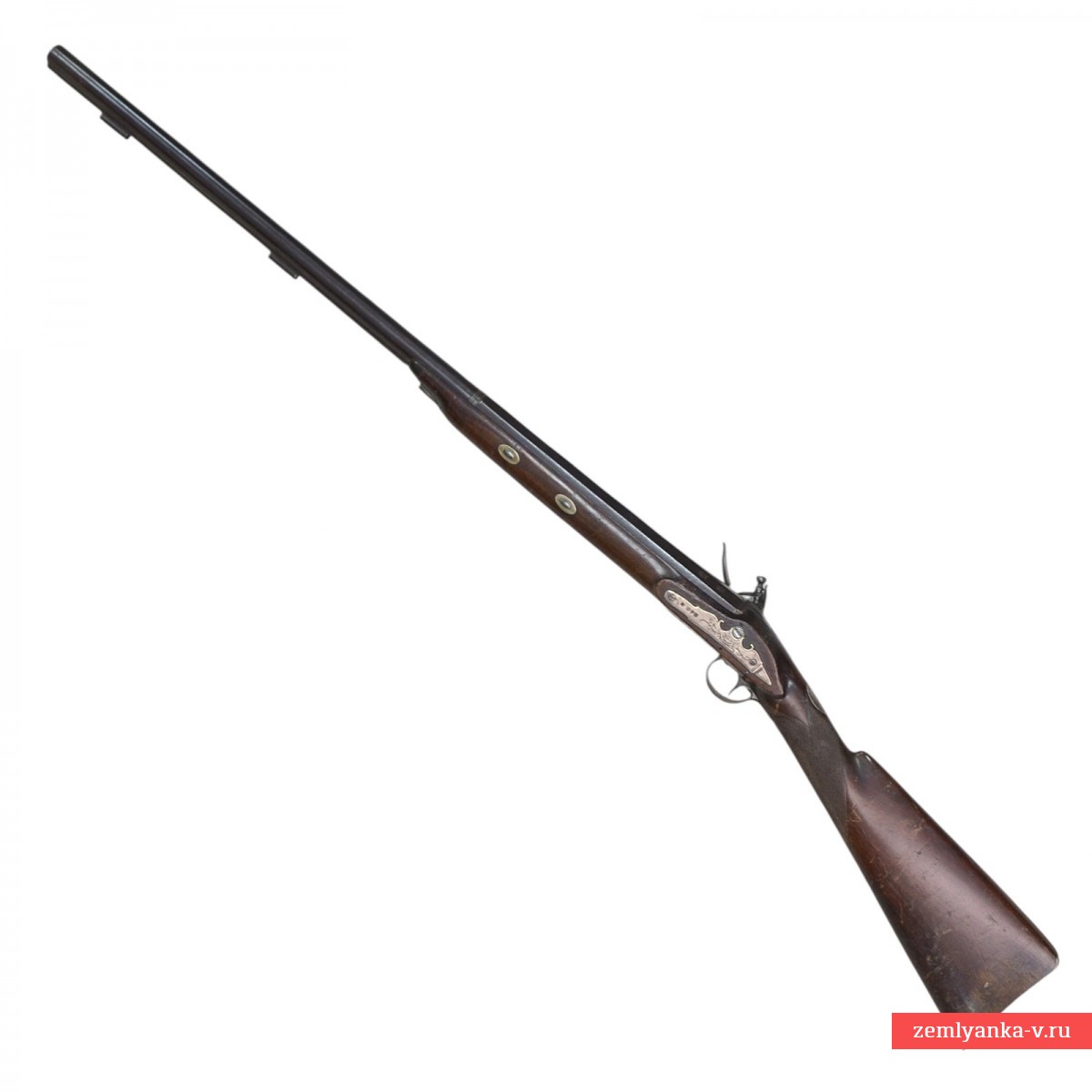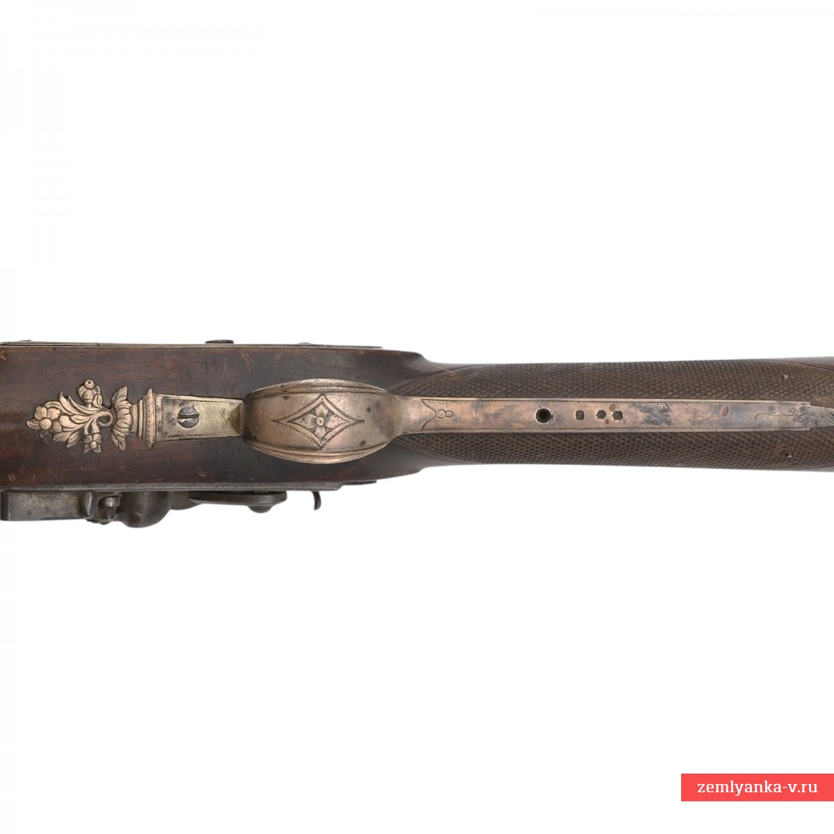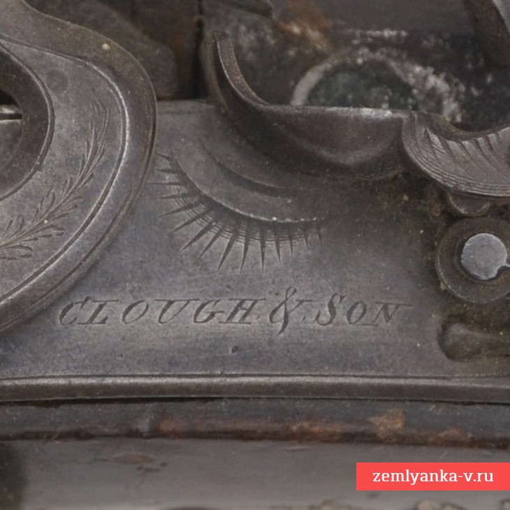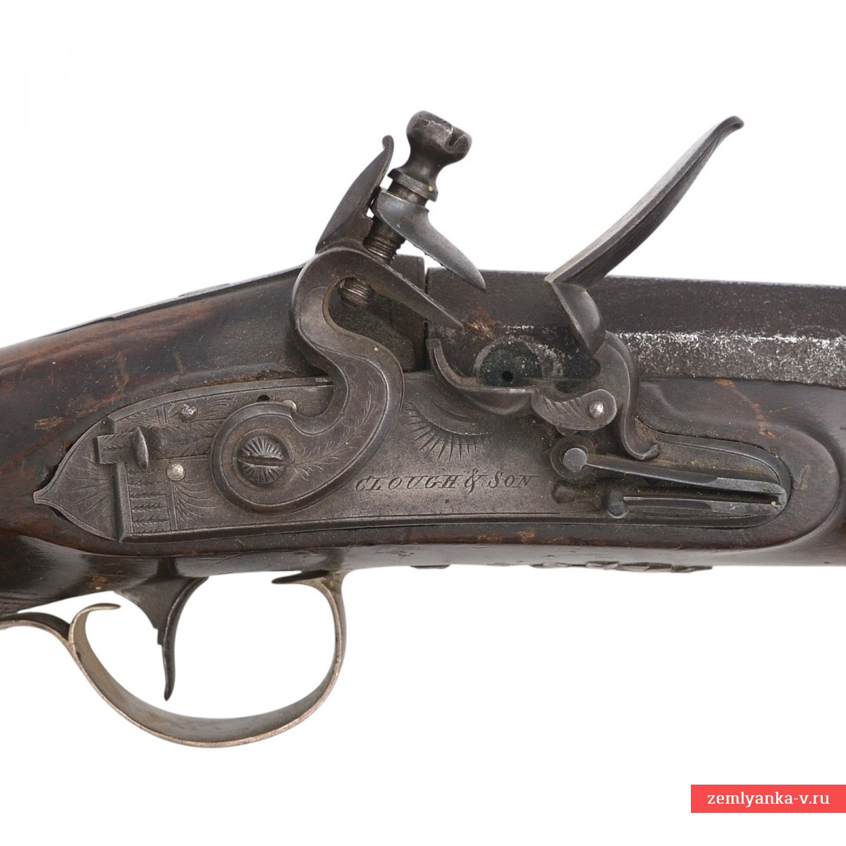 Оригинальное ружье в очень хорошем коллекционном состоянии. Ружье имеет граненный в казенной части и далее круглый ствол. На казенной пробиты два изображения перекрещенных алебард под короной (клеймо окончательного испытания стволов черным порохом. Применялось в Бирмингеме до 1904 года). Канал гладкий. Замок кремневый, французского батарейного типа. Такой тип замка был создан в 1610 г. французским оружейником из Лизье (Нормандия) Марэн Ле Буржуа (1550—1634) гг. Он был на порядок надежнее колесцового, благодаря чему распространился по всему миру на следующие три столетия, как основной механизм ручного огнестрельного оружия. Чтобы подготовить такой замок к выстрелу, стрелок был должен (зарядив собственно оружие, то есть, забив в ствол пороховой заряд, пулю и пыж) поставить курок на предохранительный взвод; открыть крышку полки; если нужно, прочистить затравочное отверстие; насыпать на полку небольшую порцию пороха; закрыть крышку; поставить курок на боевой взвод. На замочной доске иглой нанесена надпись «Clough & Son» (клеймо Джорджа Клу, работавшего в г. Бат (Соммерсет) с 1815 года. Данный тип клейма характерен для его изделий, произведенных в 1825-33 гг по адресу Саутгейт стрит, 29. Джордж являлся отцом братьев Томаса и Джона, позже наследовавших мастерскую и продолживших дело отца. Фирма существовала приблизительно до 1865 года). Замочная личина серебряная, работы мастера из Бирмингема, судя по клейму в виде якоря на всех частях, фигурной формы, украшена гравировкой. Спусковая скоба серебряная, овальная, украшена гравировкой. Ложа деревянная, цевье до середины ствола. Шомпол утрачен. Шейка приклада украшена перекрестной насечкой. Тыльник приклада серебряный, Г-образный. Гарантия подлинности.