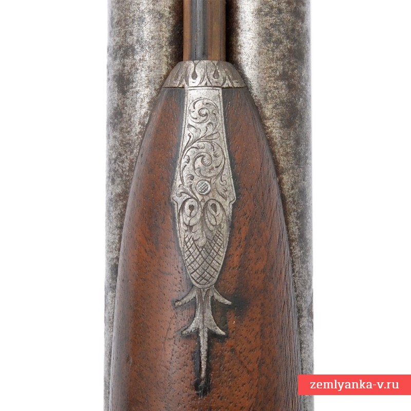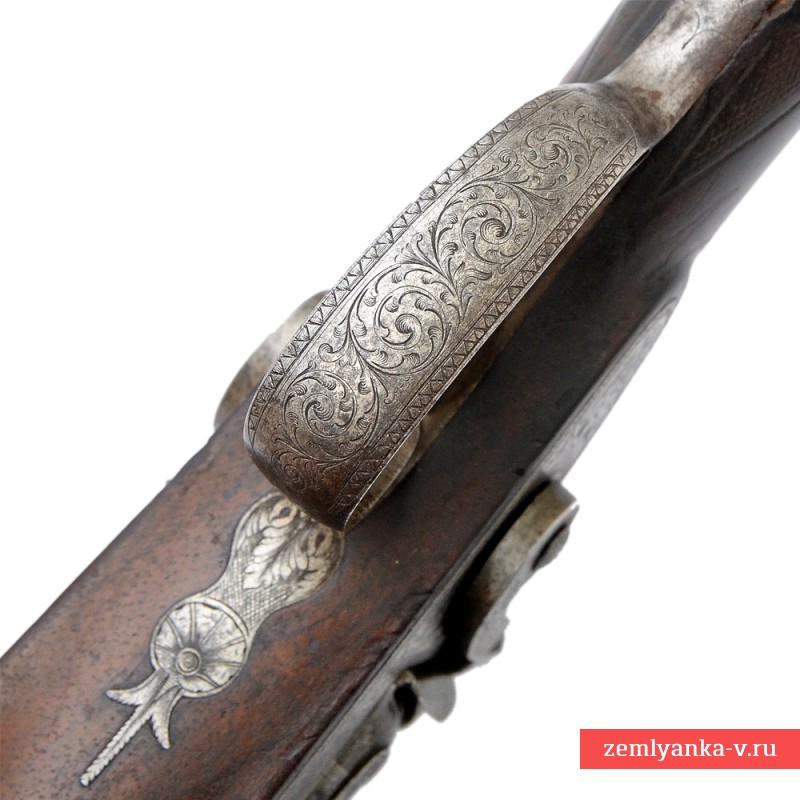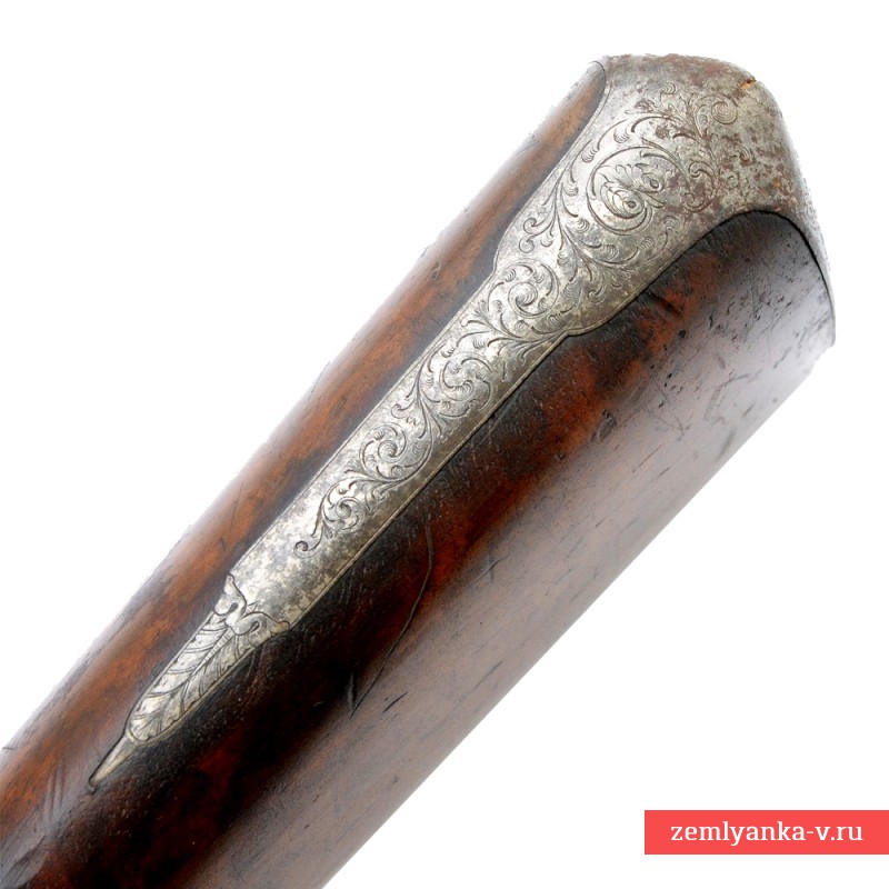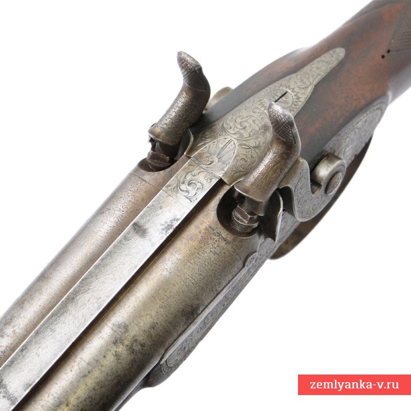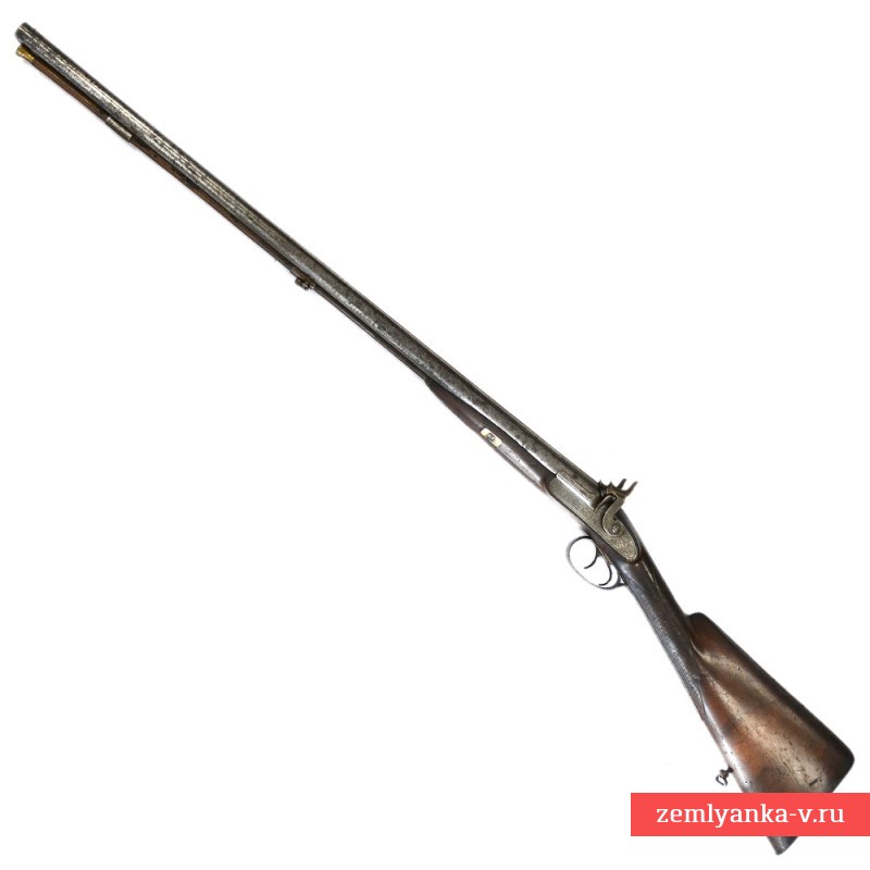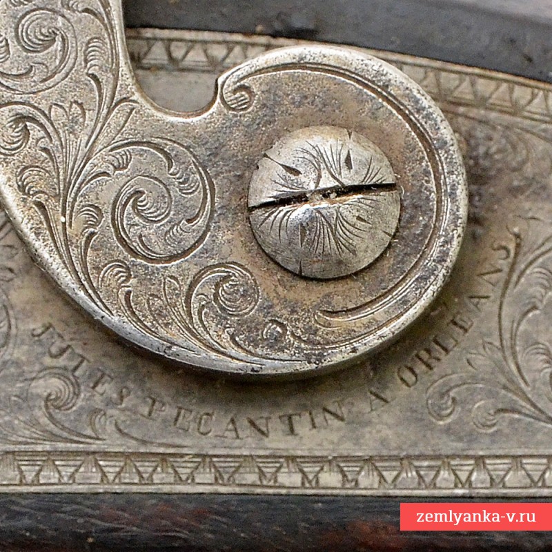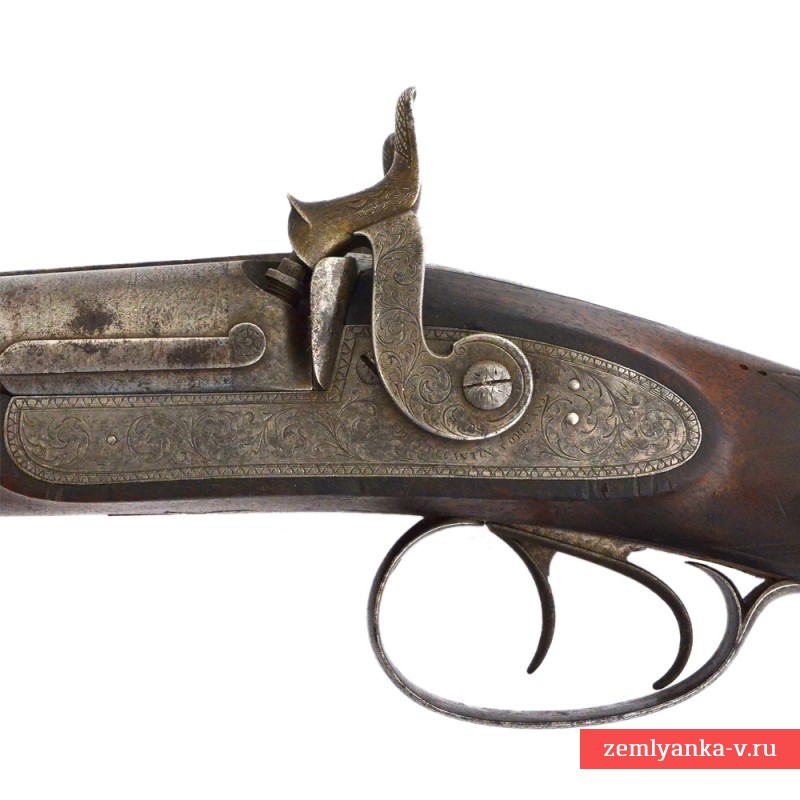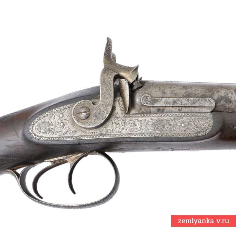 Оригинальное охотничье ружье второй четверти XIX века в очень хорошем коллекционном состоянии. Полностью исправно, пружины четко встают на оба боевых взвода. Оригинальный шомпол с крейцером. Стволы без клейм, на замочных досках нанесено наименование производителя – фирмы орлеанского оружейного мастера Жюля Пегантена. Замочные доски, спусковая скоба, тыльник приклада украшены гравировкой. Прекрасный и полностью комплектный предмет в отличном состоянии, замечательный и вполне бюджетный подарок любому охотнику! Гарантия подлинности.