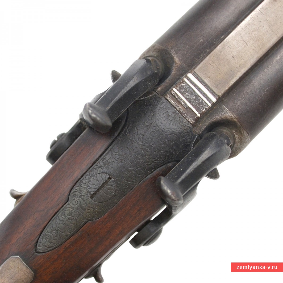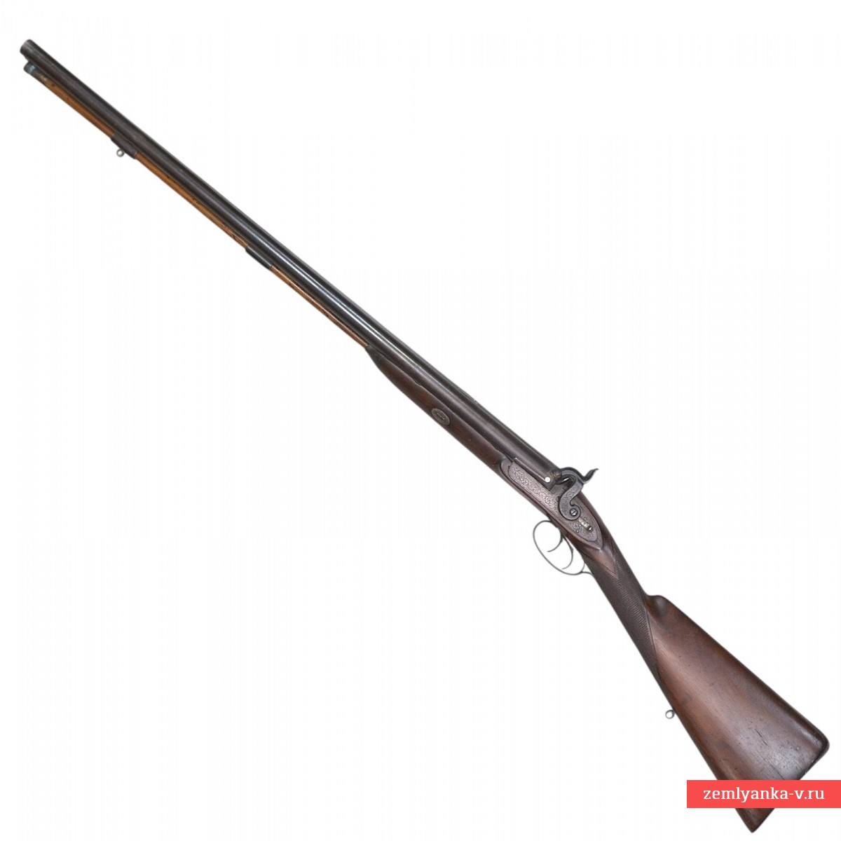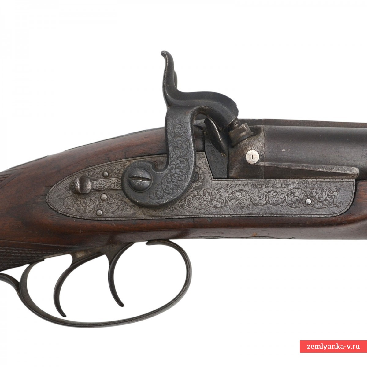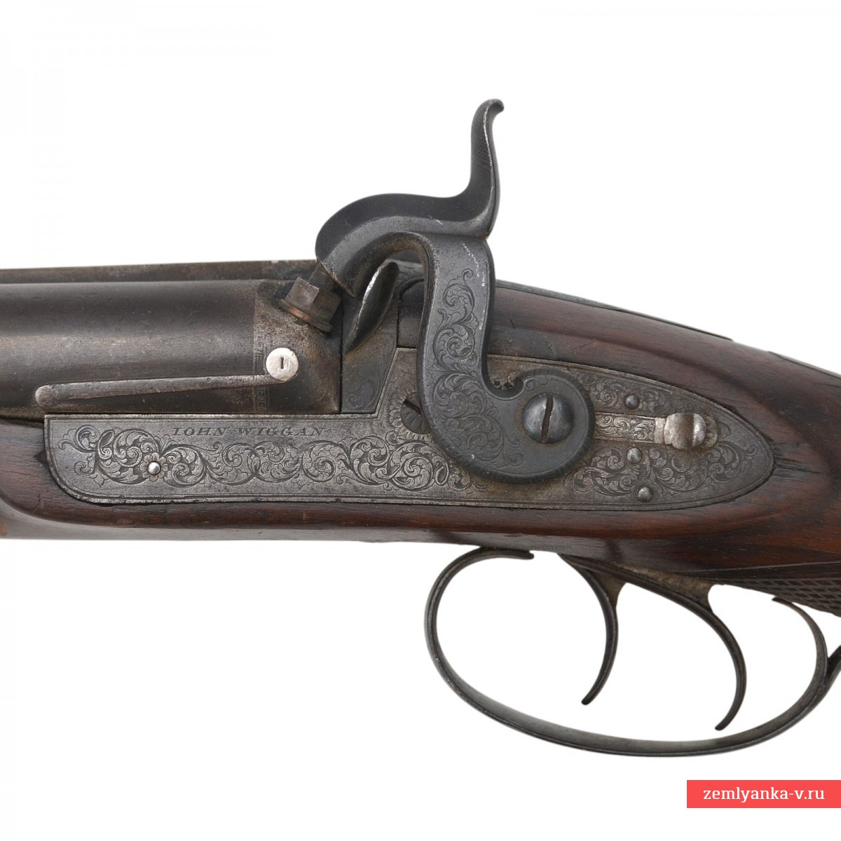 Оригинальное ружье в прекрасном коллекционном состоянии. Ружье имеет 2 круглых ствола, изготовленных из дамаска (?). Каналы гладкие. Замки капсюльные, украшенные гравировкой. На замках иглой нанесены надписи «John Wiggan» (Джон Уиггин, позже известный как Джон Уигган, был известным оружейником из Бирмингема, Англия, в XIX веке. Он основал свой бизнес по адресу Уиттал-стрит, 26, в 1828 году, первоначально написав свою фамилию как «Уиггин». К 1836 году он изменил написание на «Уигган». В рекламе того года освещается его ассортимент: «Дж. Уигган продолжает выпускать на своей мануфактуре по адресу Уиттал-стрит, 26, Бирмингем, самые первые двуствольные ружья, изготовленные по проверенному принципу, в футлярах из красного дерева, по цене от 20 до 25 фунтов стерлингов. Превосходные ружья для егерей, с гарантией во всех отношениях и отличные стрелковые качества. От 8 до 12 фунтов стерлингов». К 1845 году адрес предприятия изменился на Уиттал-стрит, 27, возможно, из-за перенумерации улиц. В 1862 году компания стала называться «Wiggan & Elliott» и располагалась по адресу: улица Уиттал, 25. Генри Эллиотт, партнер фирмы, получил британский патент № 1782 на уникальный затворный механизм. К 1876 году «Wiggan & Elliott» позиционировали себя как «производители для королевской семьи и паши Египта» и были известны производством «запатентованного Эллиоттом затворного ружья с боковым вращением». «Wiggan» производила различное огнестрельное оружие, включая двуствольные пистолеты-хауды. Оружейный квартал в Бирмингеме, где работала компания «Wiggan», был известным центром оружейного производства, поставлявшим огнестрельное оружие для военных конфликтов, таких как Наполеоновские войны, Крымская война и Гражданская война в США. Этот район был известен своими квалифицированными мастерами и значительным вкладом в мировую оружейную промышленность. Спусковая скоба стальная, овальной формы. Ложа деревянная, гладкая, приклад без щеки. Гарантия подлинности.