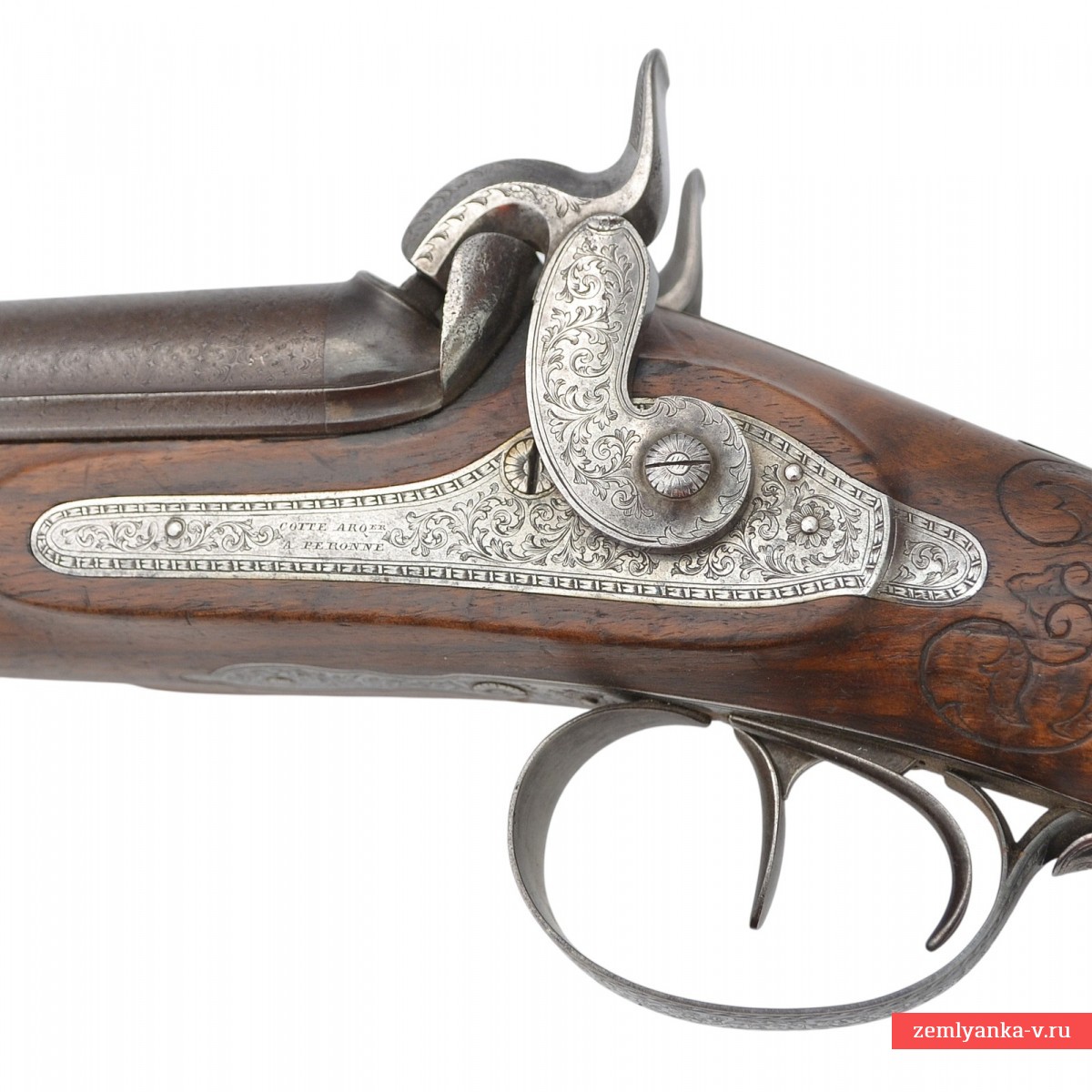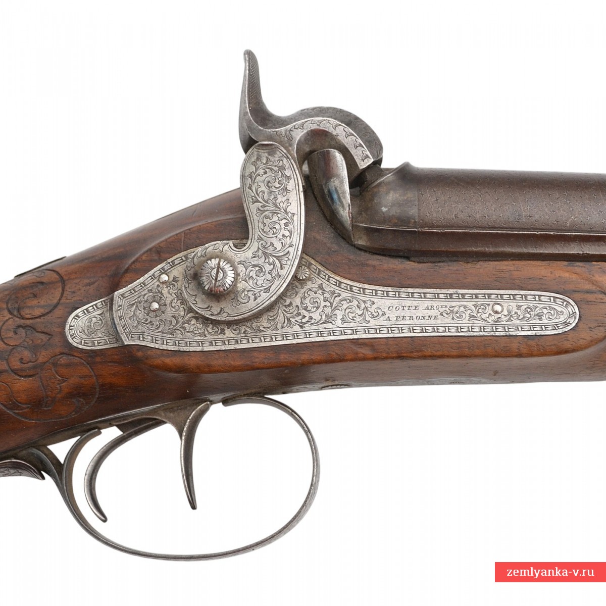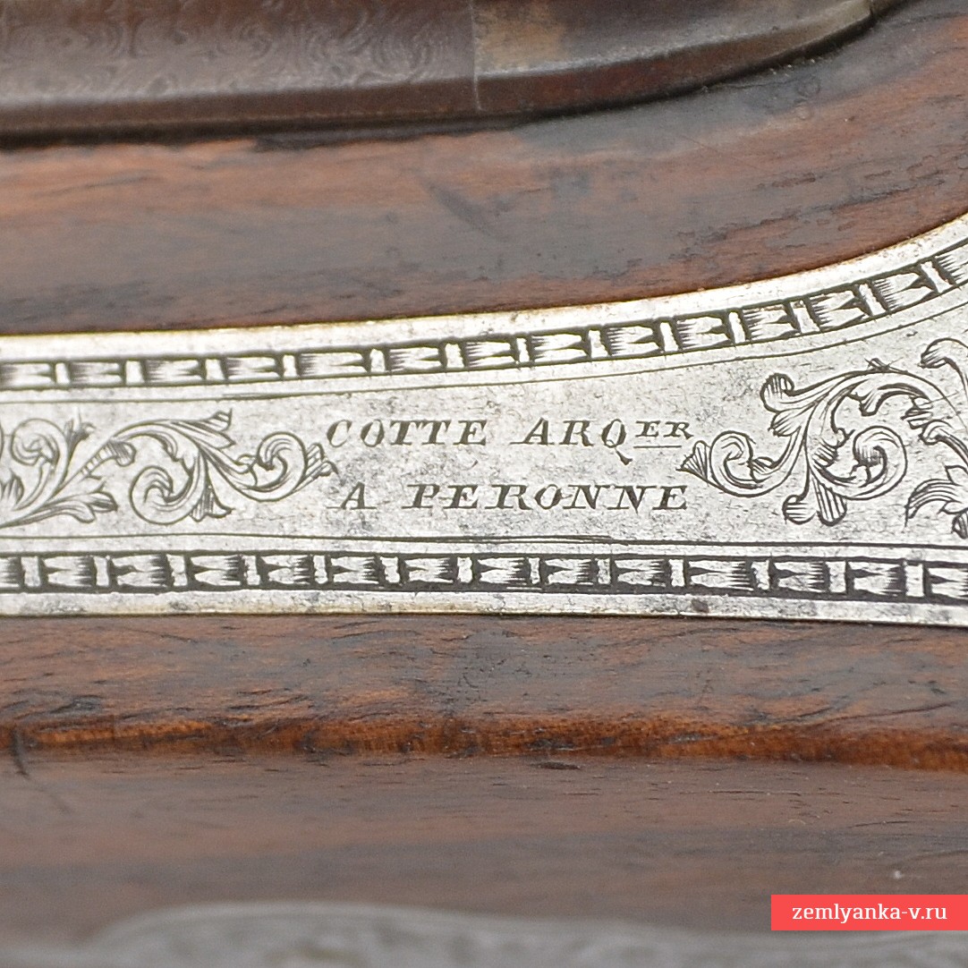 Оригинальное ружье в прекрасном коллекционном состоянии. Ружье имеет 2 круглых ствола, изготовленных из красивого турецкого букетного дамаска. Каналы гладкие. На планке между стволами таушировкой золотом нанесено имя мастера, выполненное в виде надписи «Cotte a Peronne» (согласно Штокелю, работал в 1870 году). Замки капсюльные, украшенные гравировкой. На замках иглой нанесены надписи «COTTE ARQer A PERONNE» ( «Котте, оружейный мастер из Перона»). Ложа деревянная, гладкая, цевье на ¼ ствола. Под стволами в цевье вложен шомпол. Приклад со щекой, украшен резными завитками. Гарантия подлинности.