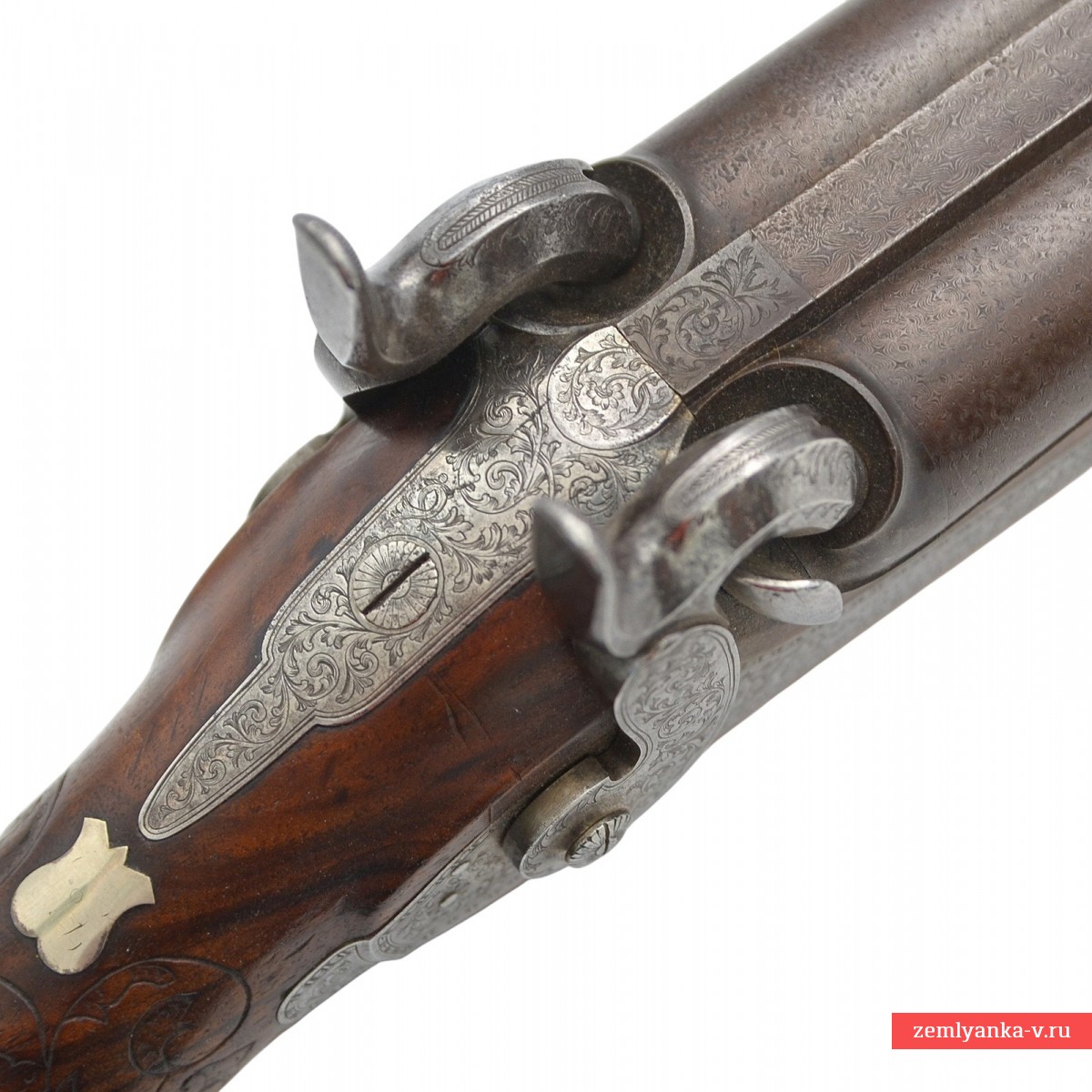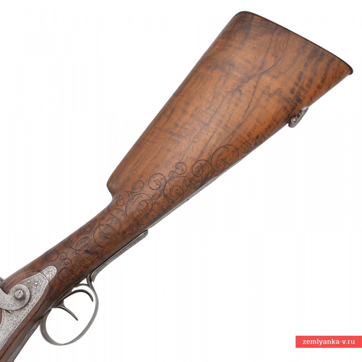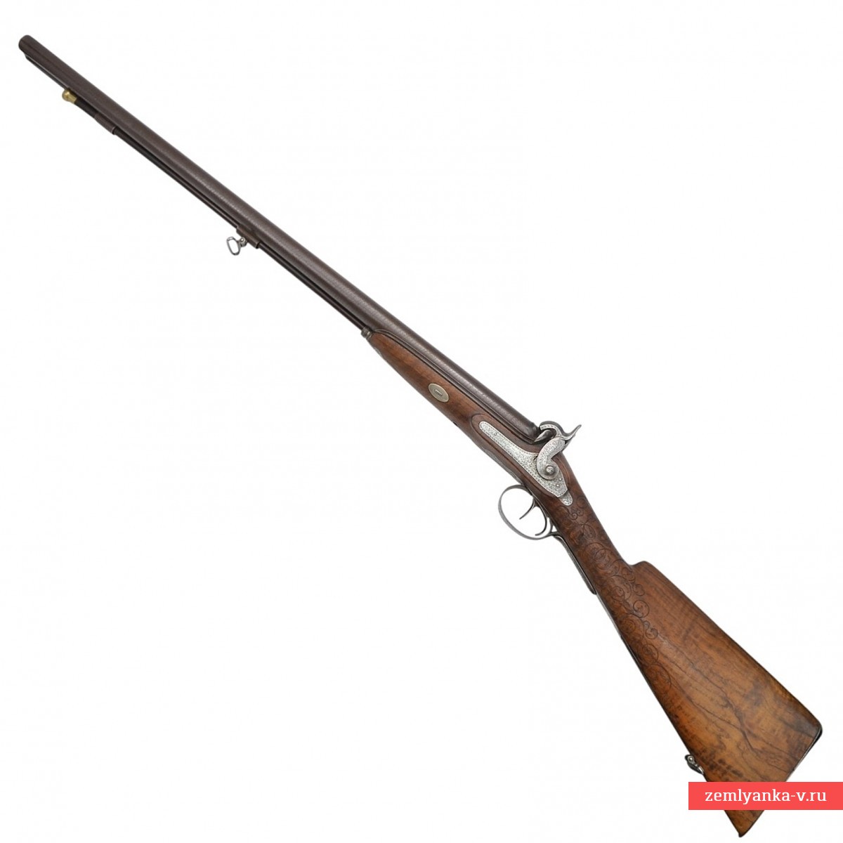 Оригинальное ружье в прекрасном коллекционном состоянии. Ружье имеет 2 круглых ствола, изготовленных из красивого турецкого букетного дамаска. Каналы гладкие. На планке между стволами таушировкой золотом нанесено имя мастера, выполненное в виде надписи «Cotte a Peronne» (согласно Штокелю, работал в 1870 году). Замки капсюльные, украшенные гравировкой. На замках иглой нанесены надписи «COTTE ARQer A PERONNE» ( «Котте, оружейный мастер из Перона»). Ложа деревянная, гладкая, цевье на ¼ ствола. Под стволами в цевье вложен шомпол. Приклад со щекой, украшен резными завитками. Гарантия подлинности.