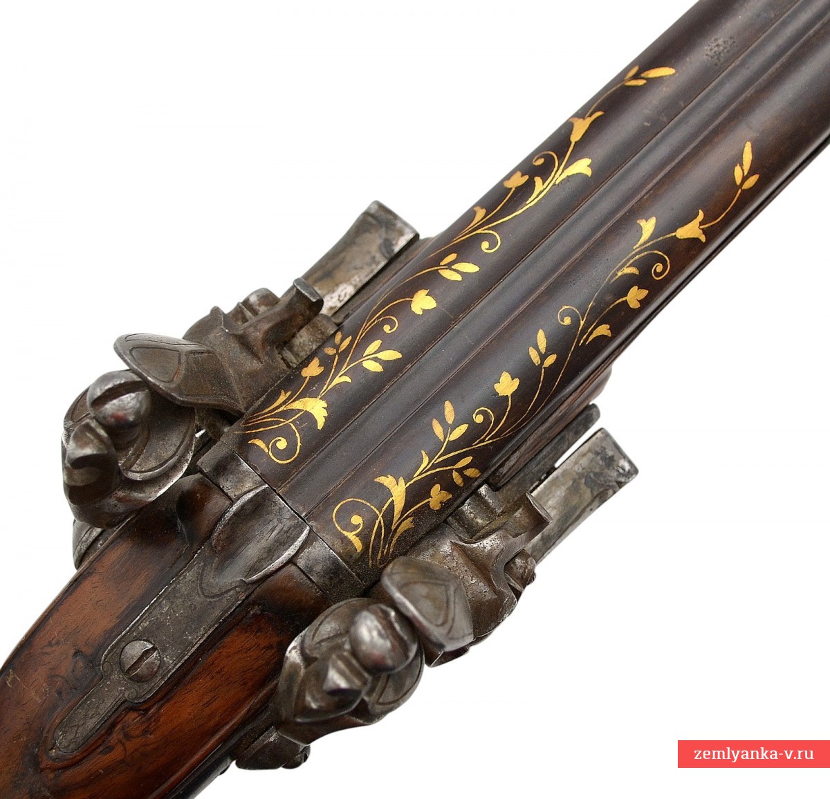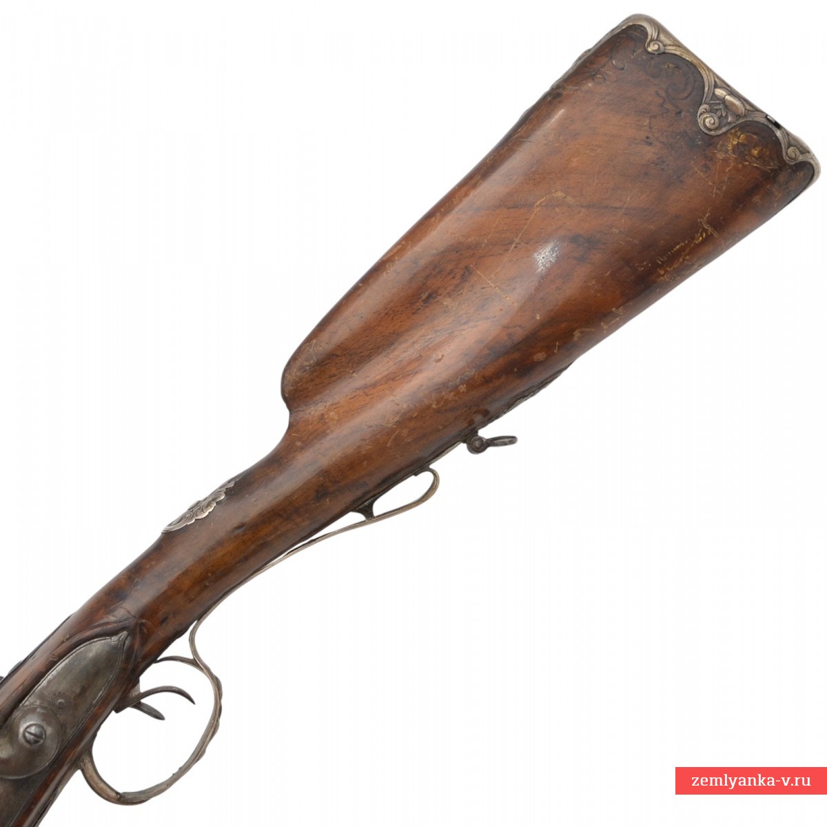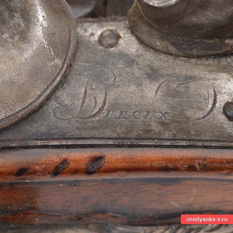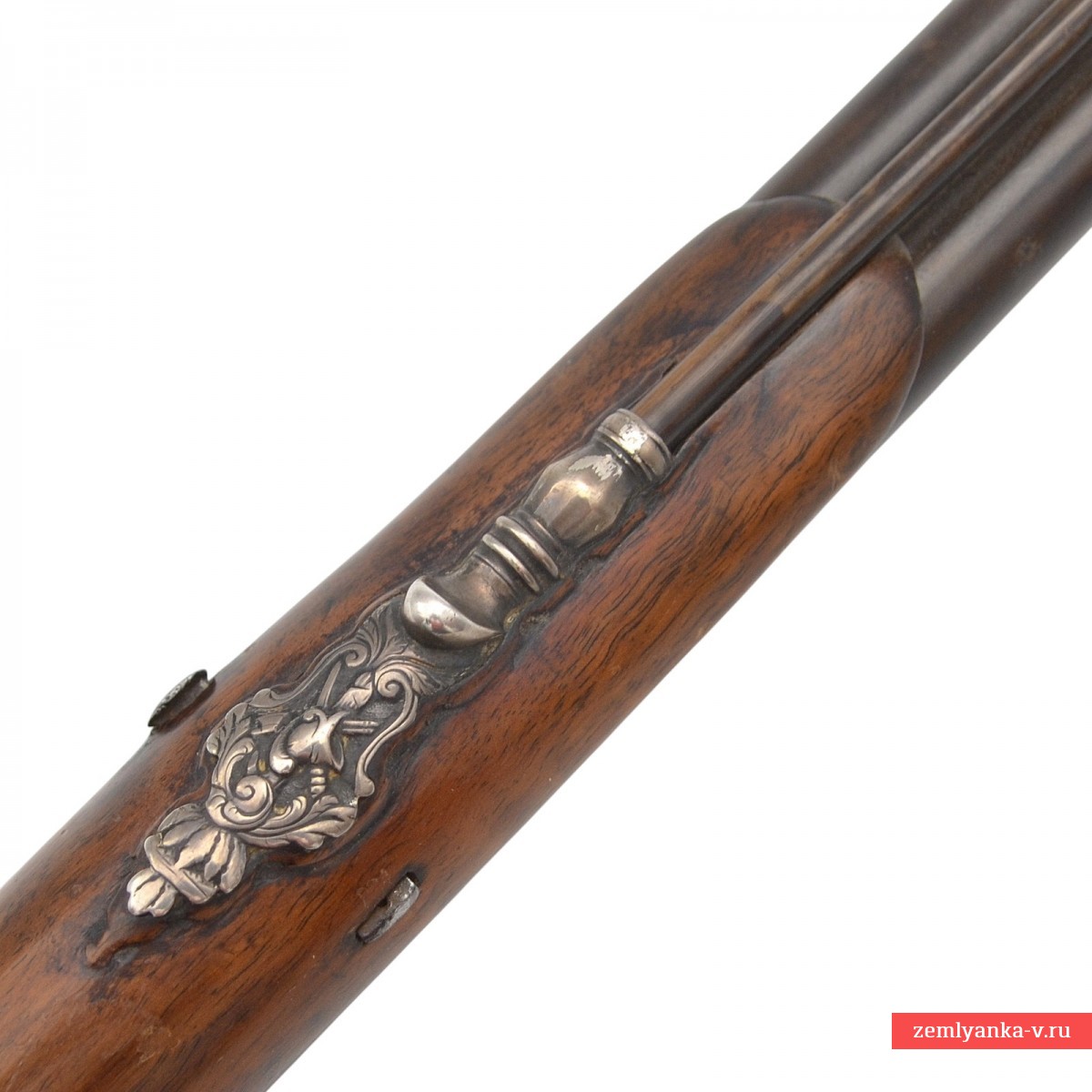 Оригинальное ружье в прекрасном коллекционном состоянии. Ружье имеет 2 круглых ствола, казенная часть которых украшена растительными композициями, нанесенными таушировкой золотом. Каналы гладкие. Замки кремневые, французского батарейного типа. Такой тип замка был создан в 1610 г. французским оружейником из Лизье (Нормандия) Марэн Ле Буржуа (1550—1634) гг. Он был на порядок надежнее колесцового, благодаря чему распространился по всему миру на следующие три столетия, как основной механизм ручного огнестрельного оружия. Чтобы подготовить такой замок к выстрелу, стрелок был должен (зарядив собственно оружие, то есть, забив в ствол пороховой заряд, пулю и пыж) поставить курок на предохранительный взвод; открыть крышку полки; если нужно, прочистить затравочное отверстие; насыпать на полку небольшую порцию пороха; закрыть крышку; поставить курок на боевой взвод. На замочных досках иглой нанесены надписи «Durcux» (имя мастера) и «In Gouleme» ( «Из Ангулема»). Ложа деревянная, гладкая, цевье на 2/5 ствола. Под стволами в цевье вложен шомпол. Спусковая скоба и замочная личинка изготовлены из серебра. Тыльник приклада серебряный, фигурный, с нишой для принадлежностей, укрытой подпружиненной крышкой. Гарантия подлинности.