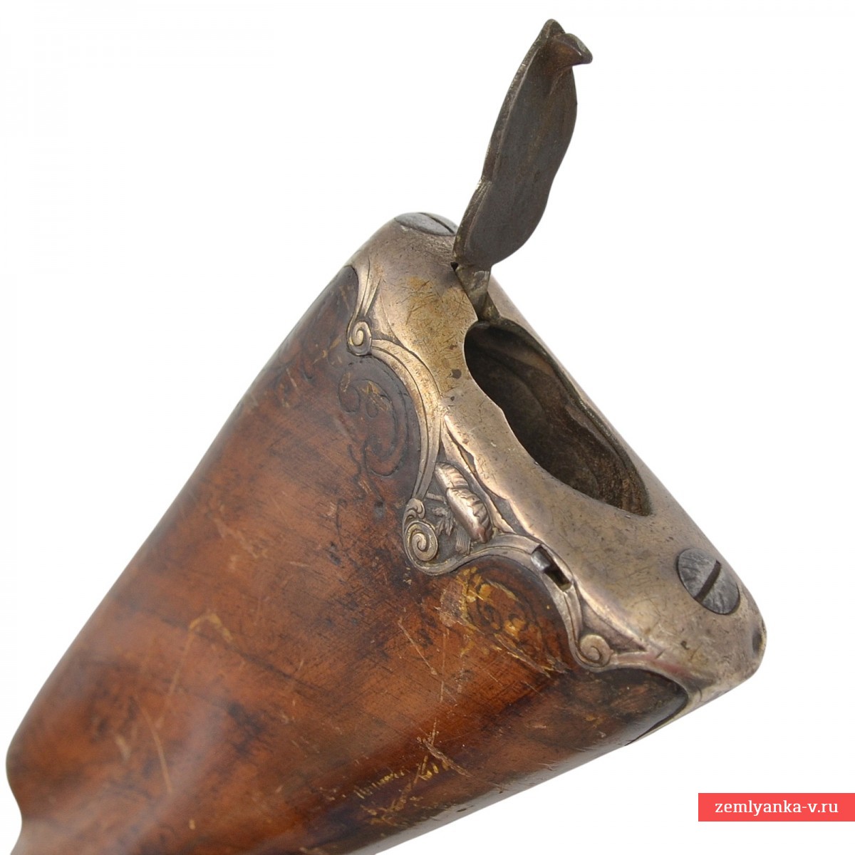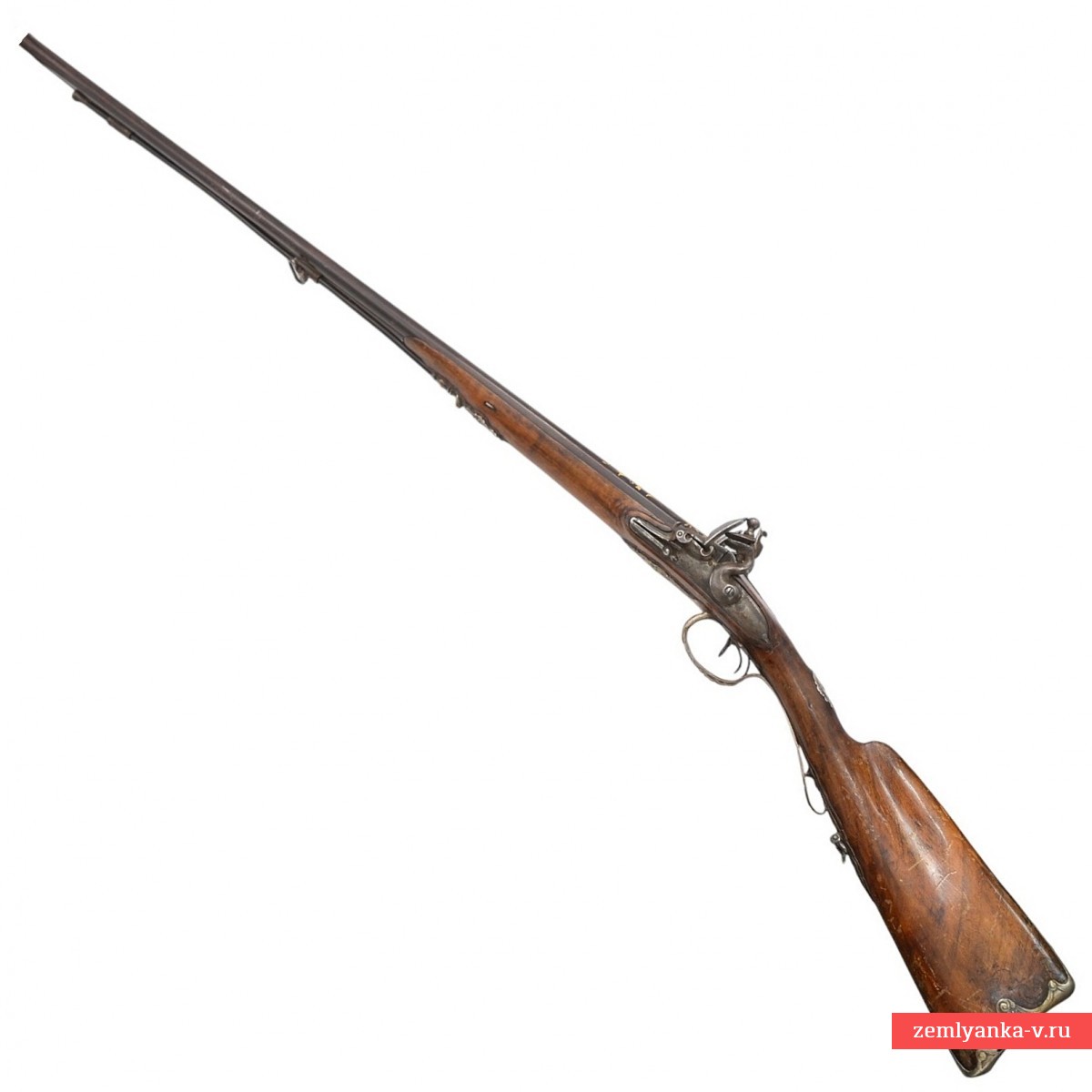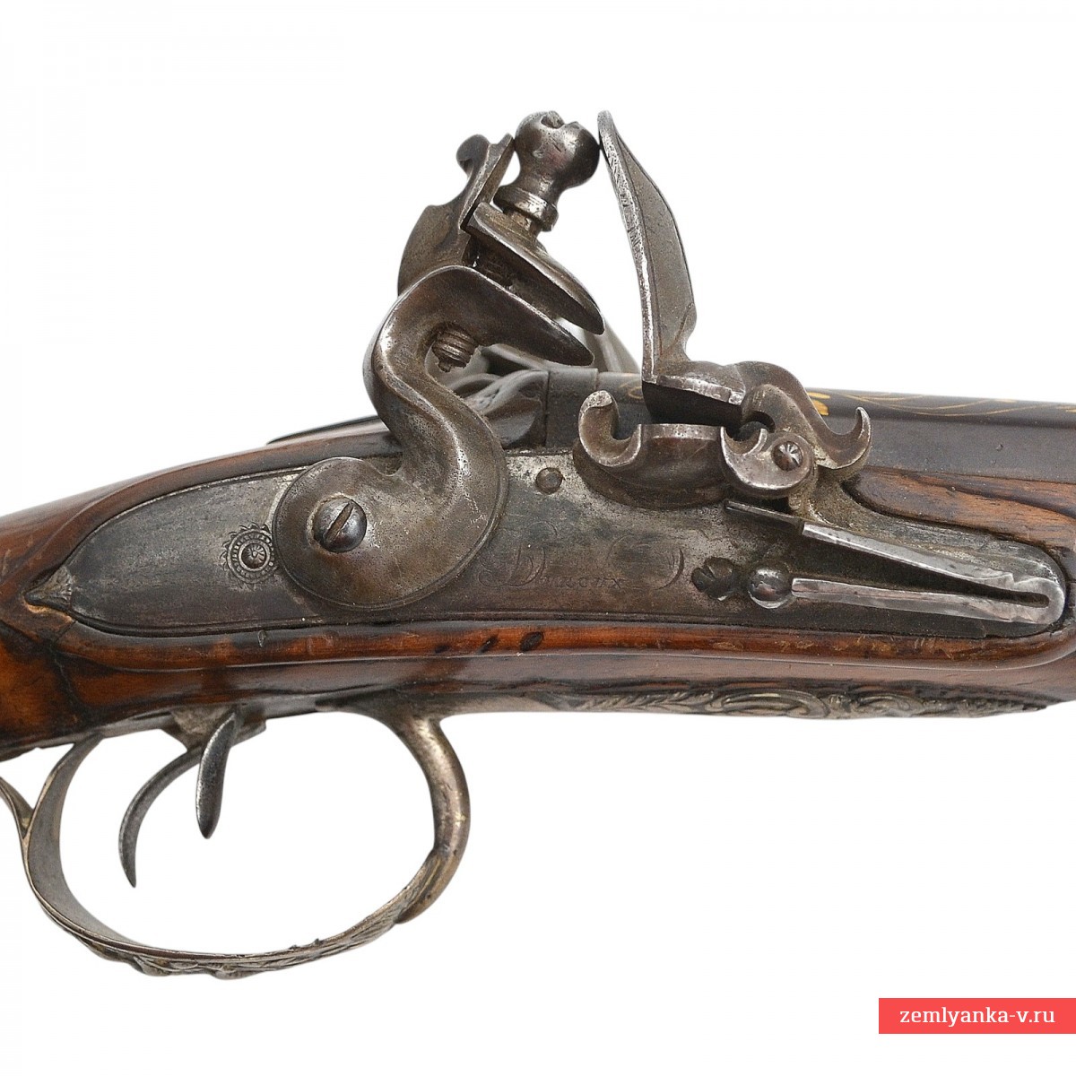 Оригинальное ружье в прекрасном коллекционном состоянии. Ружье имеет 2 круглых ствола, казенная часть которых украшена растительными композициями, нанесенными таушировкой золотом. Каналы гладкие. Замки кремневые, французского батарейного типа. Такой тип замка был создан в 1610 г. французским оружейником из Лизье (Нормандия) Марэн Ле Буржуа (1550—1634) гг. Он был на порядок надежнее колесцового, благодаря чему распространился по всему миру на следующие три столетия, как основной механизм ручного огнестрельного оружия. Чтобы подготовить такой замок к выстрелу, стрелок был должен (зарядив собственно оружие, то есть, забив в ствол пороховой заряд, пулю и пыж) поставить курок на предохранительный взвод; открыть крышку полки; если нужно, прочистить затравочное отверстие; насыпать на полку небольшую порцию пороха; закрыть крышку; поставить курок на боевой взвод. На замочных досках иглой нанесены надписи «Durcux» (имя мастера) и «In Gouleme» ( «Из Ангулема»). Ложа деревянная, гладкая, цевье на 2/5 ствола. Под стволами в цевье вложен шомпол. Спусковая скоба и замочная личинка изготовлены из серебра. Тыльник приклада серебряный, фигурный, с нишой для принадлежностей, укрытой подпружиненной крышкой. Гарантия подлинности.