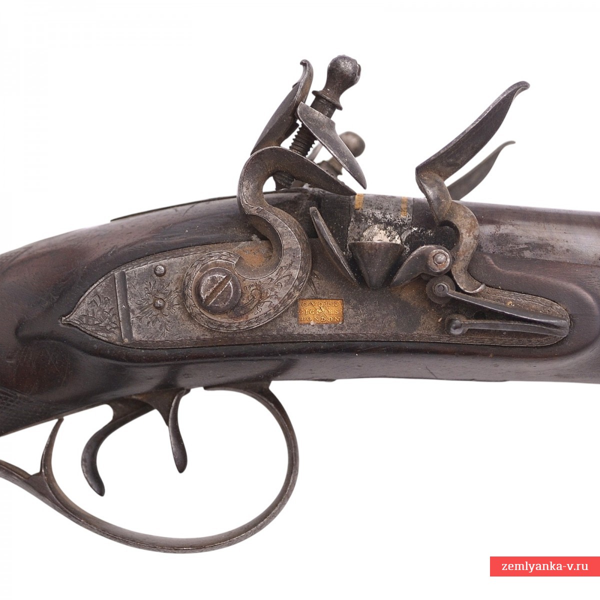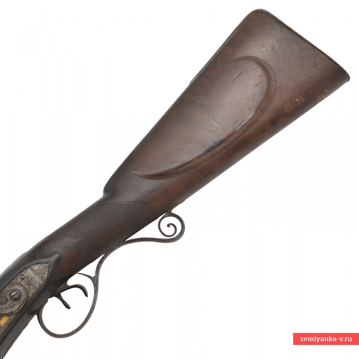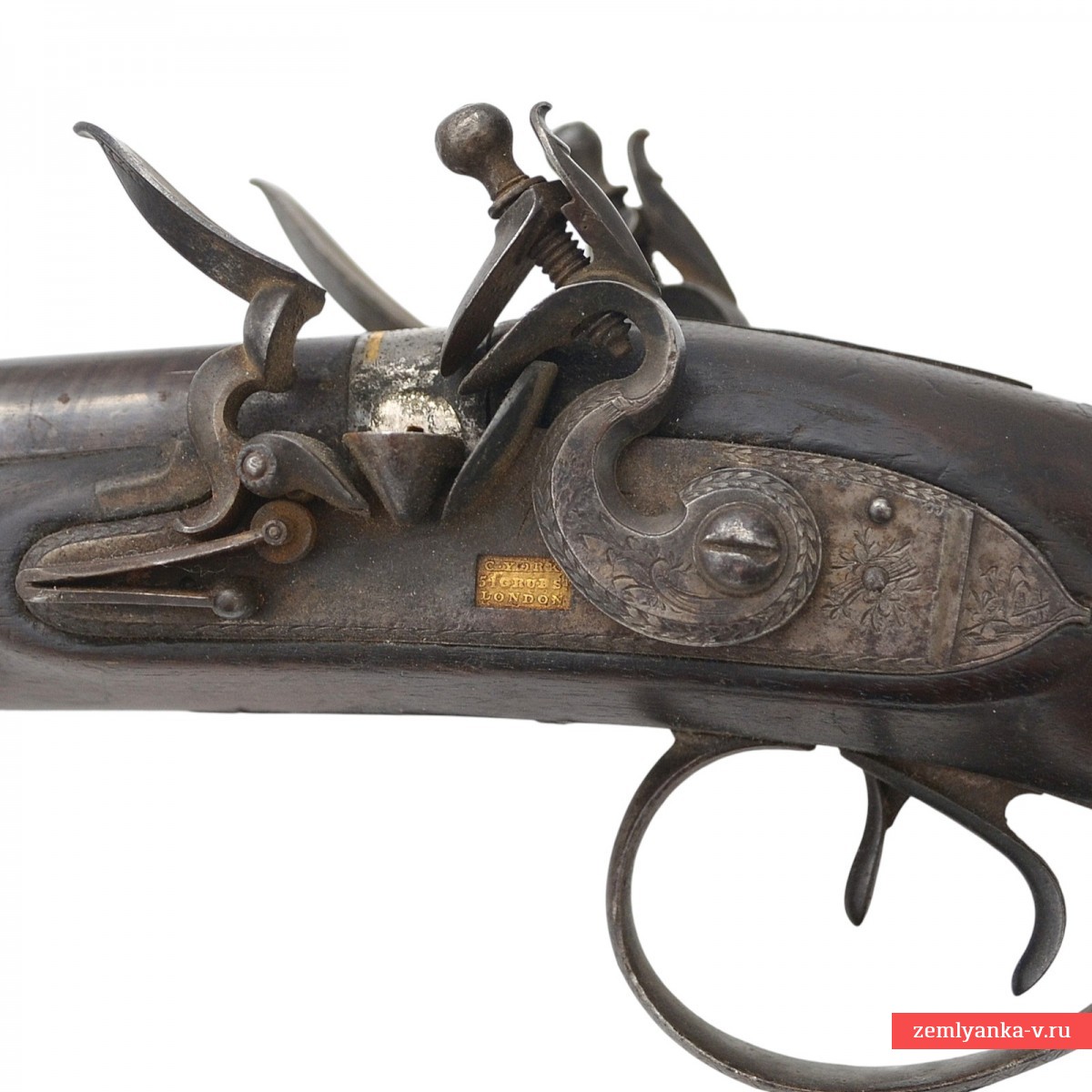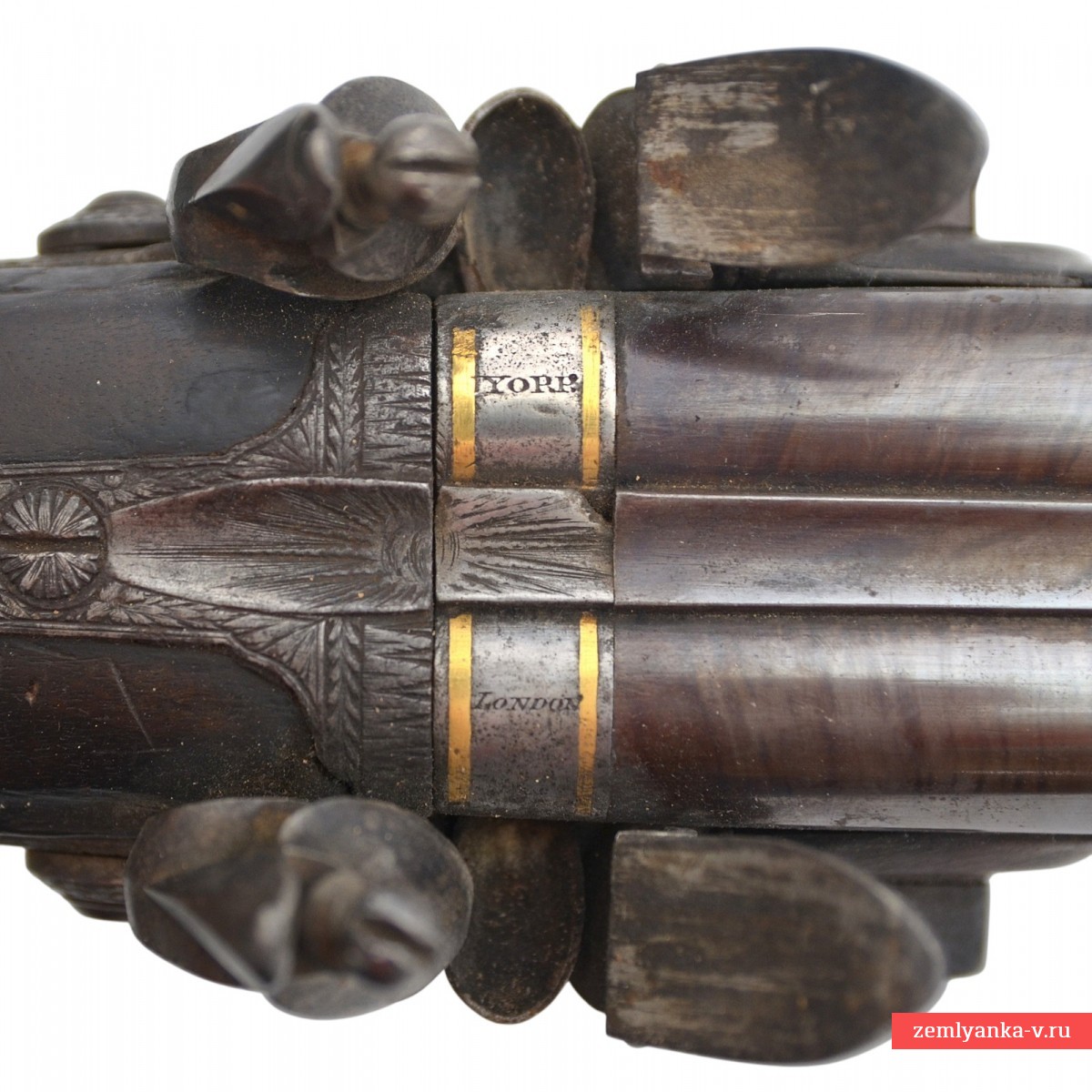 Оригинальное ружье в прекрасном коллекционном состоянии. Ружье имеет 2 круглых ствола, изготовленных из красивого полосного дамаска. Каналы гладкие. Замки кремневые, французского батарейного типа. Такой тип замка был создан в 1610 г. французским оружейником из Лизье (Нормандия) Марэн Ле Буржуа (1550—1634) гг. Он был на порядок надежнее колесцового, благодаря чему распространился по всему миру на следующие три столетия, как основной механизм ручного огнестрельного оружия. Чтобы подготовить такой замок к выстрелу, стрелок был должен (зарядив собственно оружие, то есть, забив в ствол пороховой заряд, пулю и пыж) поставить курок на предохранительный взвод; открыть крышку полки; если нужно, прочистить затравочное отверстие; насыпать на полку небольшую порцию пороха; закрыть крышку; поставить курок на боевой взвод. На замочных досках в прямоугольных табличках пробиты идентичные клейма мастера, выполненные в виде надписи «C. York / 51 Grub. St. / London» (Charles York, работал в Лондоне (51 Grab str.) и Йорке в 1804-1825 гг). Ложа деревянная, гладкая, цевье на 2/5 ствола. Под стволами в цевье вложен шомпол. Приклад со щекой. Гарантия подлинности.